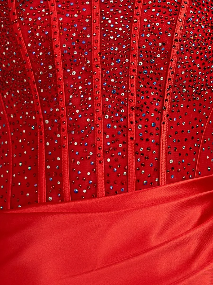 Make a statement in this vibrant red satin homecoming dress featuring a chic scoop neckline and body-hugging bodycon design that radiates confidence. Adorned with elegant beadings and a playful slit, this dress is perfect for homecoming, parties, or cocktail events. Feel fabulous and look stunning with the adjustable lace-up back providing a personalized fit. Available in multiple sizes.