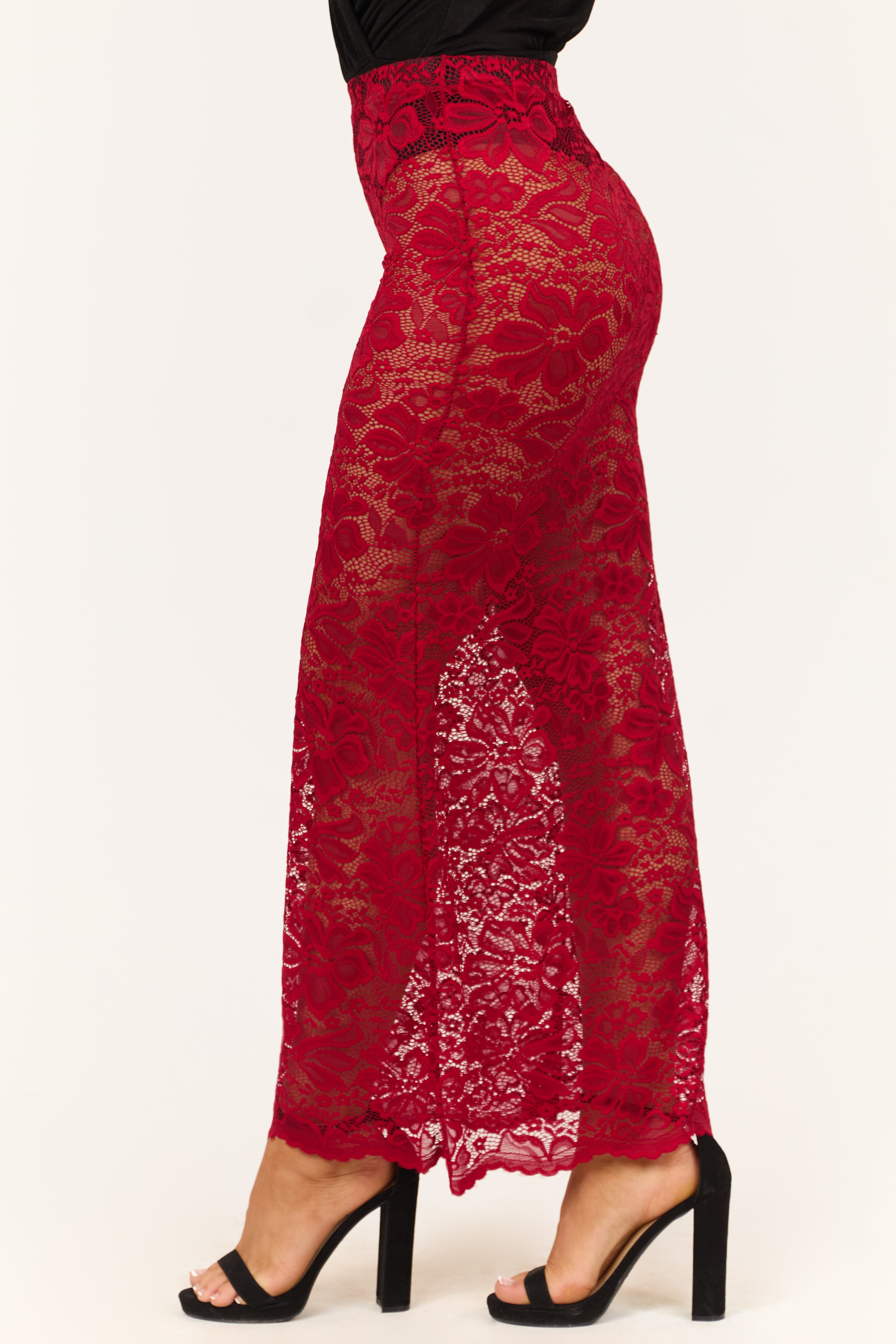 Indulge in the elegance of our Red Sheer Floral Lace Maxi Skirt, available in sizes S, M, and L. Designed with semi-stretchy lace and an elastic waistband for a comfortable fit. This unlined skirt in 95% Polyester and 5% Spandex offers a slight flare silhouette, measuring between 37.5″ to 38.5″ in length. Perfect for various occasions, this imported skirt can be machine washed cold with like colors. Look effortlessly chic by pairing it with your favorite top or blouse. Get yours today!