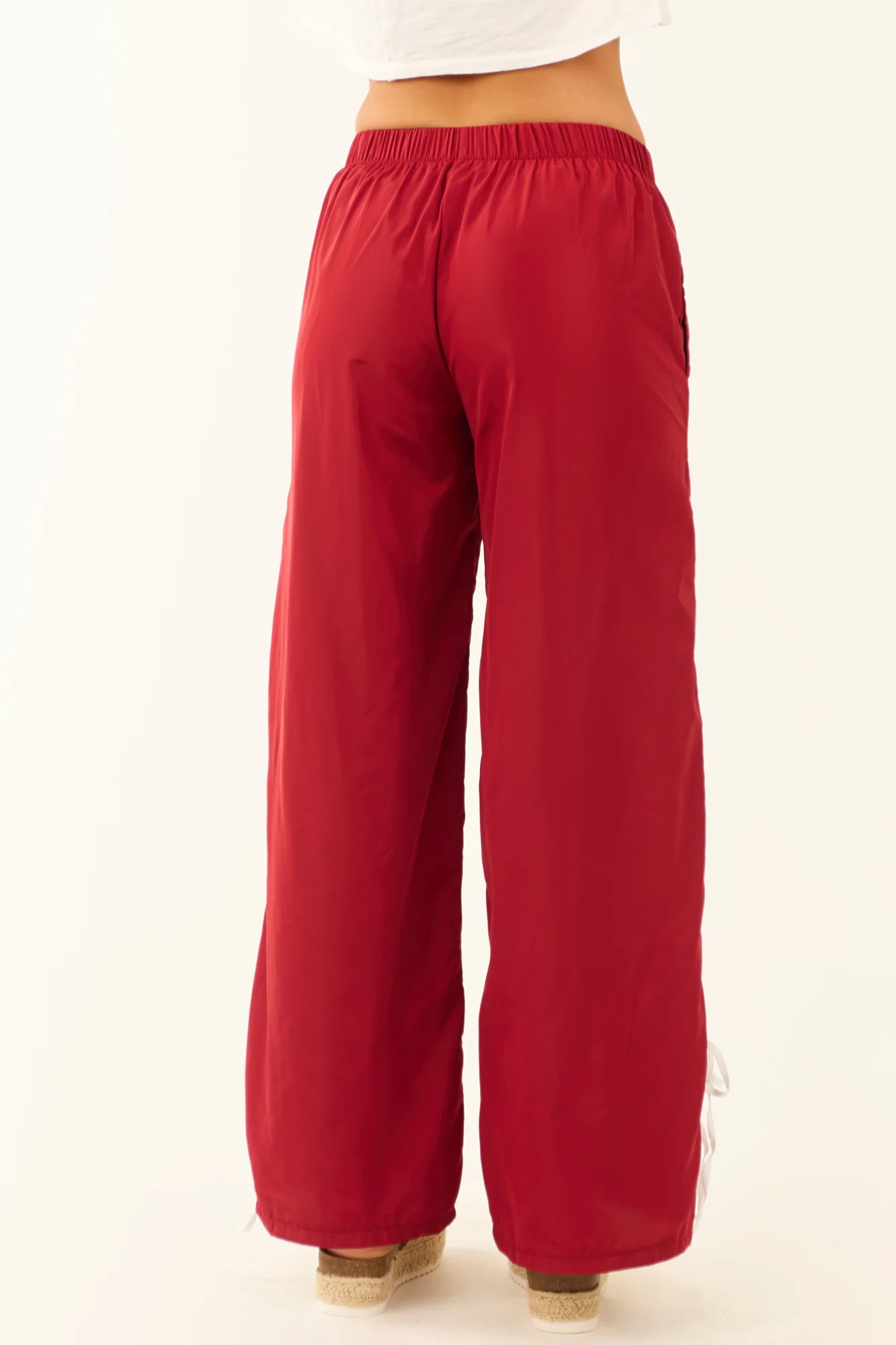 Experience comfort and style with our Red Side Striped Wide Leg Track Pants. Crafted from 100% Polyester, these pants feature a non-stretchy woven fabric with an off-white ribbon tie detail at the bottom of the stripes. The elastic waistband and side pockets add functionality to the design. Perfect for various seasons, these pants are versatile and trendy. Ideal for casual outings or lounging at home. Care instructions: Hand wash cold, hang to dry.