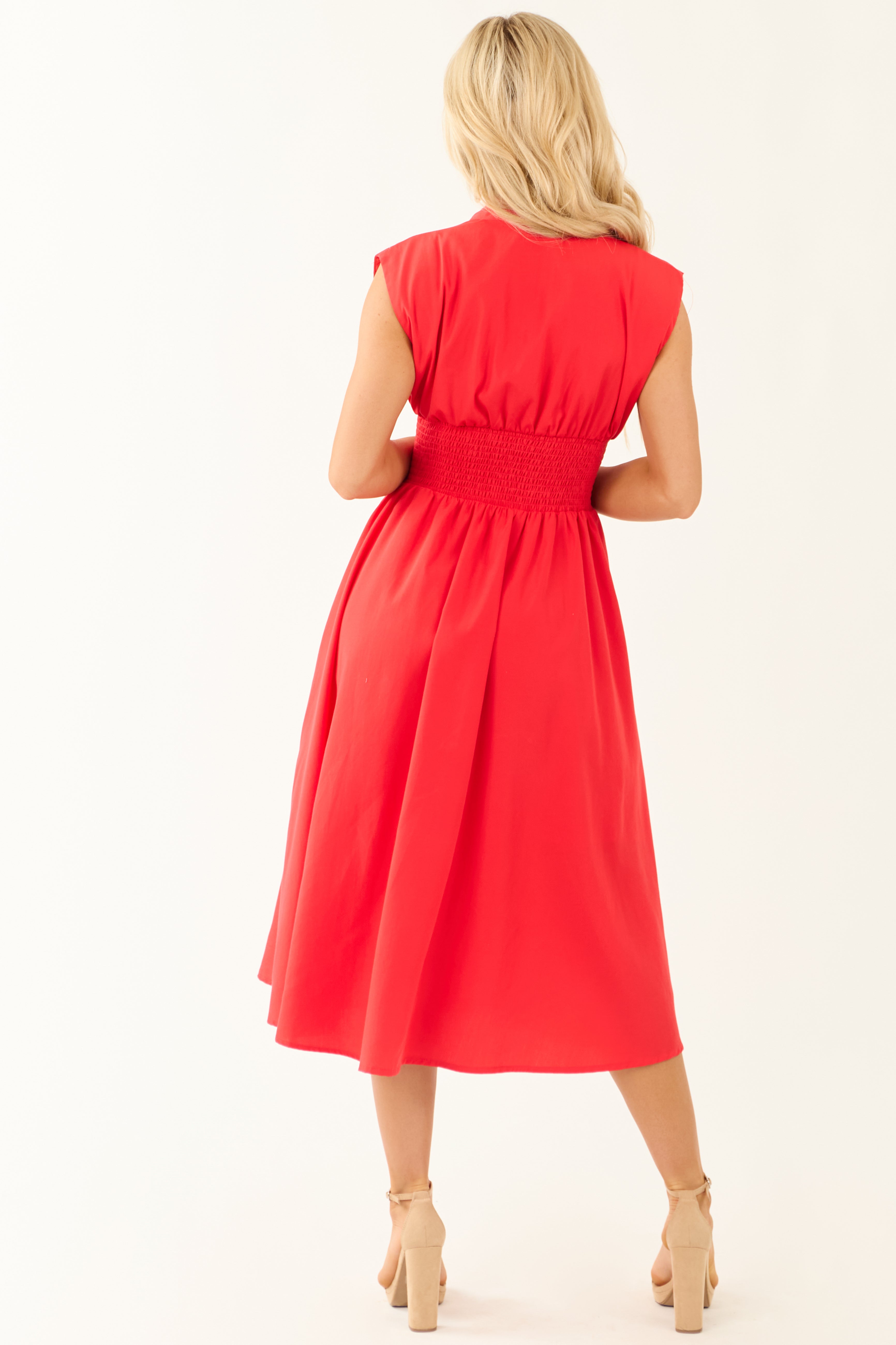 Embrace your inner boldness with this red sleeveless midi dress featuring a lipstick print. Effortlessly fierce and flirty, the curve-loving fit, and attention-commanding color make this dress a standout piece. It zips up the drama with a gold zipper at the front, showcases a smocked waist, and includes convenient side pockets. Made from a non-stretchy cotton blend, this dress is lined with 100% Rayon for added comfort. Ideal for various occasions, this dress is a true statement maker. Garment specifications for size small: Bust – 36″, Waist – 26″, Length – 47″. Imported. Available in sizes XS-XL.