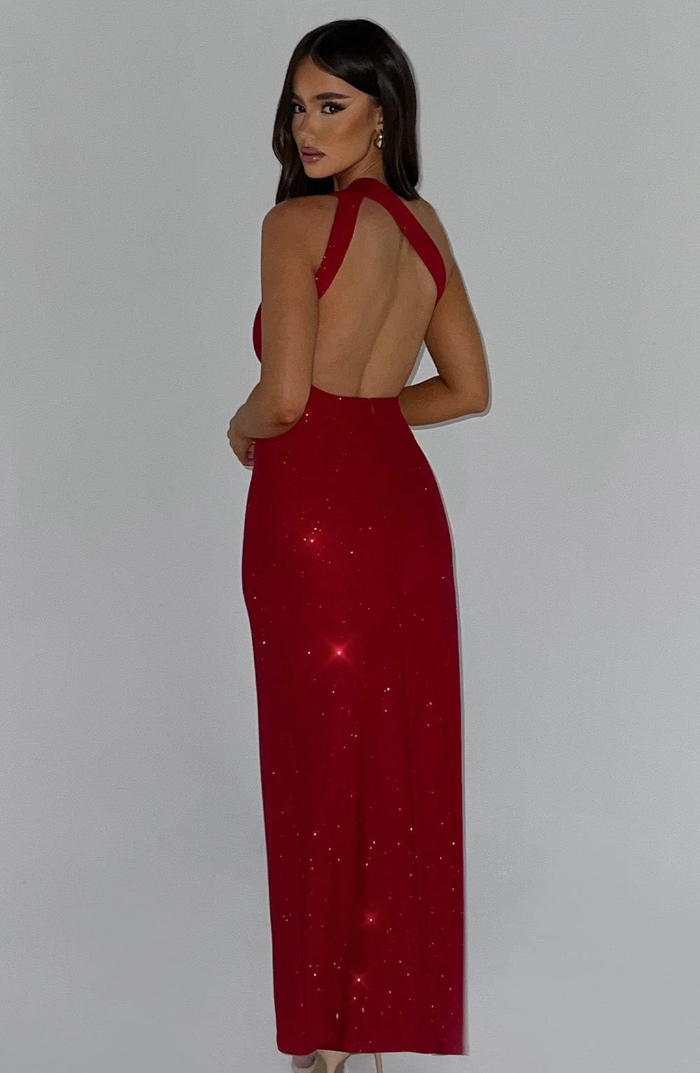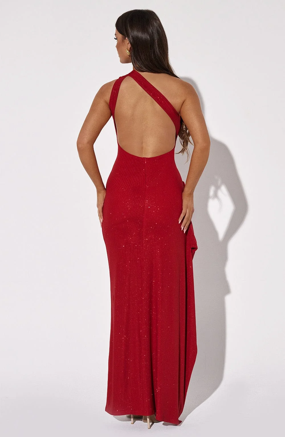 Make a grand entrance wearing the Red Sparkle One Shoulder Maxi Dress. Crafted from luxurious double stretch mesh, this dress hugs your curves elegantly. Featuring a thigh-high split, ruched details, and a stunning backless design, its perfect for formal events. The one shoulder strap adds a touch of sophistication while the premium double-layered fabric ensures a flawless fit. Feel like a star in this showstopper. Available in XS, S, M, L, XL, XXL sizes.