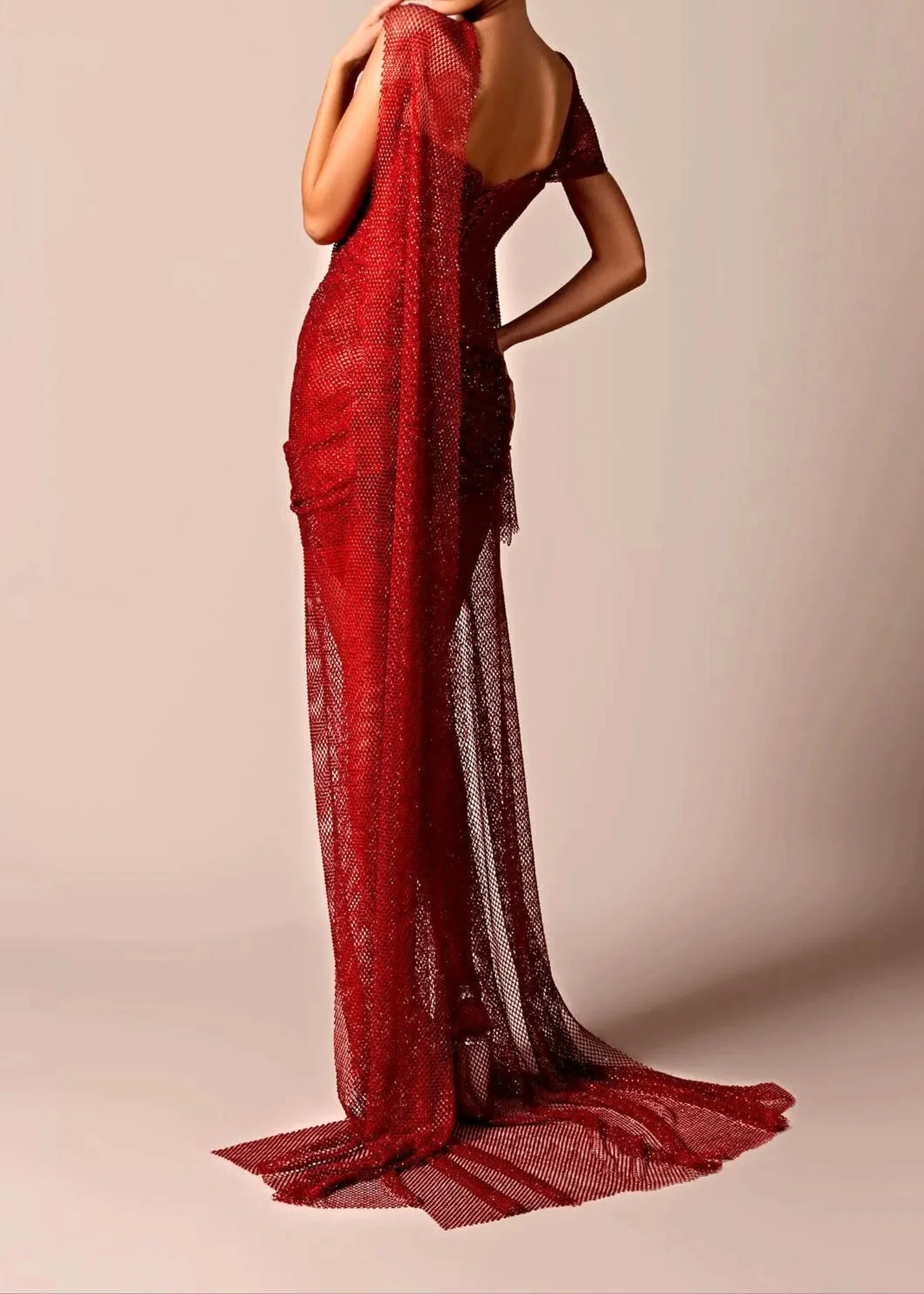 This stunning red maxi dress features an elegant one-shoulder design with sparkly fabric, a draped silhouette, and a concealed zipper at the back. Made of high-quality polyester and cotton blend, this dress is durable and meticulously crafted with YKK zipper for reliability. Carefully sewn for lasting quality. Color variations may occur due to lighting, but the product images without a model provide the truest representation. True to size following our size chart for the perfect fit. Embrace sophistication and allure with this radiant dress that complements your beauty effortlessly.