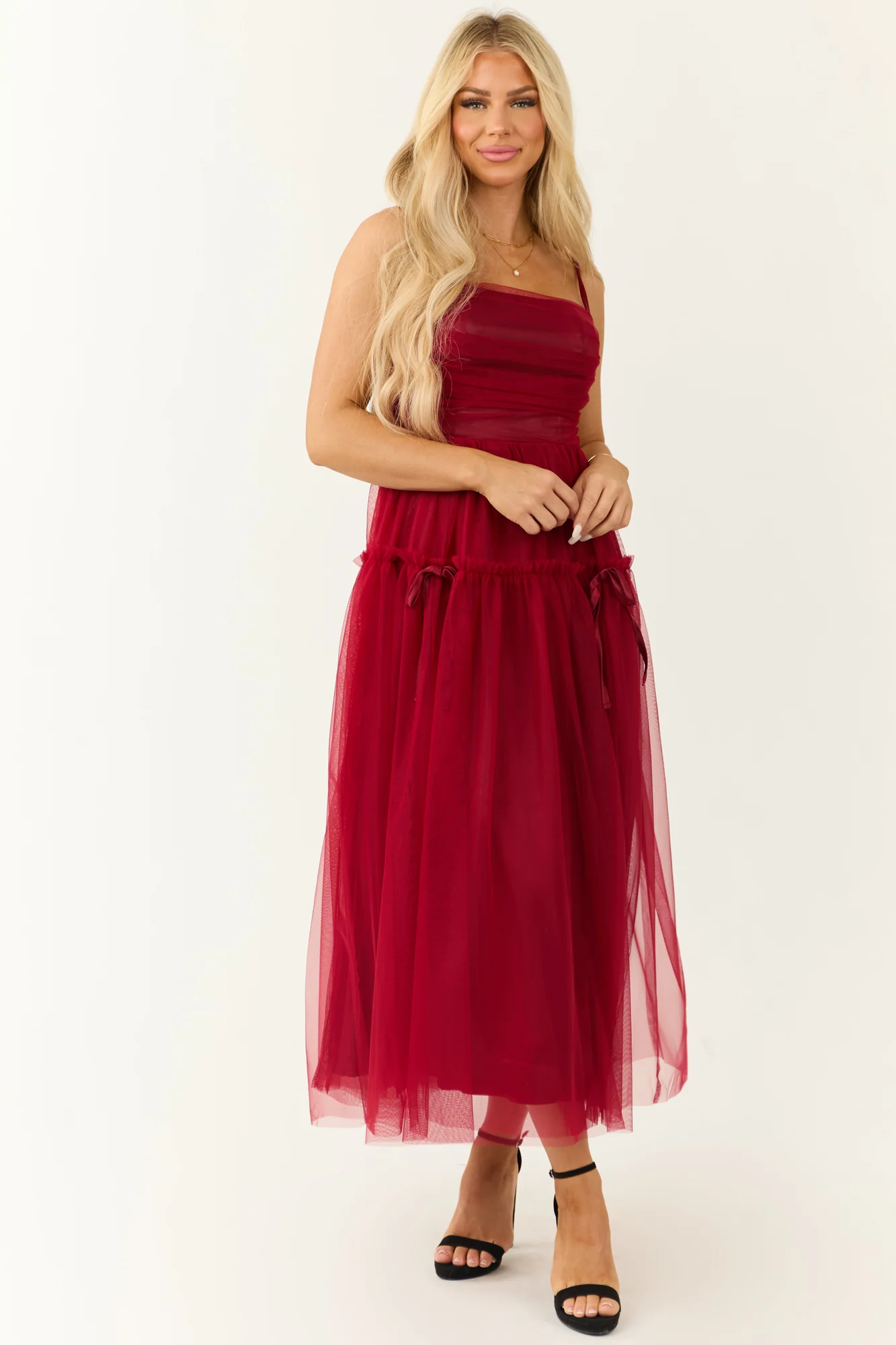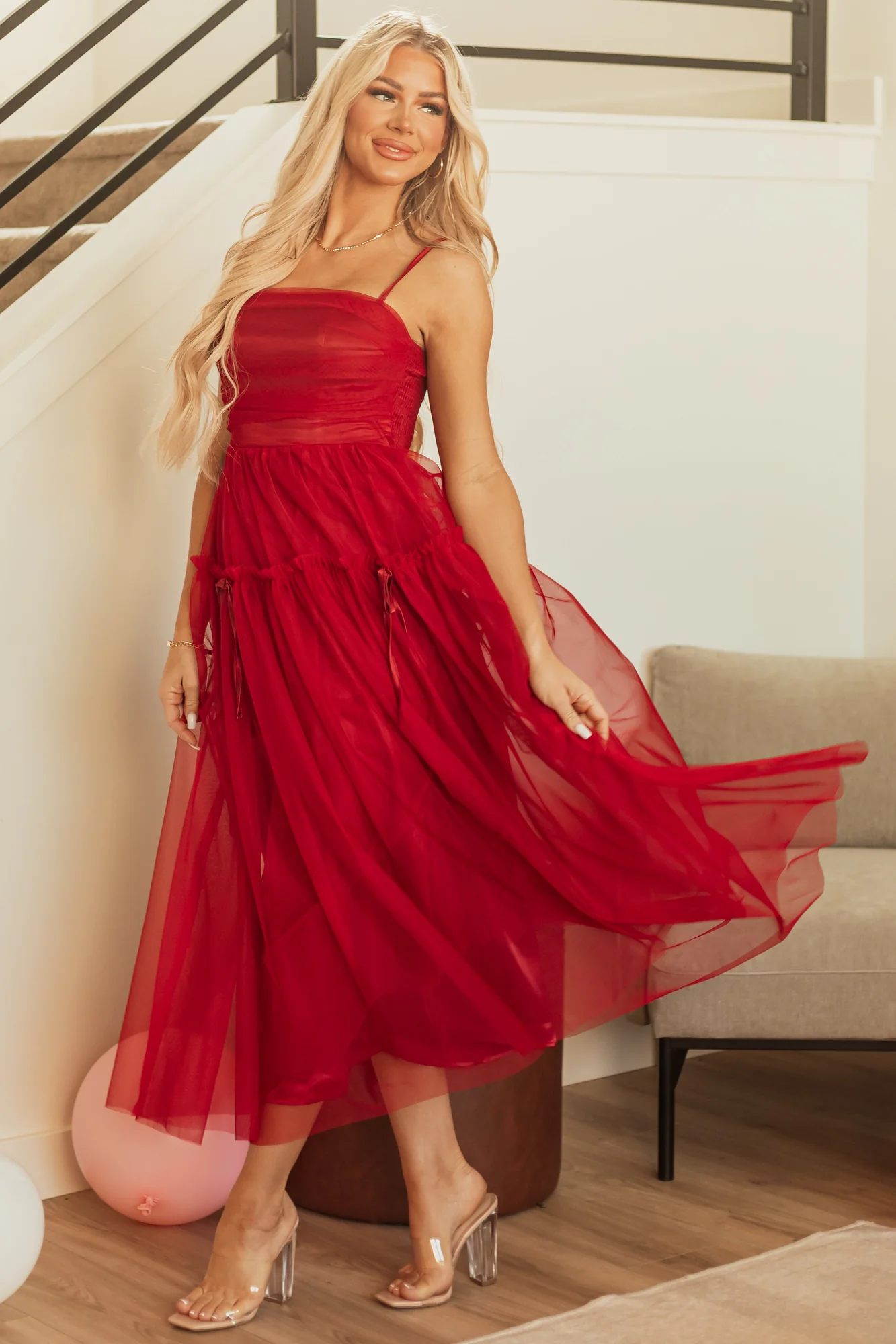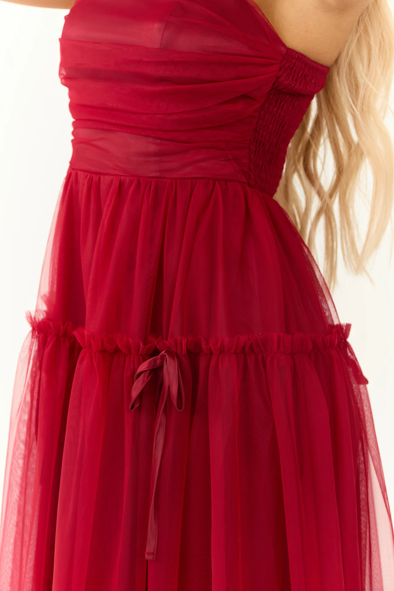 Indulge in elegance with our Red Square Neck Ruched Maxi Dress, available in S, M, and L sizes. Designed for a flawless fit, this dress features adjustable straps, pleated bust, and bow tie details for a sophisticated look. Crafted from high-quality materials, this dress ensures comfort and style with a flowy non-stretchy tulle fabric. Perfect for a variety of occasions, from casual to formal events. Care Instructions: Hand wash in cold water, do not bleach, line dry, iron on low. Model is wearing a size Small. Model’s Profile: Size 1, Height 57″, Bust 34″, Waist 26″.