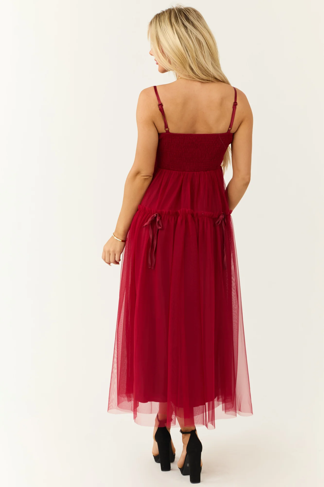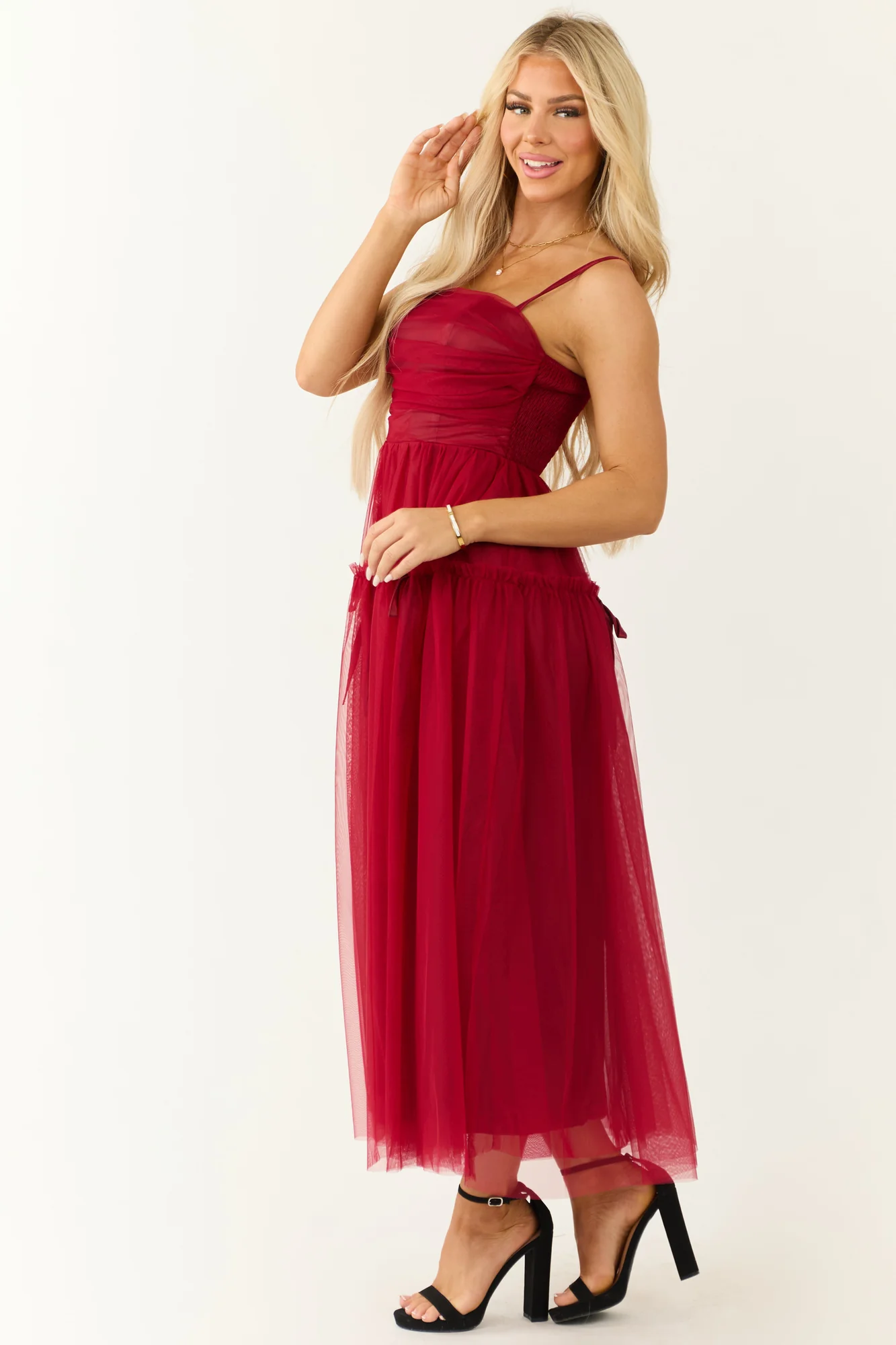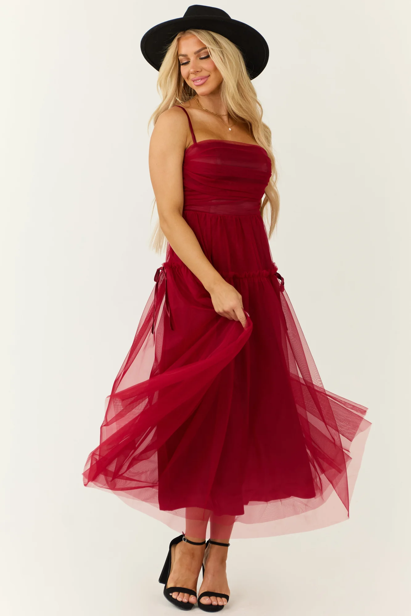 Indulge in elegance with our Red Square Neck Ruched Maxi Dress, available in S, M, and L sizes. Designed for a flawless fit, this dress features adjustable straps, pleated bust, and bow tie details for a sophisticated look. Crafted from high-quality materials, this dress ensures comfort and style with a flowy non-stretchy tulle fabric. Perfect for a variety of occasions, from casual to formal events. Care Instructions: Hand wash in cold water, do not bleach, line dry, iron on low. Model is wearing a size Small. Model’s Profile: Size 1, Height 57″, Bust 34″, Waist 26″.