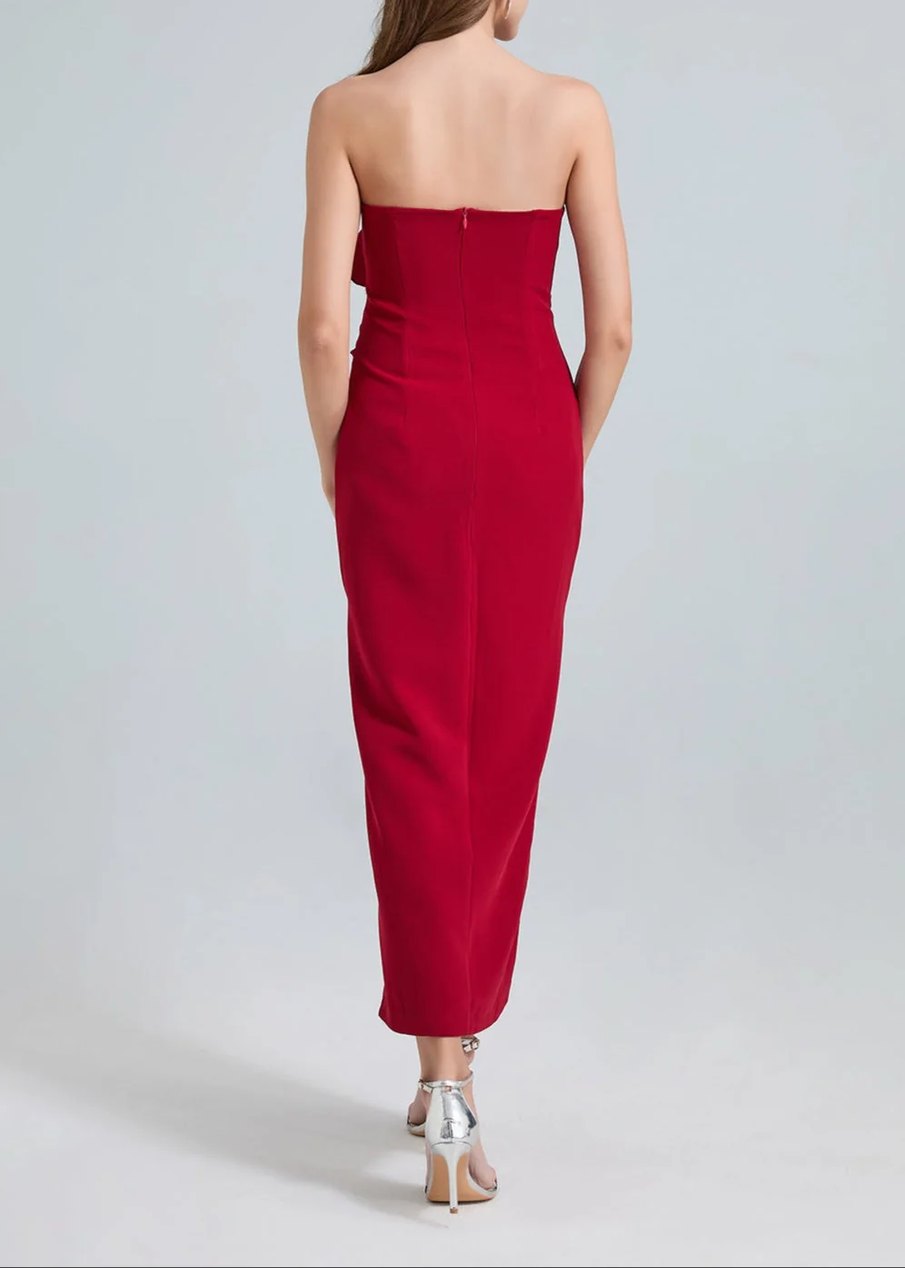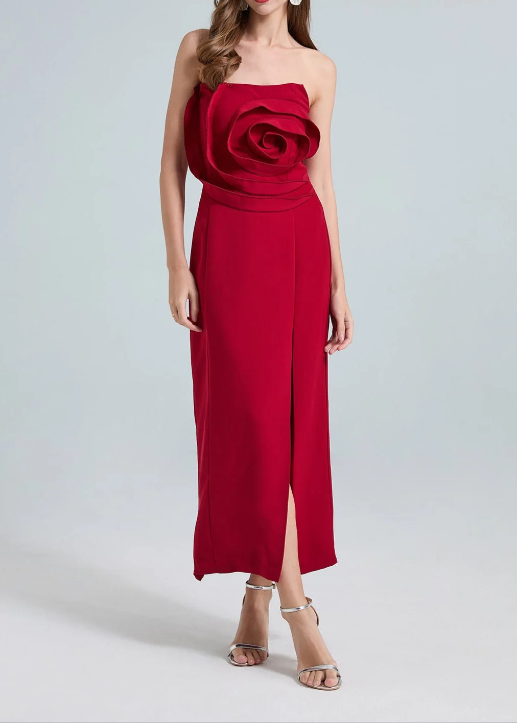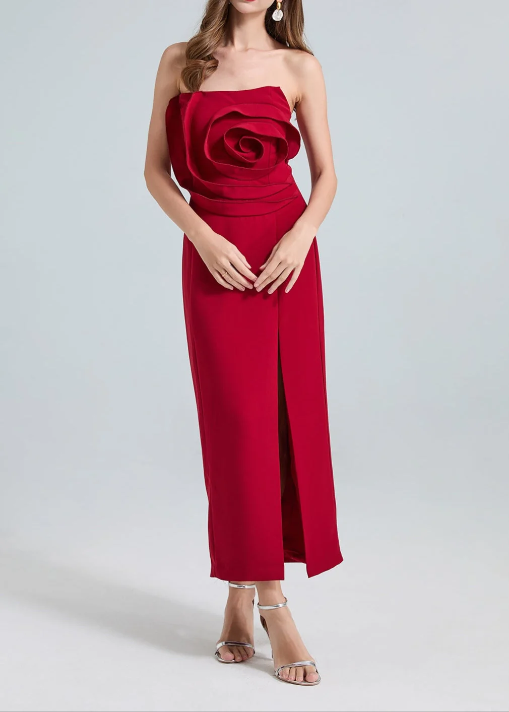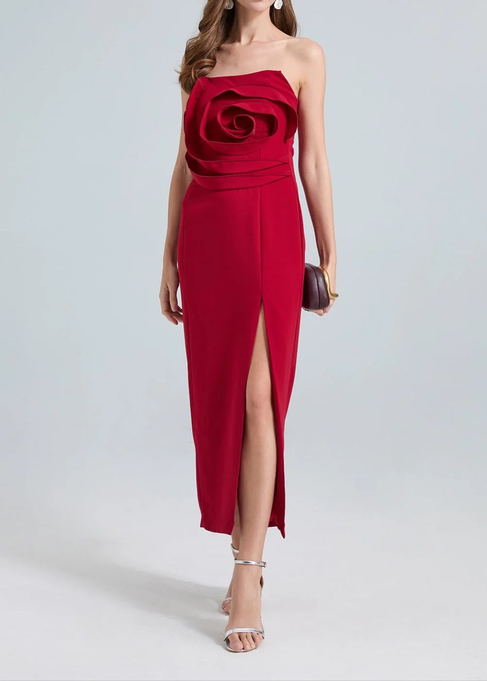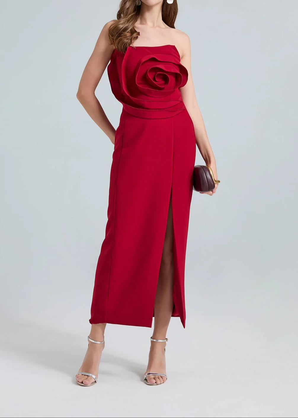 Dress to impress in the stunning red strapless 3D floral midi dress. Crafted with intricate 3D floral details, this dress exudes elegance and sophistication. Made from high-quality 100% polyester for comfort and style. Features a backless design with a slit for added allure. Dry clean only. Available in various sizes for the perfect fit. Embrace luxury and finesse with this exquisite dress.