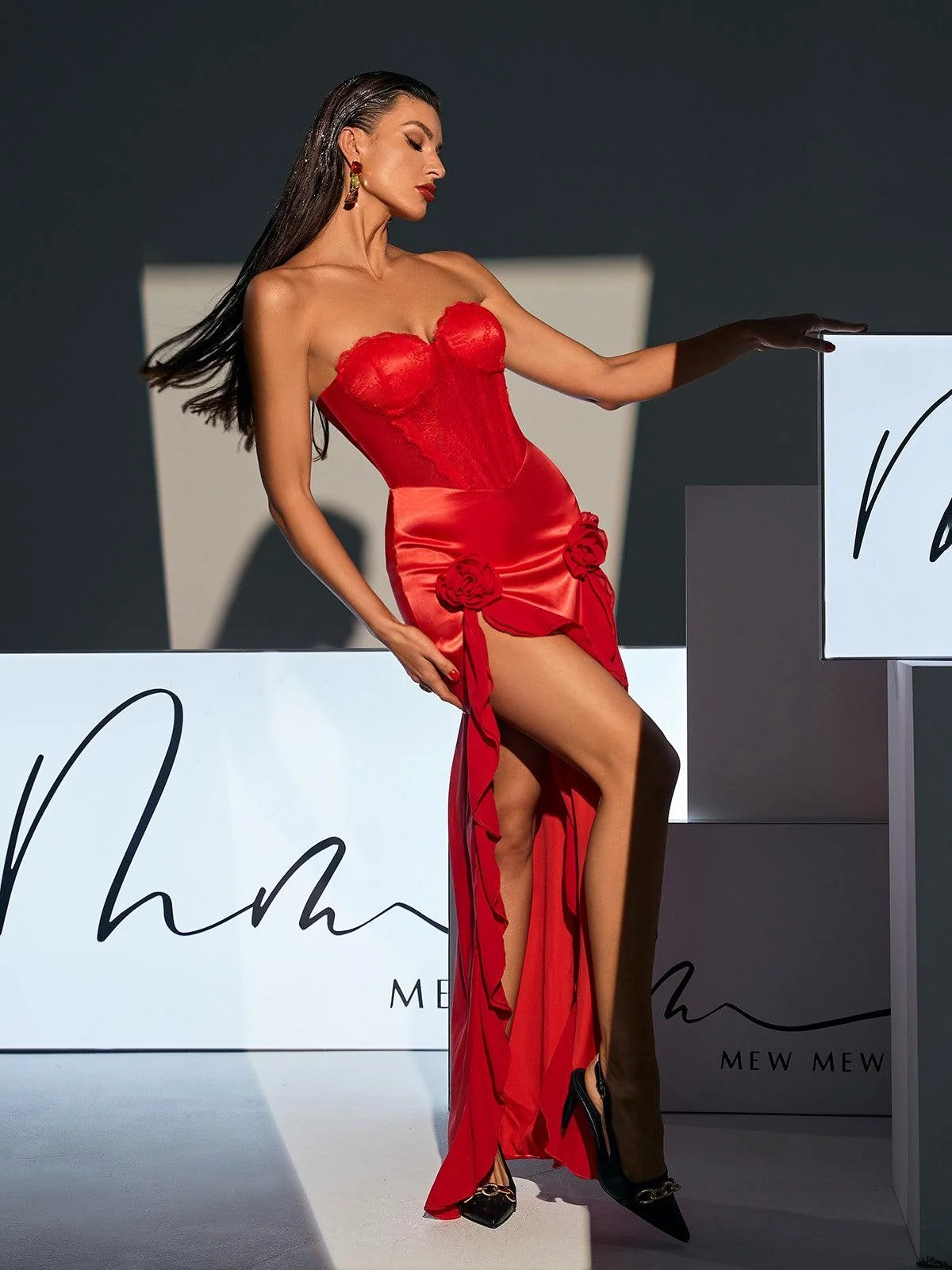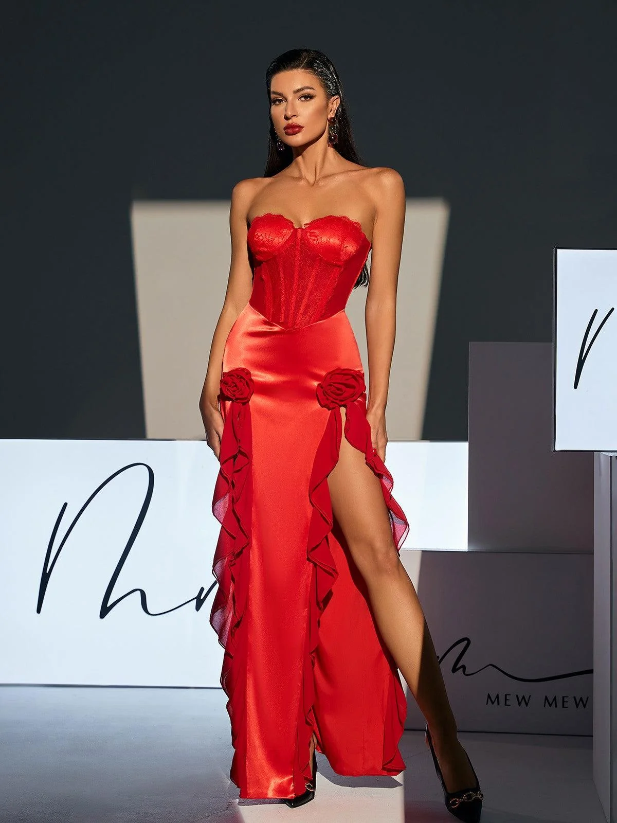 Indulge in sophistication with our Red Strapless Lace Tulle Maxi Dress. Expertly crafted with a stunning blend of lace and tulle in bold red, this dress features a flattering strapless neckline and flowing maxi length that enhances your silhouette. Made of 100% Polyester with slight stretch for comfort. Ideal for formal events, weddings, and special occasions. Experience the timeless elegance today!