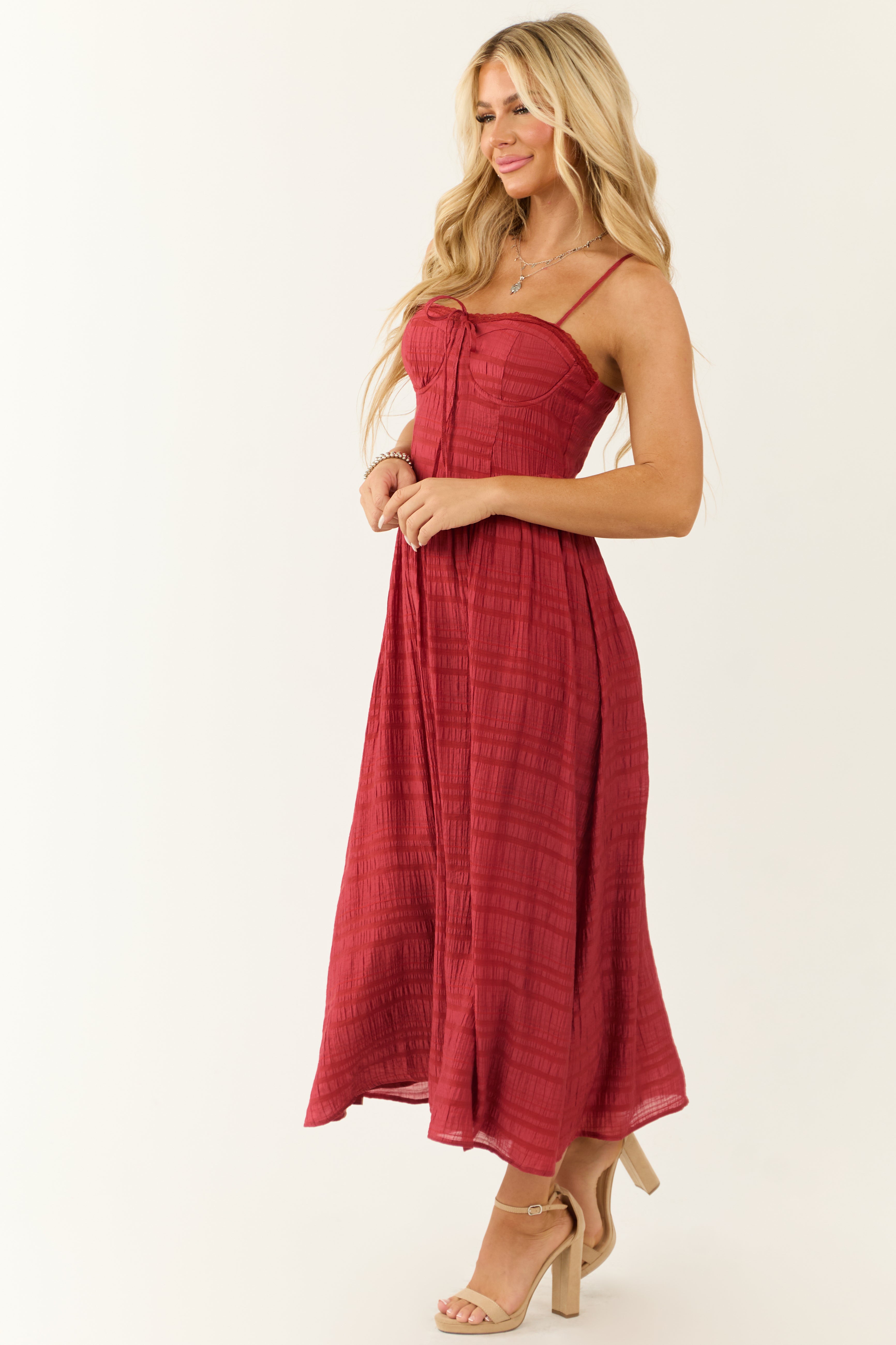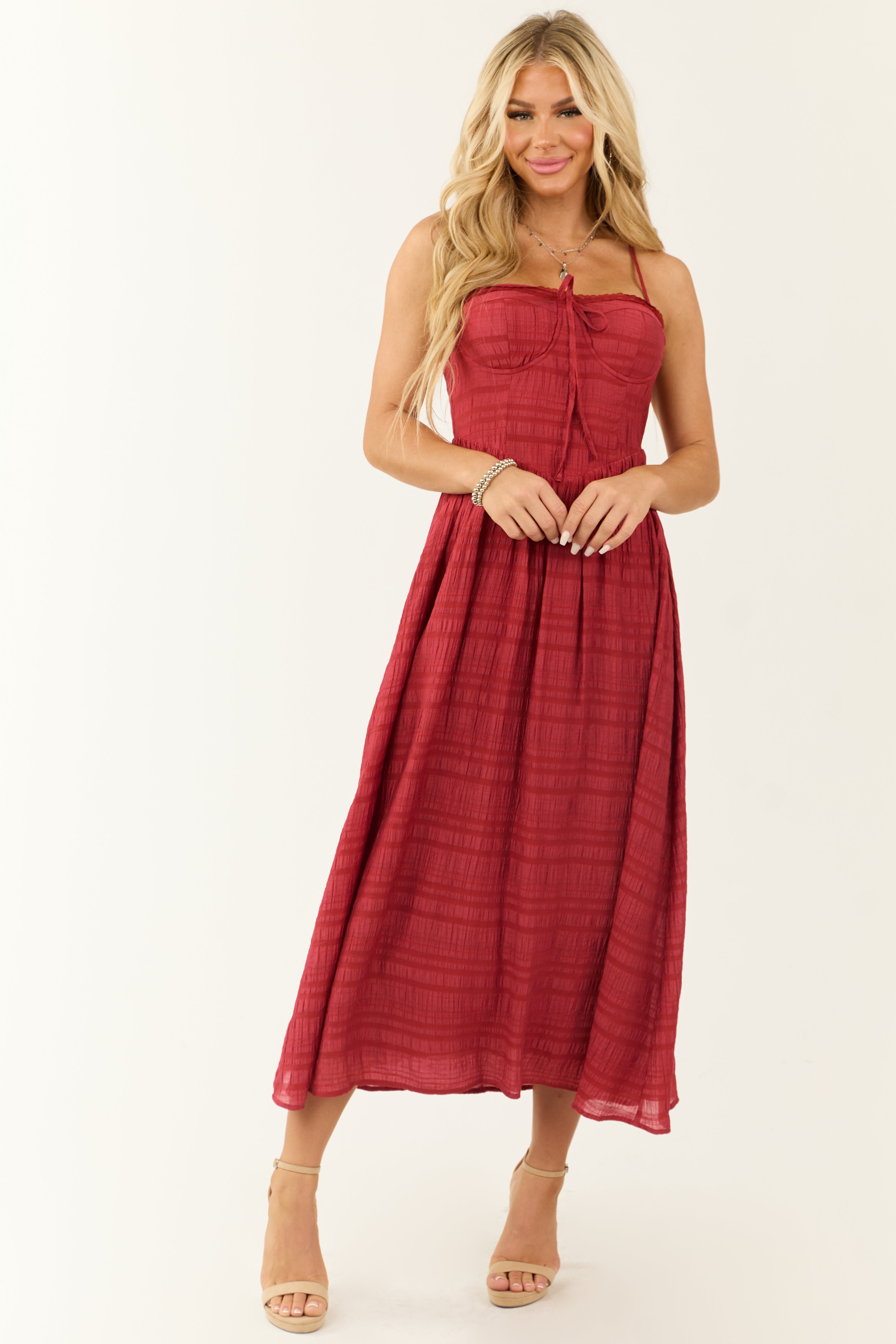 Indulge in elegance with our Red Textured Midi Dress. Ideal for date nights or going out, this strapless dress features adjustable spaghetti straps, a sweetheart neckline, and a bow detail on the front. The non-stretchy woven fabric with a lightly padded cups and lining offers a comfortable fit. Hand wash cold for maintenance. Get yours now!