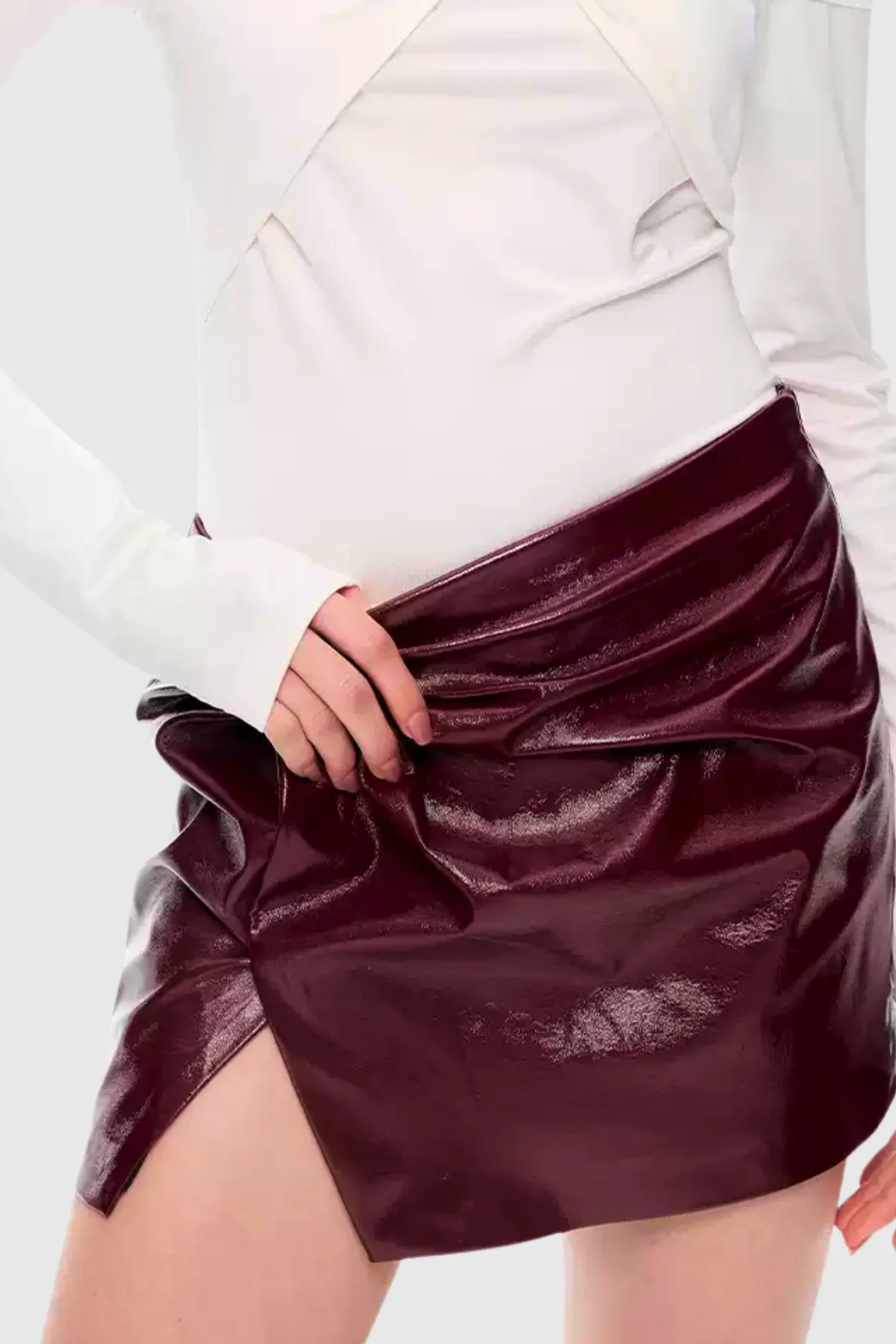 Elevate your wardrobe with the unique Red Twist Design Leather Mini Skirt. Crafted with a blend of 50% Polyester and 50% Cotton, this non-stretch skirt features ruched detailing for a flattering silhouette. Suitable for any occasion, this statement piece exudes elegance and style. Gentle machine wash recommended. Please note, color may vary due to lighting. Embrace sophistication with this chic essential .