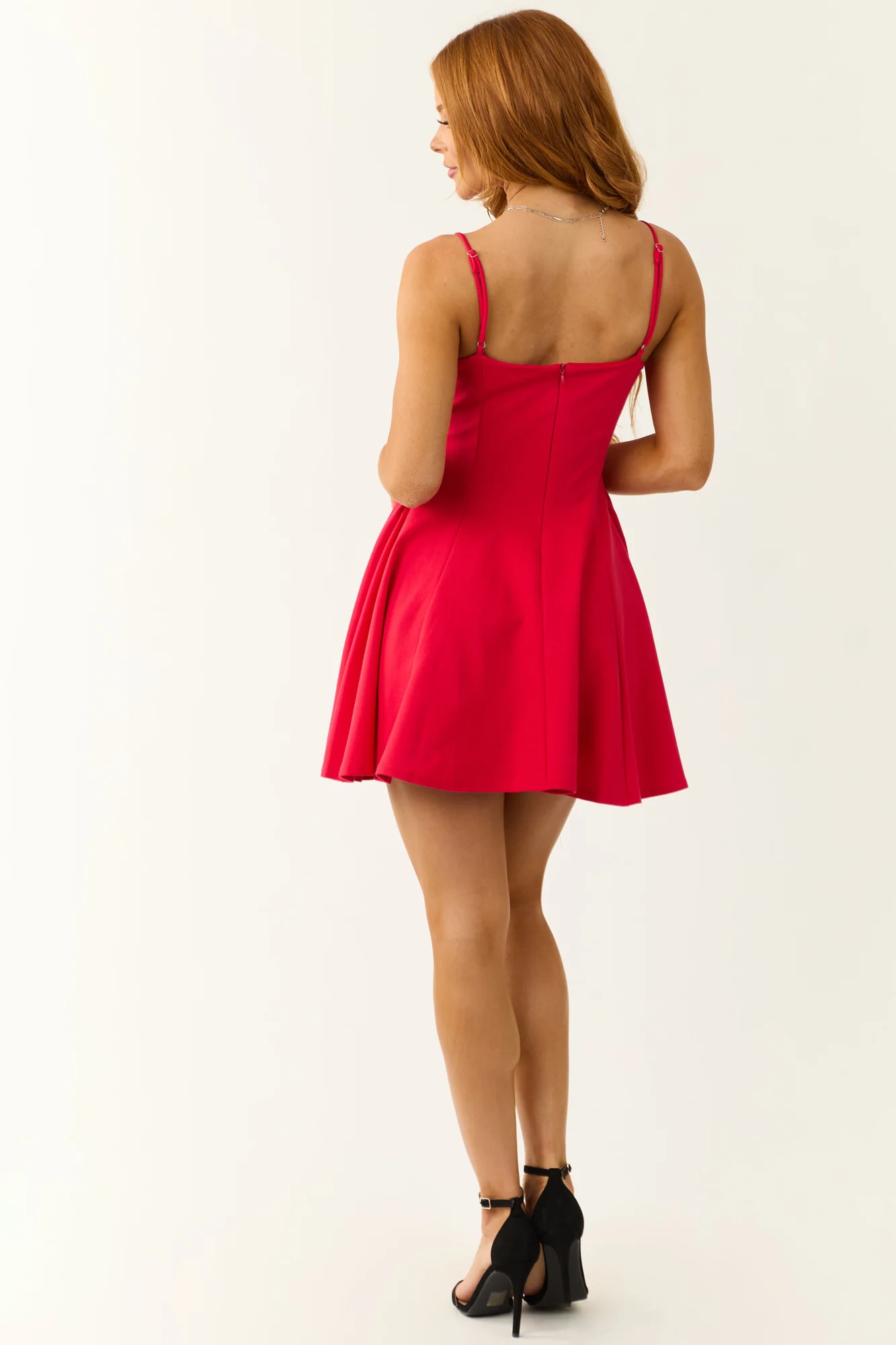 This sleeveless mini dress in crimson red offers a flattering fit in sizes S, M, and L. It features a V-neck, adjustable spaghetti straps, back zipper, and a lined bodice for comfort. The Flare skirt and stretchy knit provide both style and ease of movement. Crafted from 68% Rayon, 23% Nylon, and 9% Spandex with a 100% Polyester lining. Perfect for date night or going out, this dress adds a touch of elegance to your wardrobe. Hand wash cold, line dry, iron at low heat, do not bleach. Model is wearing a Small. Model’s Profile: Size 1, Height 55″, Bust 31″, Waist 24″