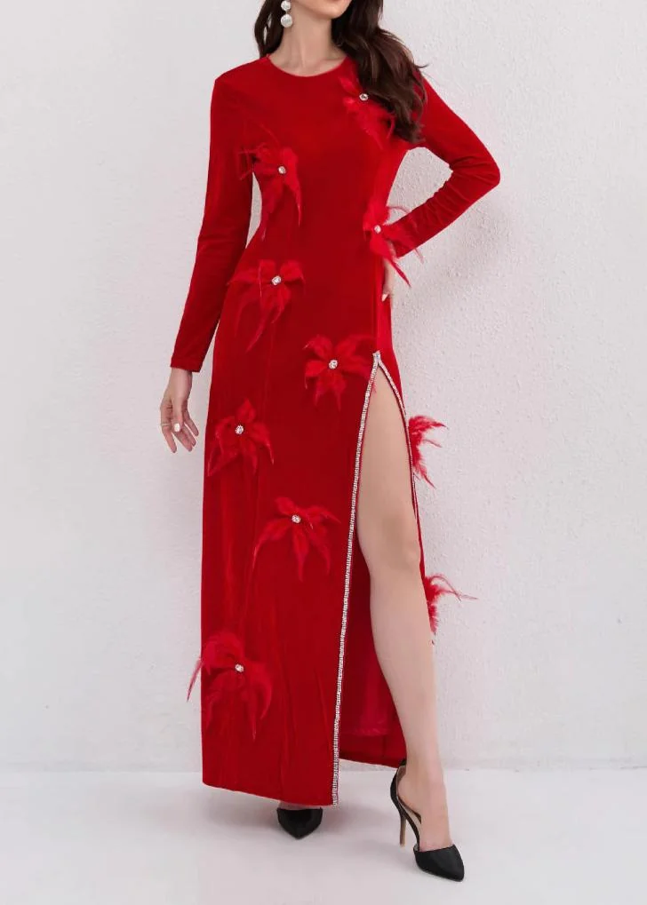 Elevate your style with our stunning Red Velvet 3D Feather Maxi Dress! This unique dress features a captivating 3D feather design on luxurious velvet fabric, making it a true statement piece. Perfect for any occasion, this playful yet stylish dress guarantees to turn heads. The crystal high slit adds a touch of glamour. Expertly crafted for the perfect fit, refer to our size chart. Embrace elegance and sophistication with this exquisite dress.