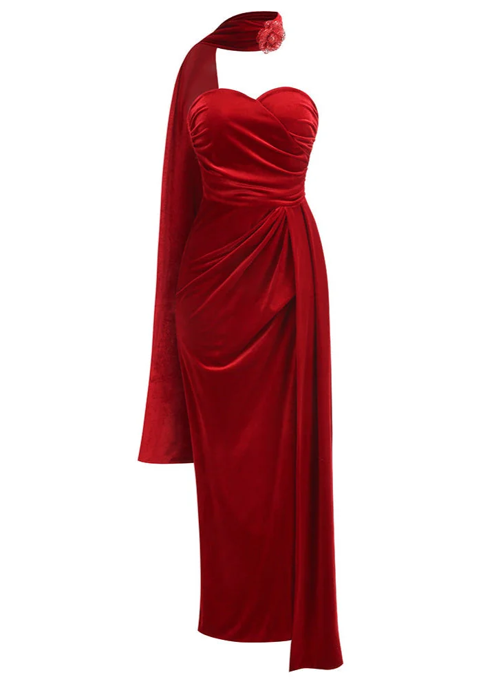 Make a stylish statement with our Red Velvet Floral Maxi Dress. Embrace its vibrant red color and delicate floral design, ideal for any event. This dress offers a comfortable, flattering fit that guarantees to captivate attention. Radiate confidence in every step you take with this versatile piece. Our dress is meant for dry clean only and may have slight color deviations due to photography lighting. The product images without the model are the closest representation of the actual product color. It fits true to size according to our size chart, so please refer to it for the perfect fit without sizing up or down.