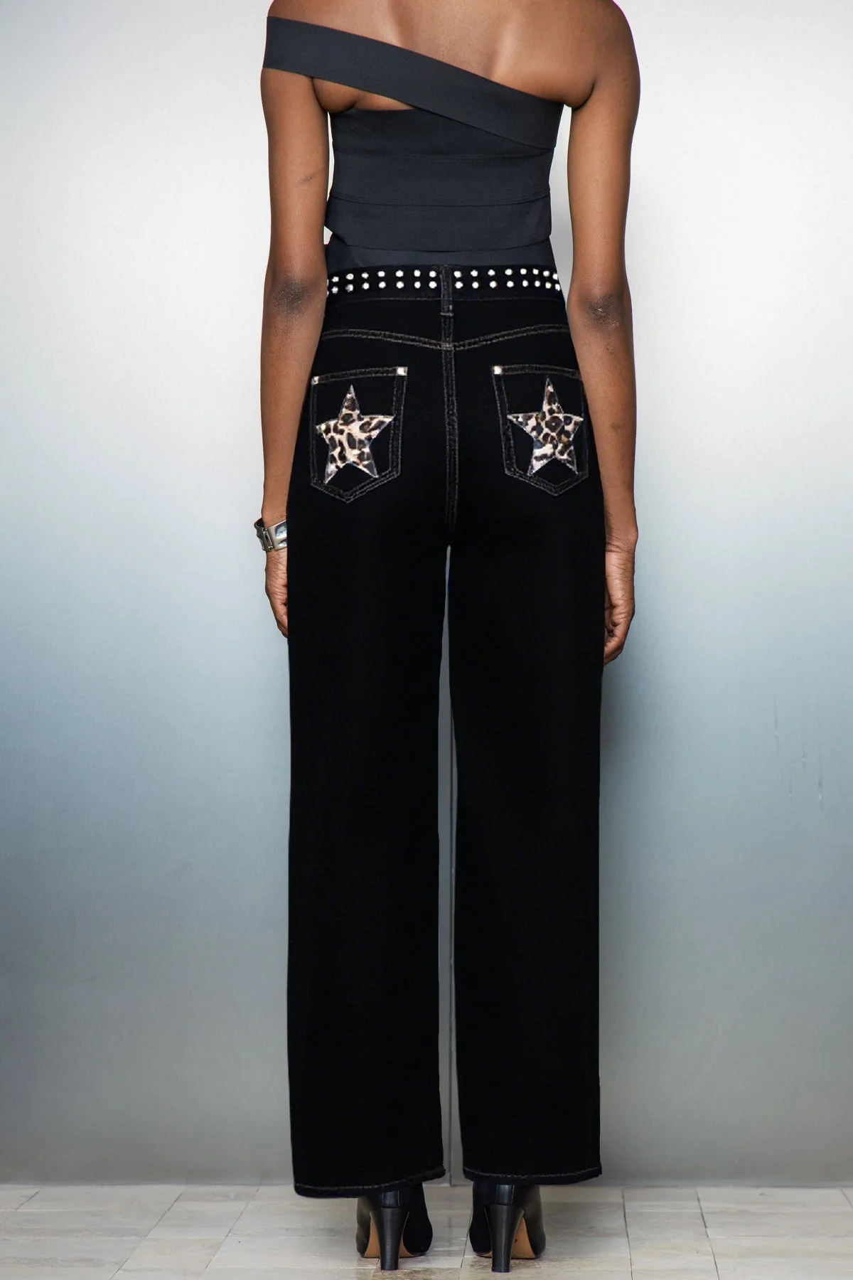 Discover sophistication and comfort with these Refined Star Embellished Wide-Leg Black Jeans. Exquisitely crafted from premium denim, these jeans feature a wide-leg silhouette for the ultimate ease of movement and style. The star embellishments provide a touch of elegance, elevating your look effortlessly. This durable wardrobe staple offers a flattering fit, ensuring both fashion and durability. The non-stretch design with gentle machine wash care adds convenience to your chic ensemble. Illuminate your style with these versatile black jeans.