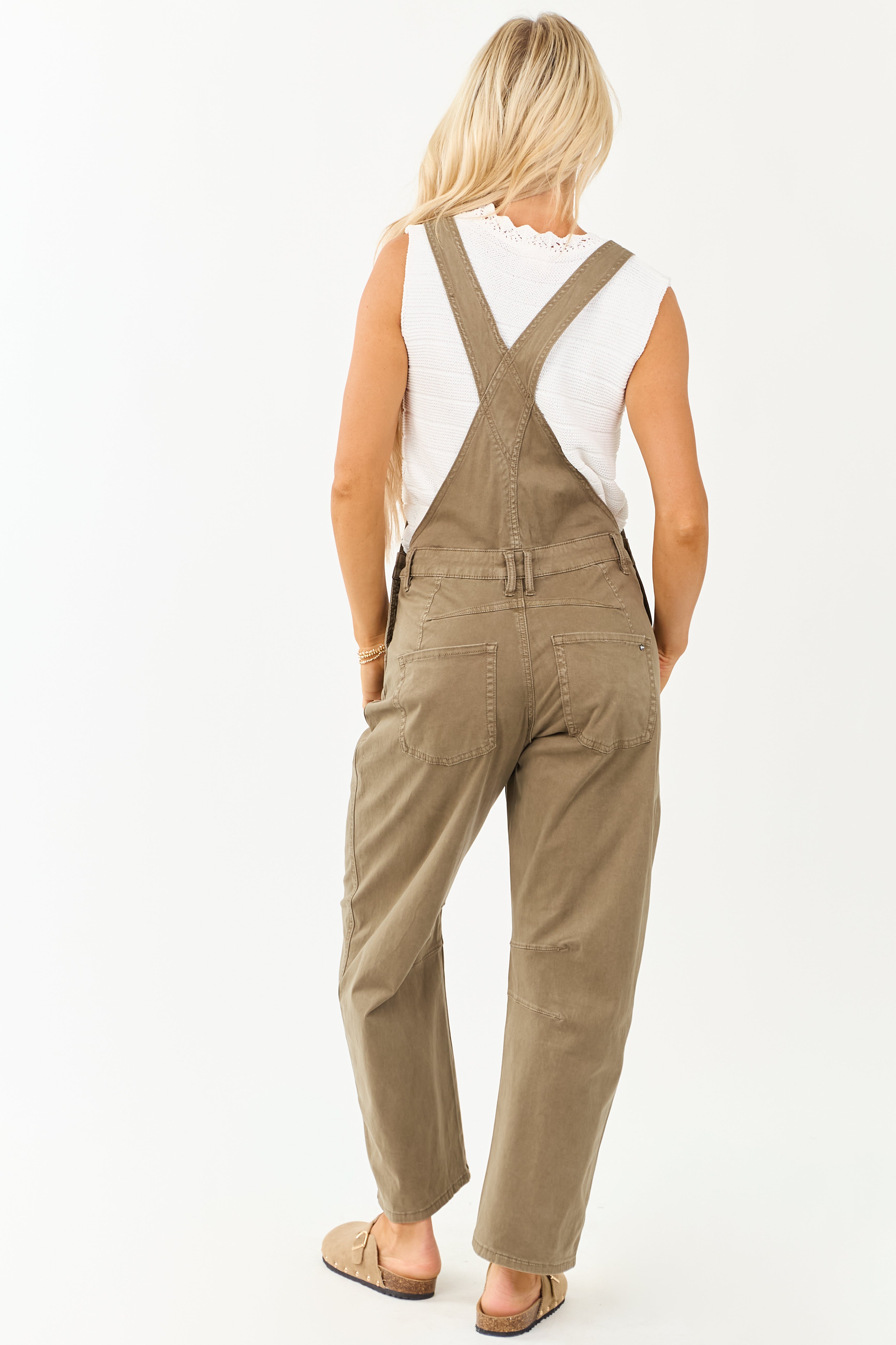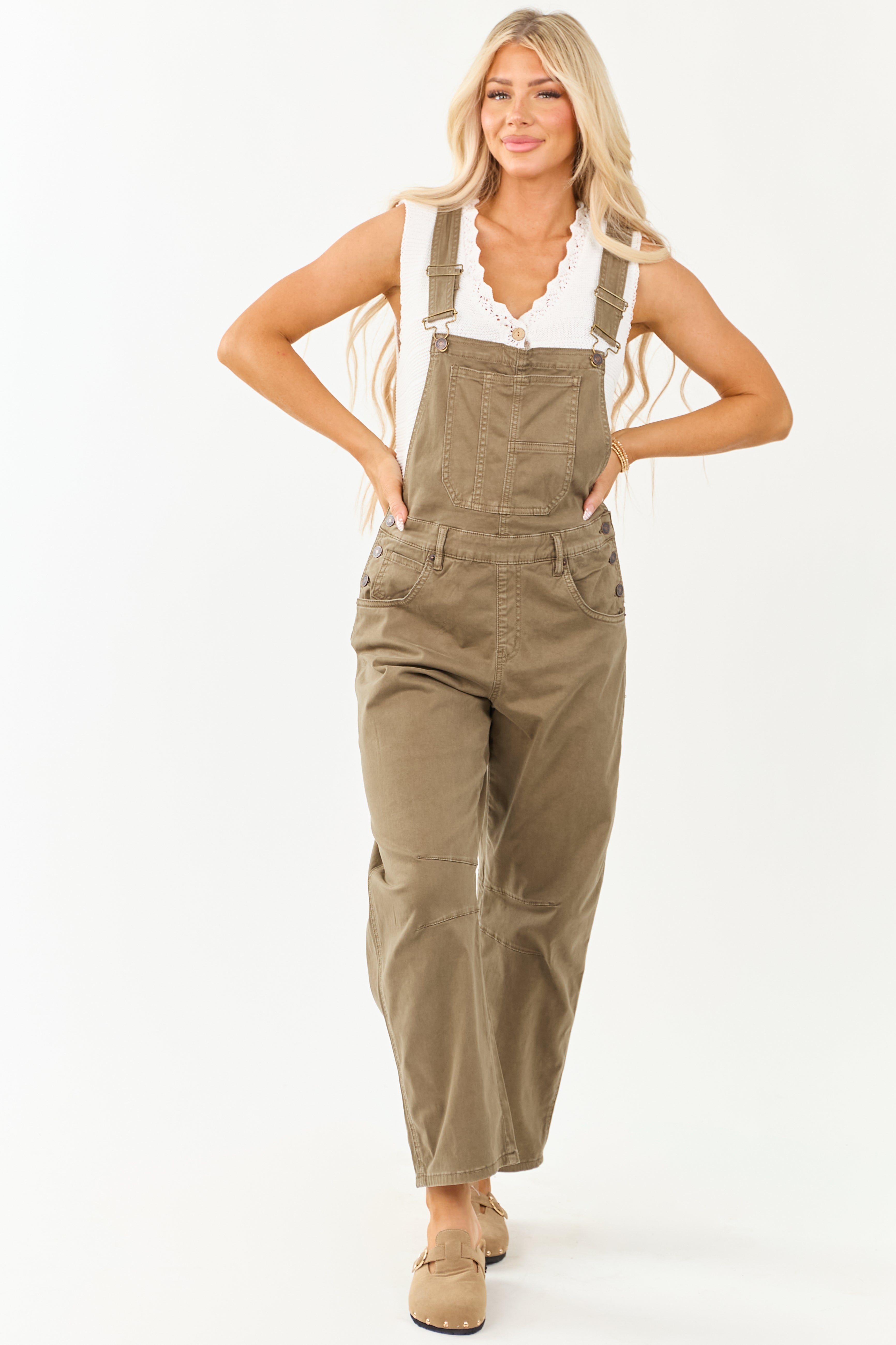 Experience comfort and style with our relaxed olive cotton blend overalls. Perfect for busy days, these soft overalls feature a loose fit, stretchy fabric, adjustable straps, six pockets, belt loops, and side buttons. Made of 68% Cotton, 29% Viscose, and 3% Spandex. Unlined. Inseam length of 27.5 inches. Available in sizes XS, S, M, L. Ideal for running errands or casual outings. Model is 57″ tall, wearing a size Small.
