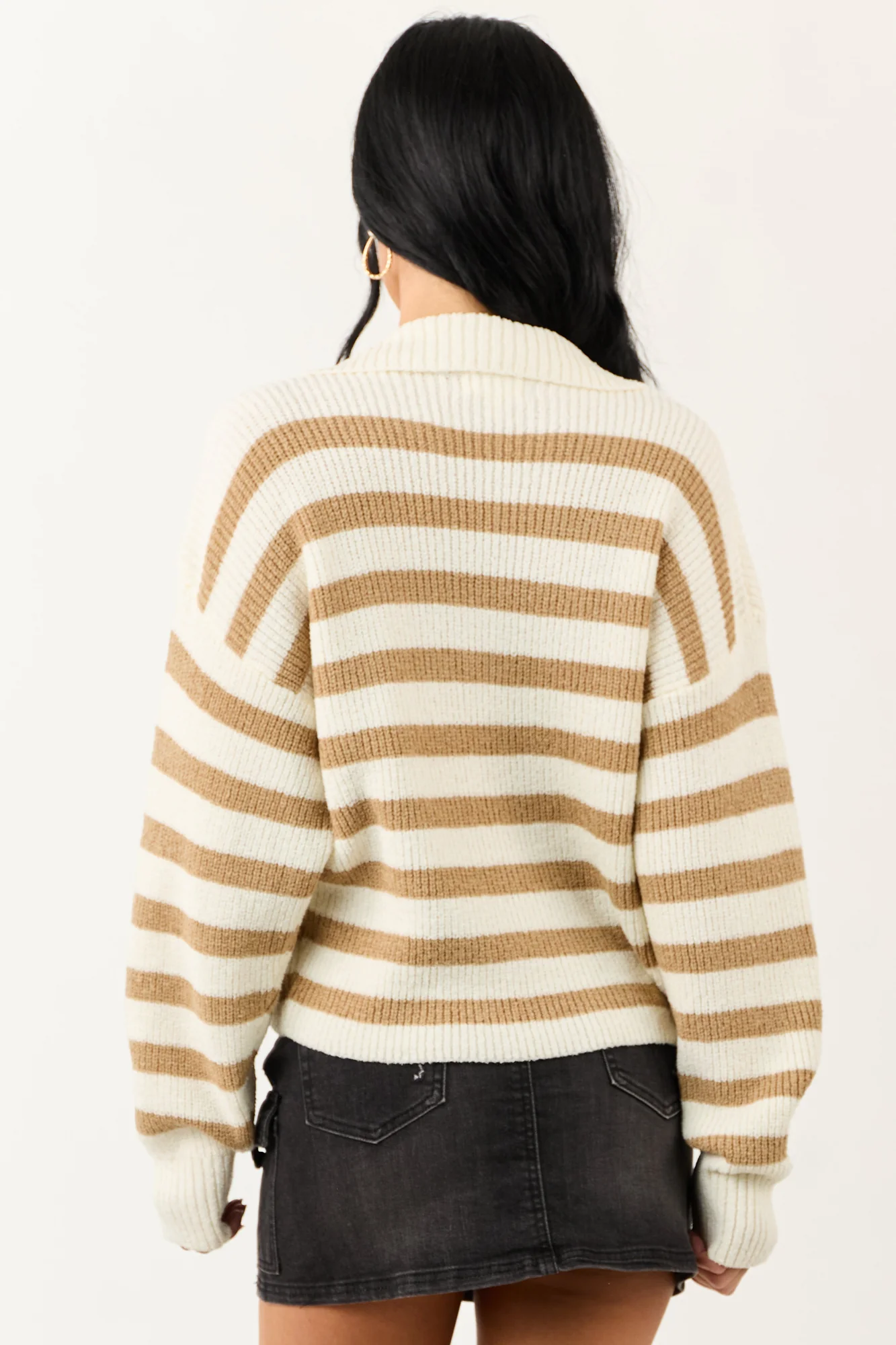 Indulge in the cozy elegance of our cream striped rib knit sweater with a stylish collar accentuating its classic yet bold stripes. Designed for an oversized fit with stretchy softness, drop shoulders, and a V neckline. Ribbed trim and a blend of 60% Acrylic, 30% Nylon, 10% Polyester ensure comfort and style. Perfect for all occasions. Available in sizes S, M, and L. Model height 59″, bust 34″, waist 26″. Elevate your style effortlessly!