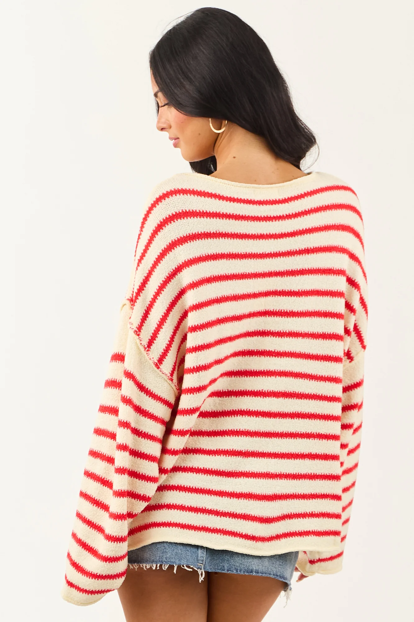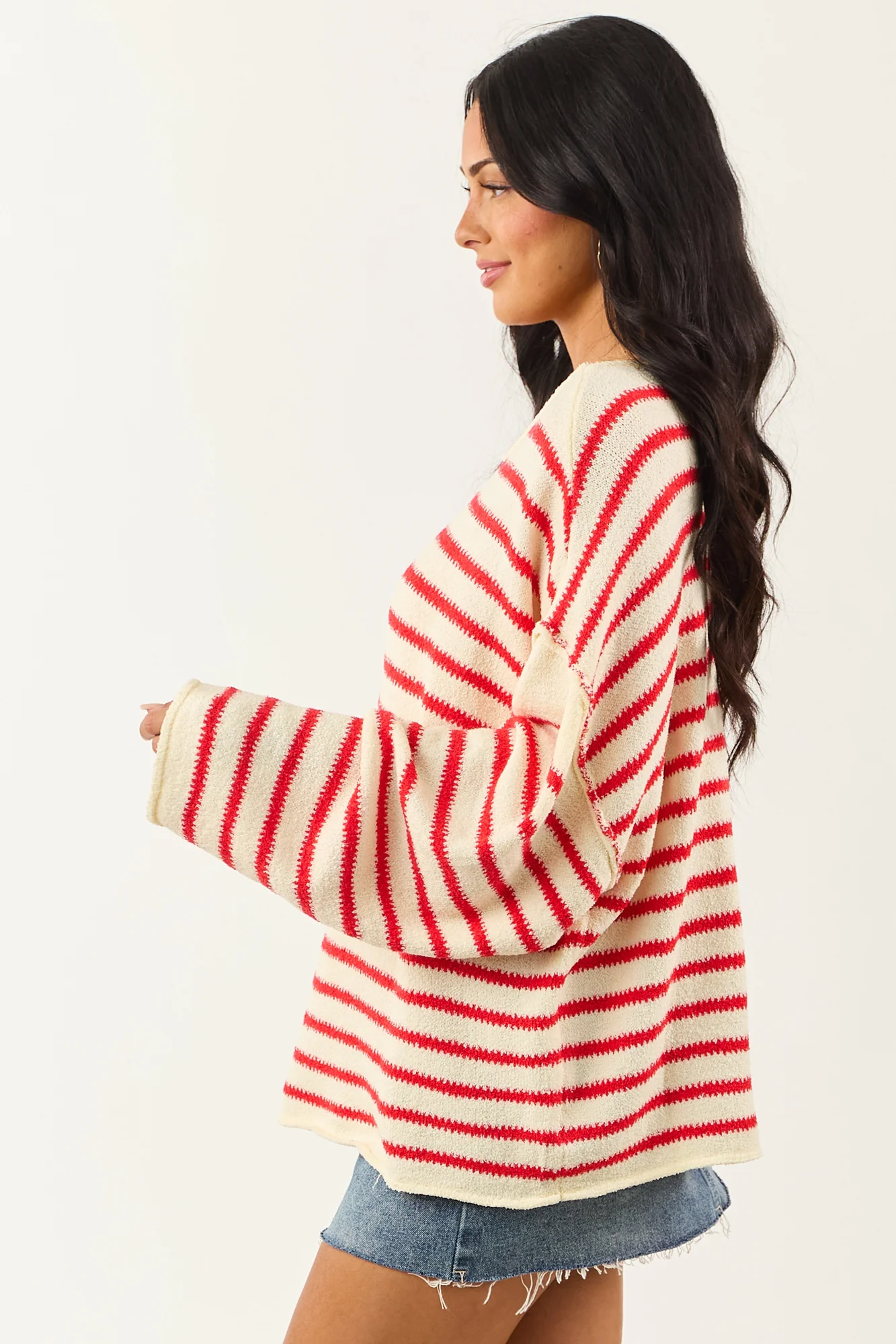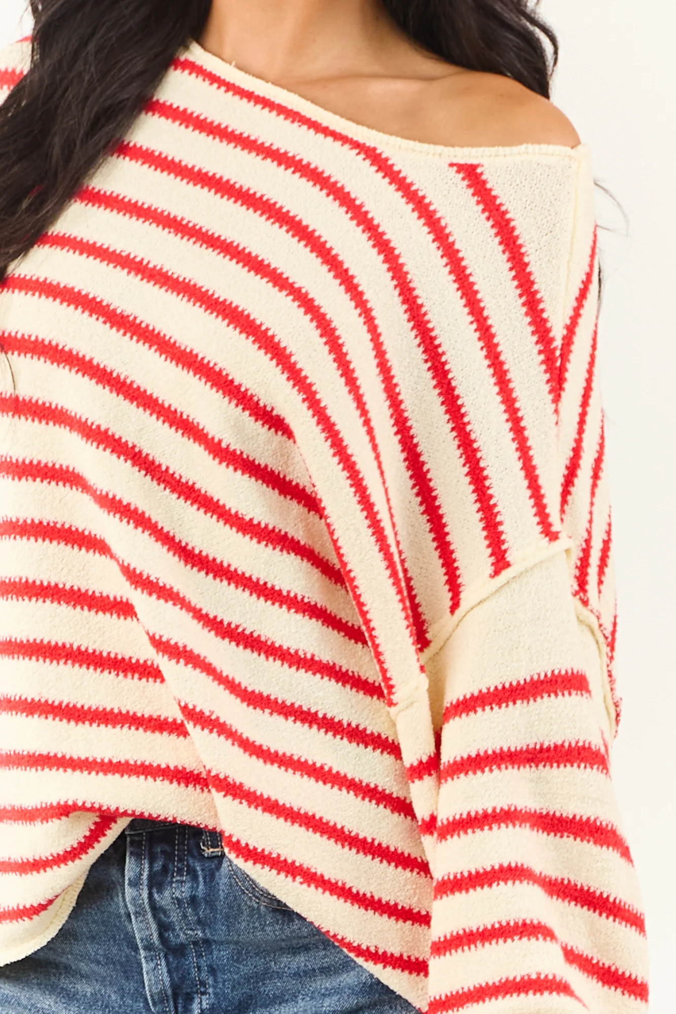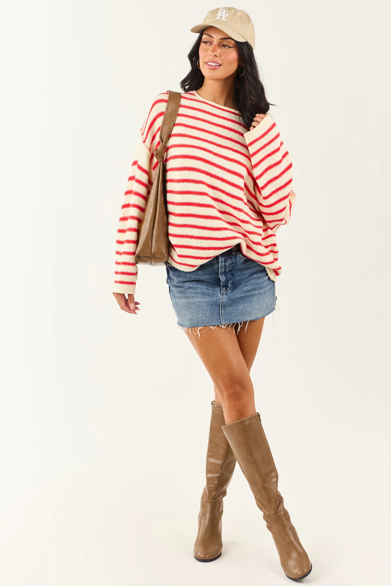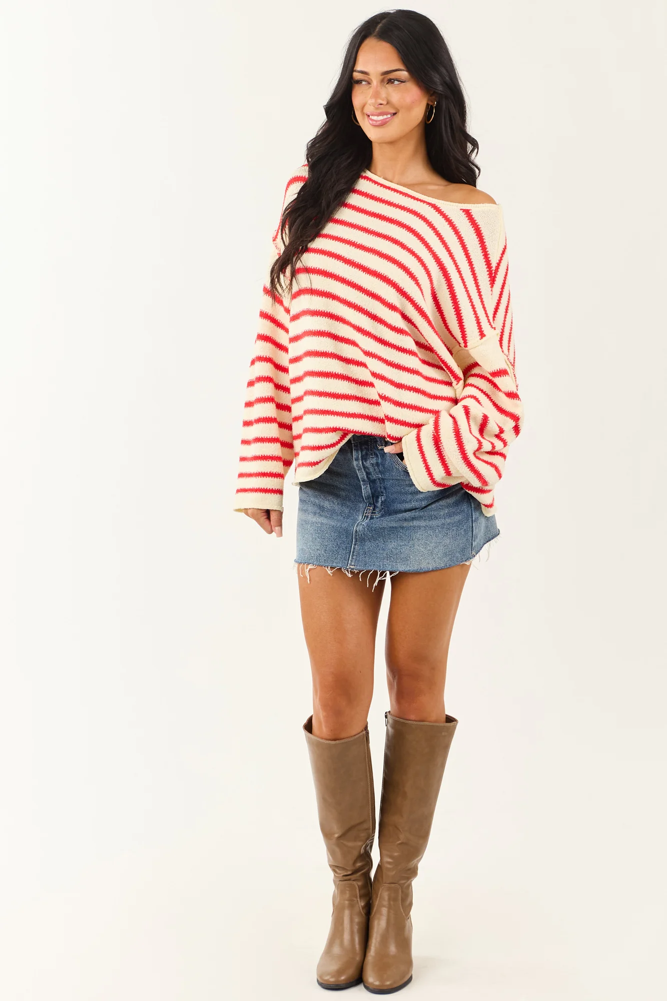 Wrap yourself in effortless cool and cloud-soft comfort with our relaxed striped knit sweater. This oversized sweater features stretchy ribbed knit, drop shoulders, and slouchy charm for a stylish, cozy look. The rolled seam details and soft stripes add a touch of uniqueness to your outfit. Made of 50% Acrylic and 50% Nylon for a comfortable fit. Please note that due to the cutting and sewing process, items may vary slightly, and stripes may not match up perfectly. Embrace the oversized fit for a fashionable and relaxed style. Model is wearing size Small. Height: 59″, Bust: 34″, Waist: 26″.