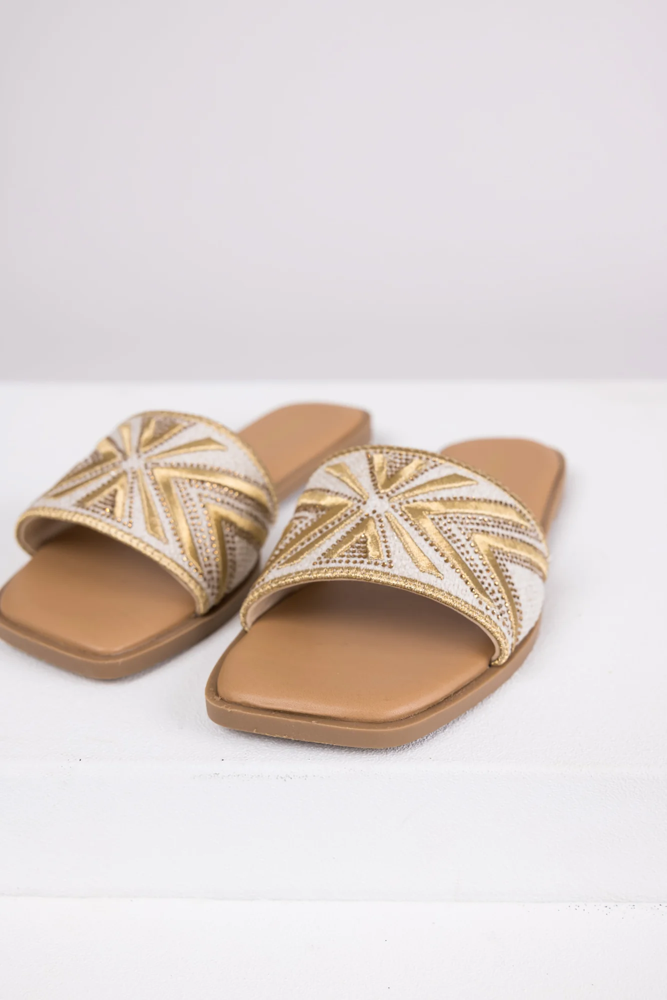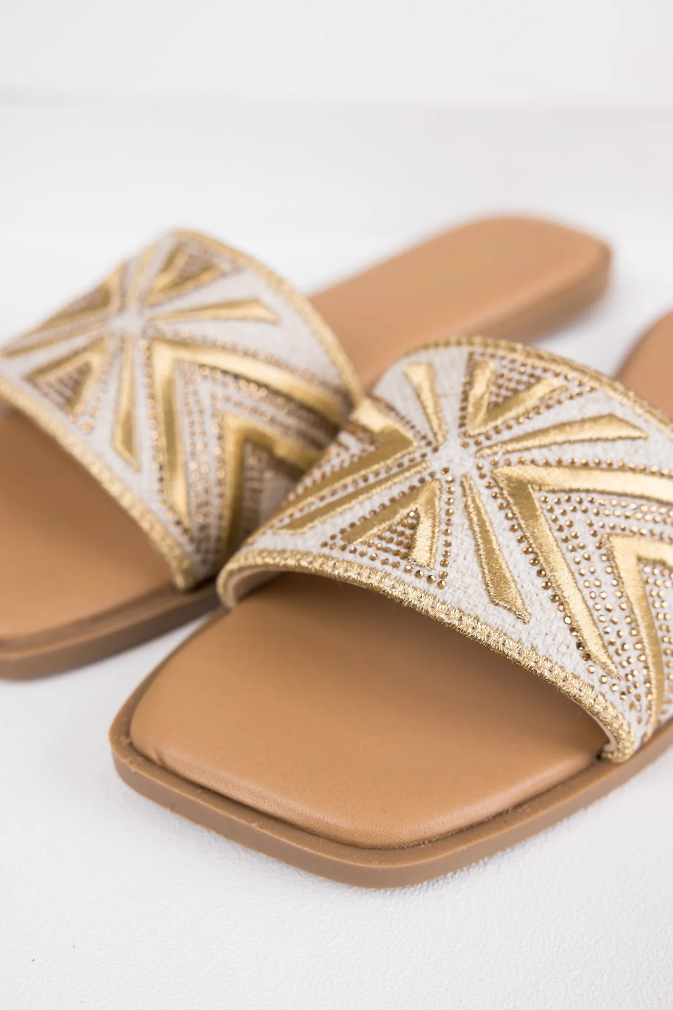 Rhinestone Aztec Slide Sandals in Gold Oatmeal