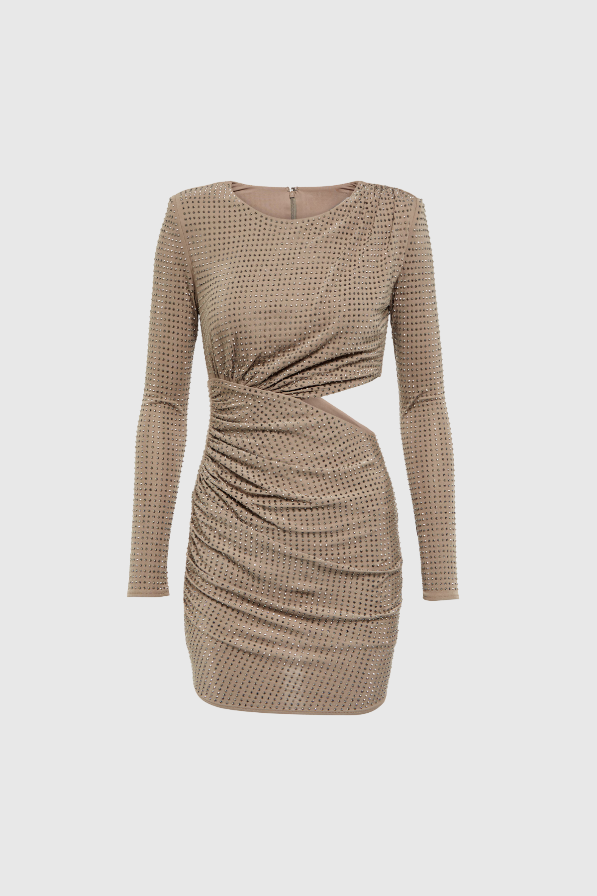 Elevate your style with this chic essential Rhinestone Cutout Ruched Mini Dress. The exquisite rhinestone detailing, flattering cutout design, and ruched fabric texture make it a glamorous choice for special occasions. Crafted from a blend of 50% Polyester and 50% Cotton with a slight stretch for comfort. The mini length accentuates your legs, offering a sophisticated look. This dress is machine washable for convenient care. *Color may vary slightly due to lighting. Stay fashionable and comfortable with this stunning dress that exudes elegance and charm.