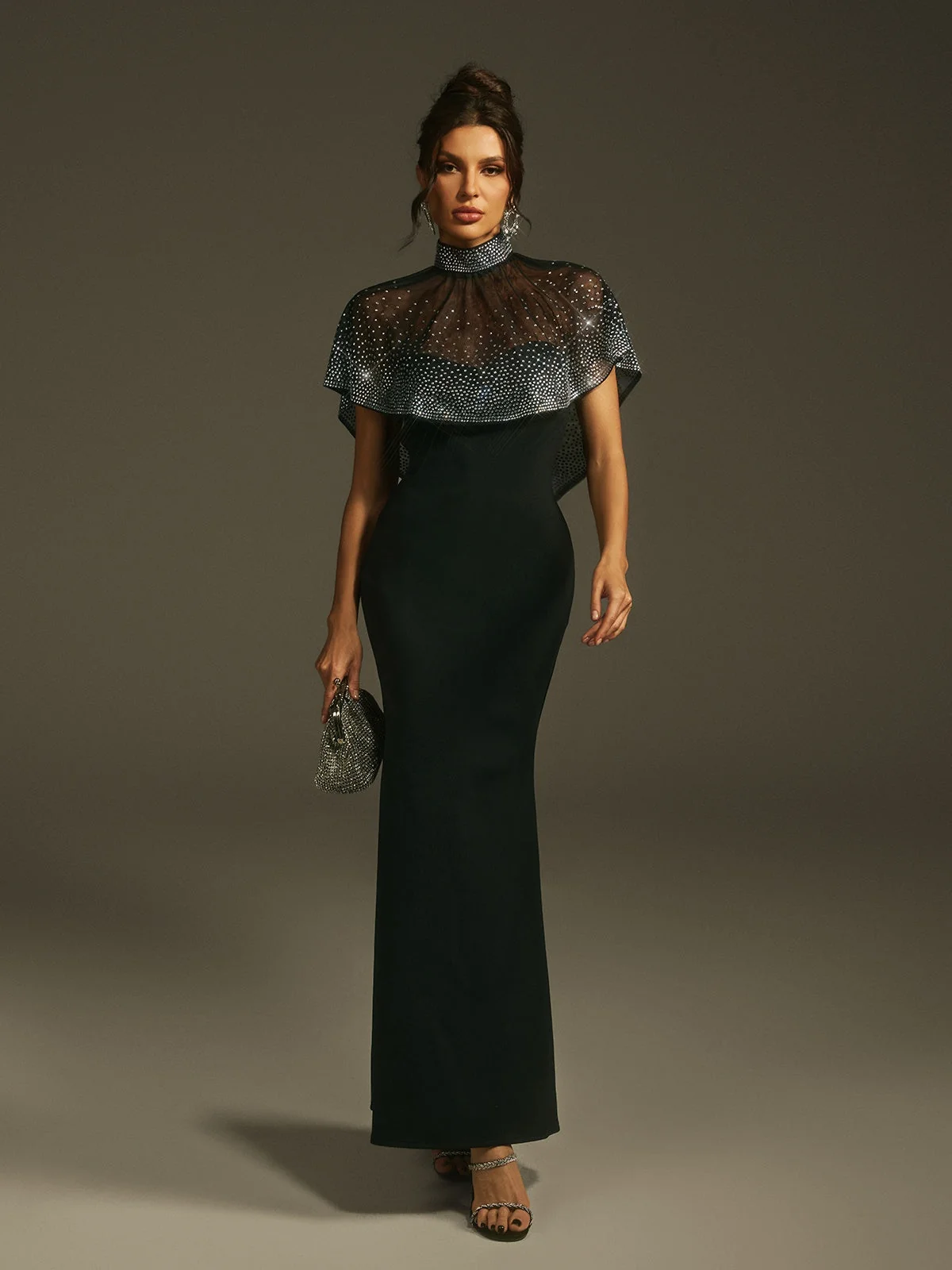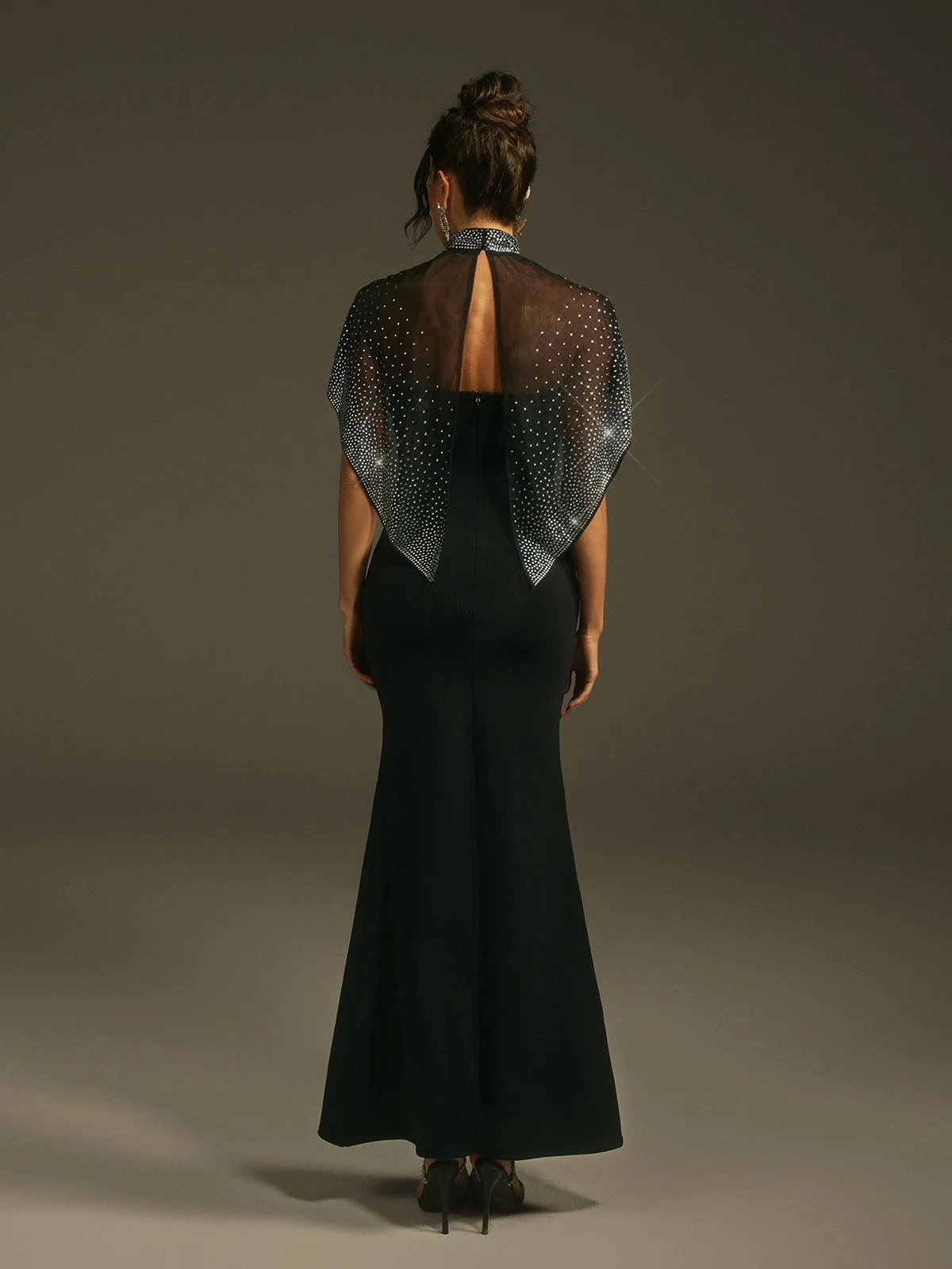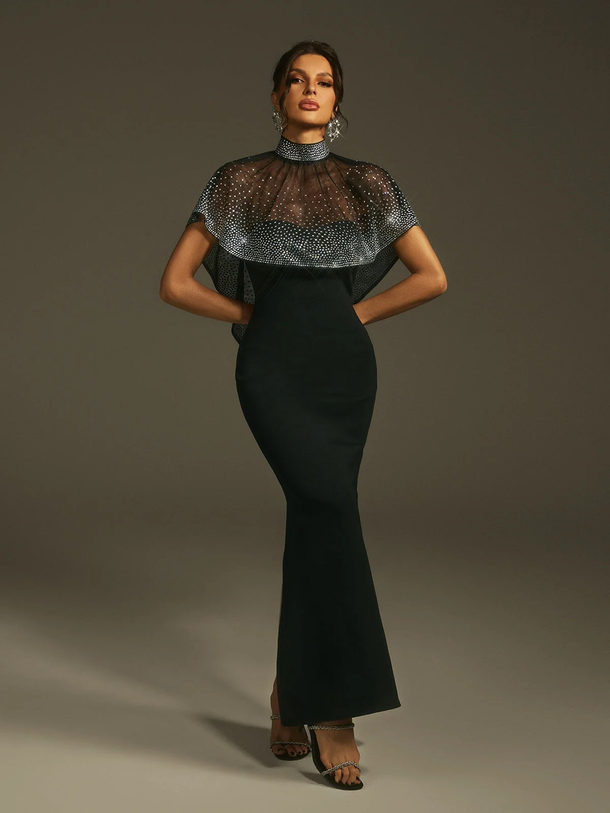 Elevate your evening look with the stunning Rhinestone Embellished Bandage Maxi Dress. Crafted from 95% Polyester and 5% Spandex, this dress features bold glamour and sophisticated style. The high neckline adorned with sparkling rhinestones adds a touch of elegance, while the sleek bandage fit sculpts your figure beautifully. Ideal for formal events and special occasions, this dress is sure to leave a lasting impression. Enjoy slight stretch comfort and easy wear with the invisible zipper opening at the back. Dry clean only. Please note that color may vary due to lighting. Available in sizes S, M, and L.