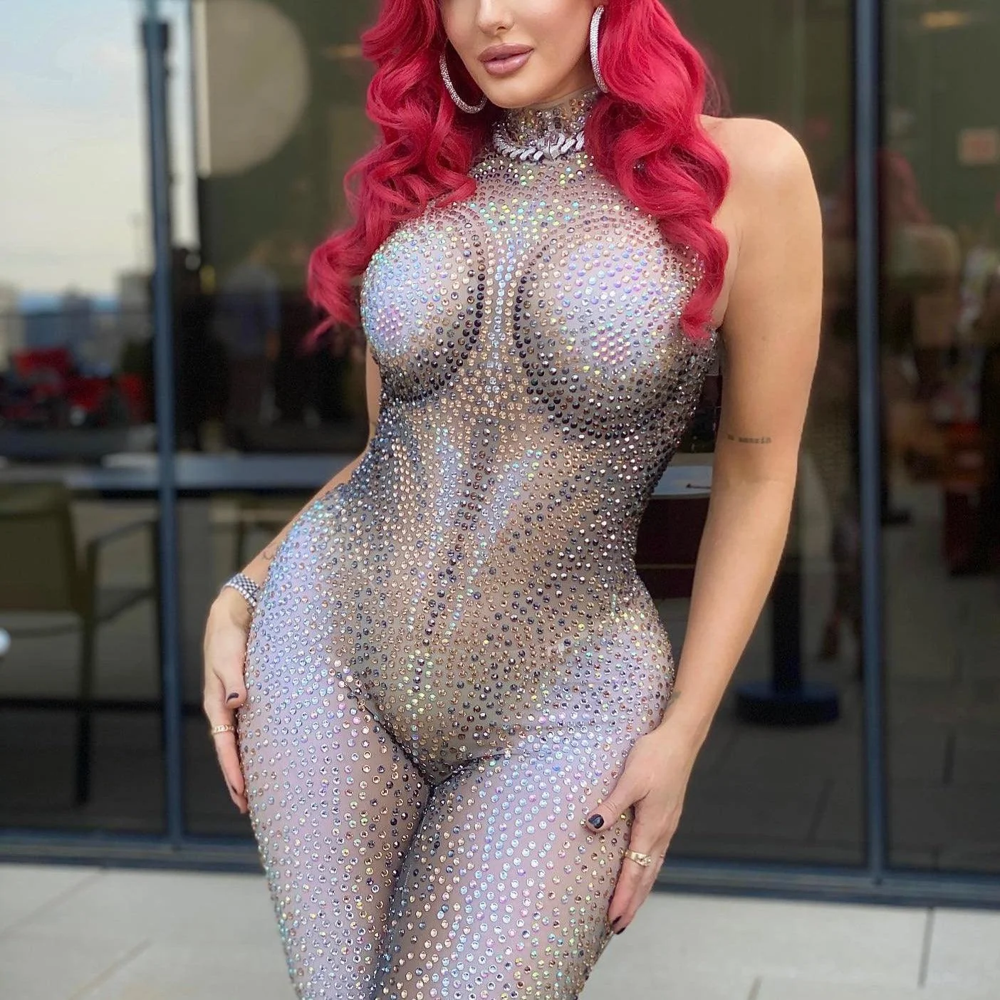 Step into sophistication with our Rhinestone Mesh Jumpsuit in a stunning nude shade. This meticulously crafted piece, adorned with sparkling rhinestones, exudes elegance and style. The tailored silhouette offers a flattering fit for evening affairs or chic gatherings. Designed for grace and glamour, this jumpsuit is a wardrobe essential that guarantees a mesmerizing impression effortlessly, day or night. Discover versatility and shine by pairing it with our Diamante Bow Wrap Around Perspex Heels for a glamorous finish. Elevate your style effortlessly. Crafted from 92% polyester and 8% spandex. Hand wash recommended for care instructions. Exchange available for size mismatches.