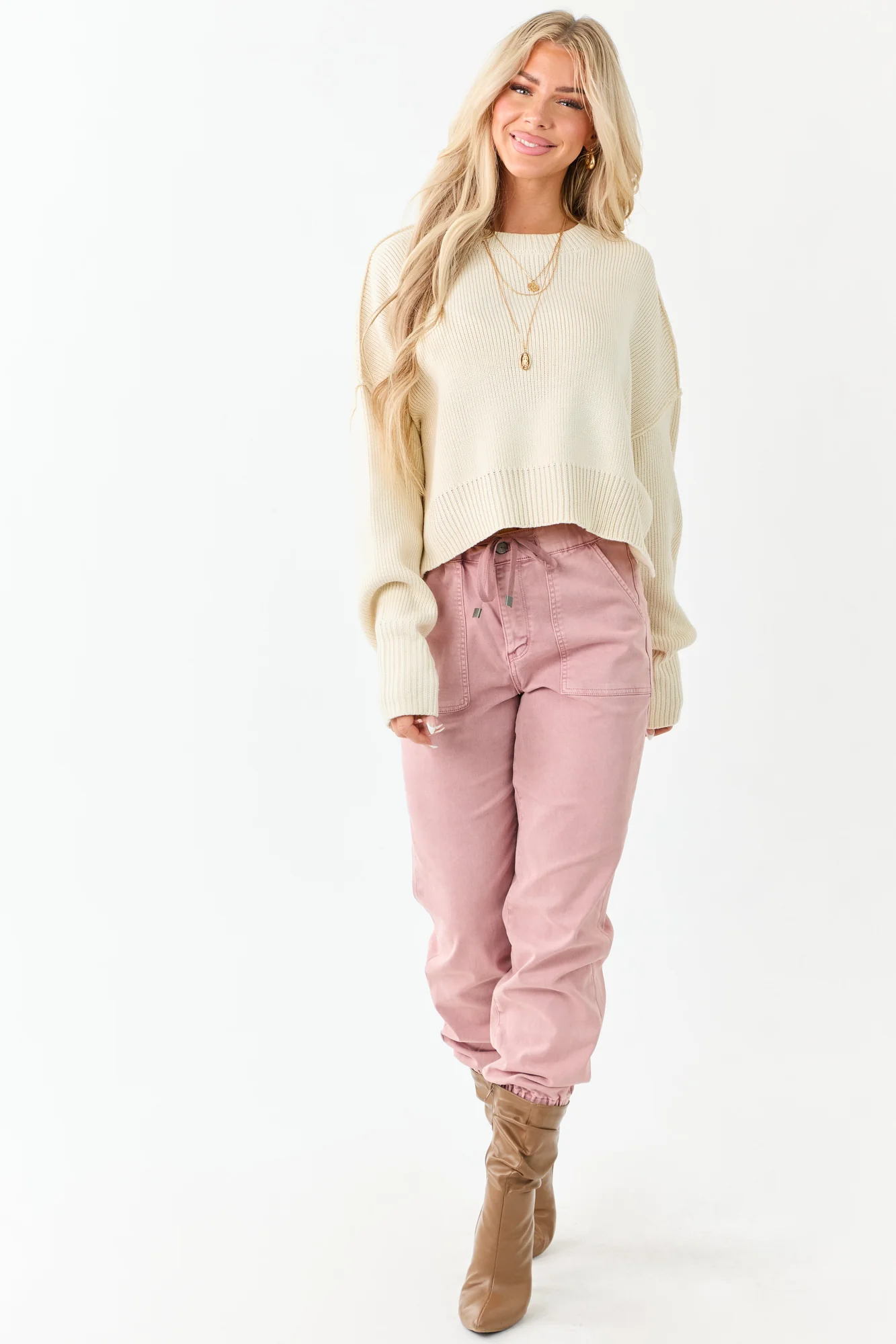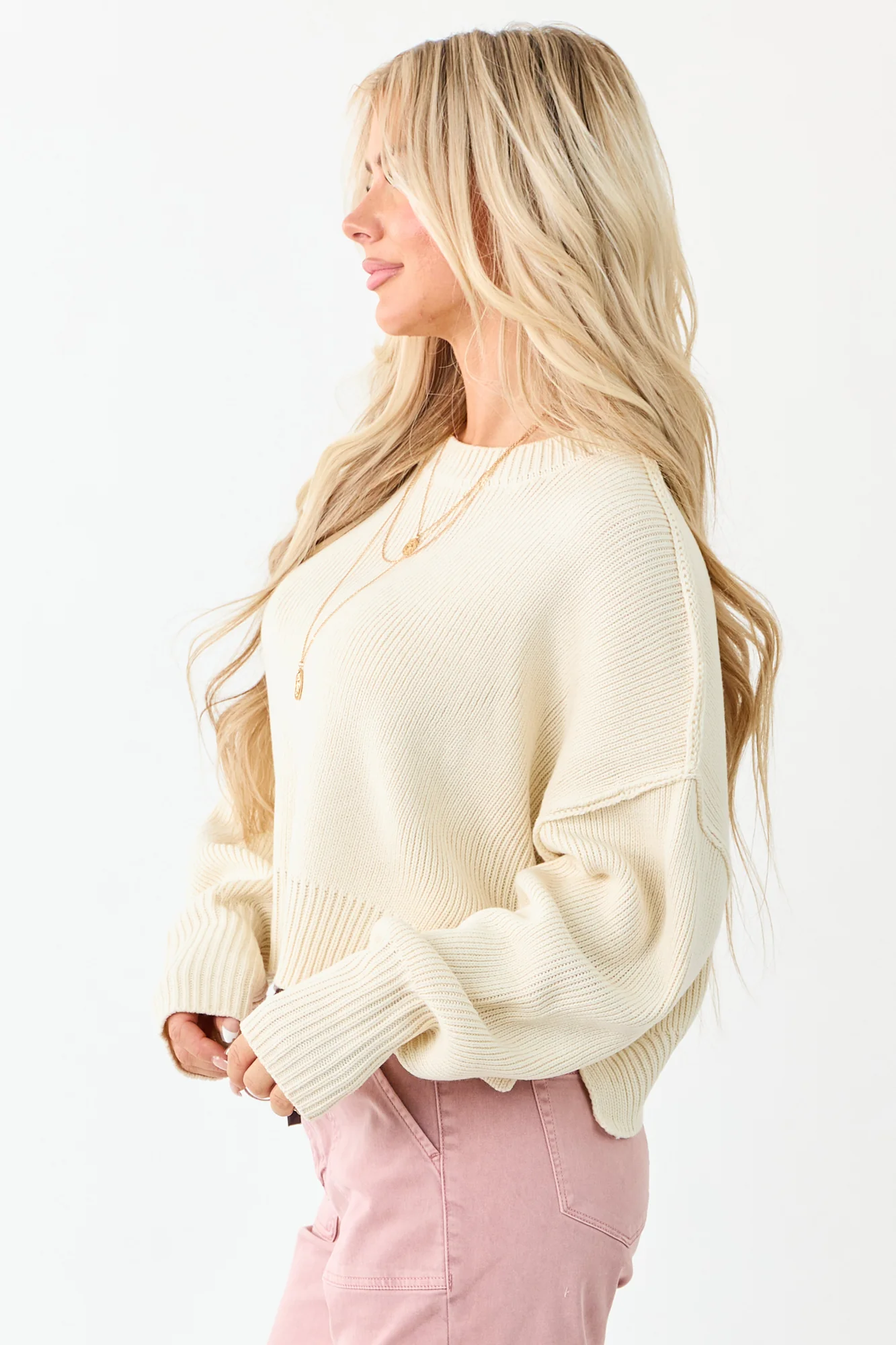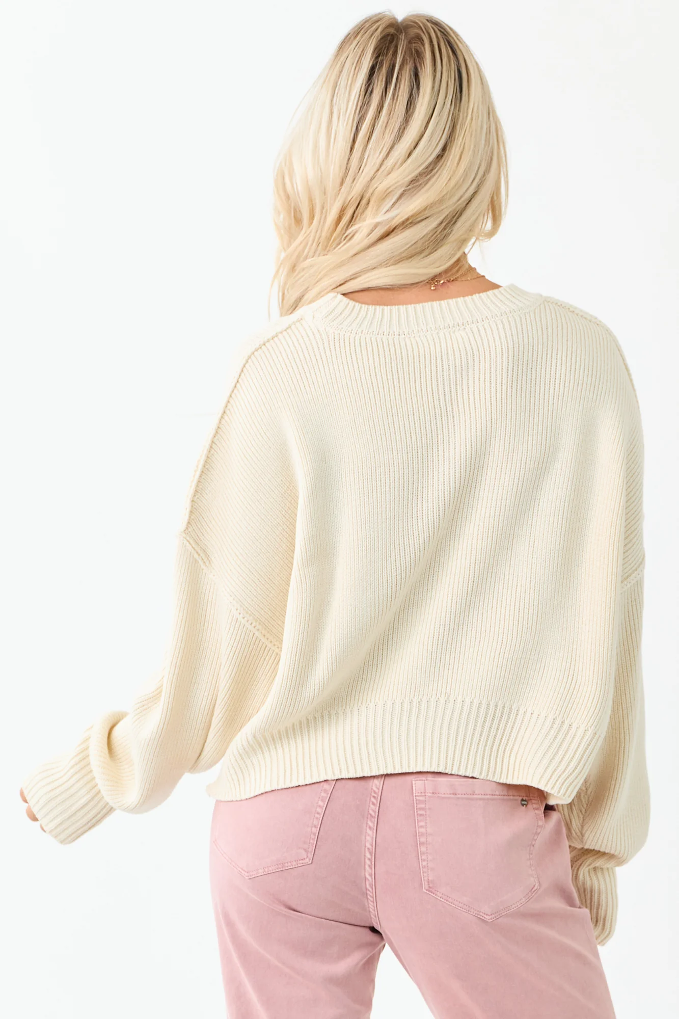 This cream rib knit sweater in boxy, oversized design is perfect for layering during cooler weather. Made of stretchy and soft acrylic, it features banded trim, a slightly cropped length, and long sleeves for a trendy look. Available in sizes S, M, and L. Imported. Ideal for a stylish and cozy outfit on chilly days. Model is wearing size Small. Model’s Profile: Size 3, Height 57″, Bust 35″, Waist 26″.