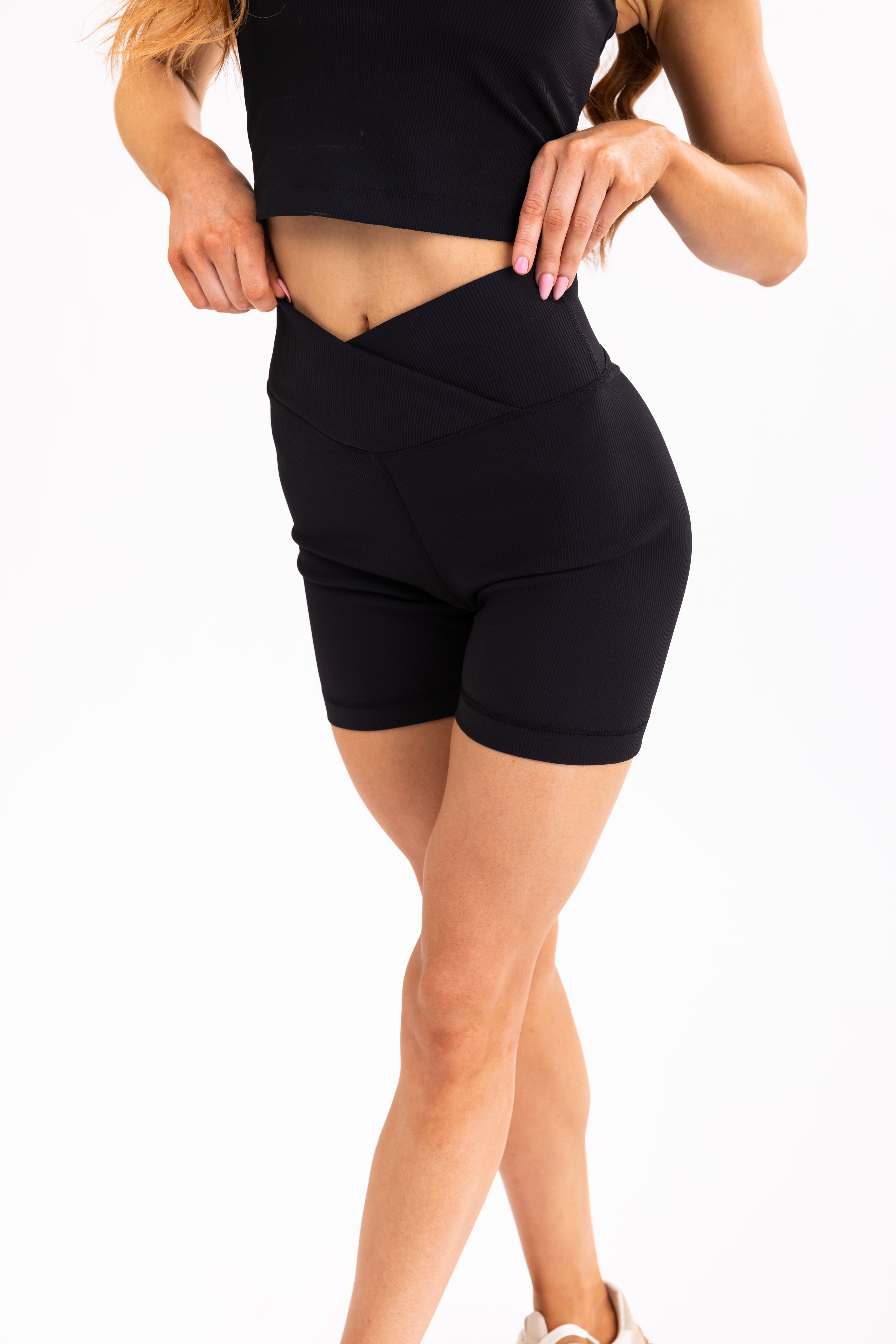 Upgrade your athleisure look with these Ribbed Black High Waisted Crossover Biker Shorts. Made from 75% Nylon and 25% Spandex, these stretchy knit shorts offer a comfortable fit perfect for daily wear. The high waist design and ribbed texture add a touch of style to your casual outfits. With a crossover waist and unlined finish, these imported shorts are ideal for a fashion-forward wardrobe. Available in sizes S, M, and L. Hand wash cold for best care.