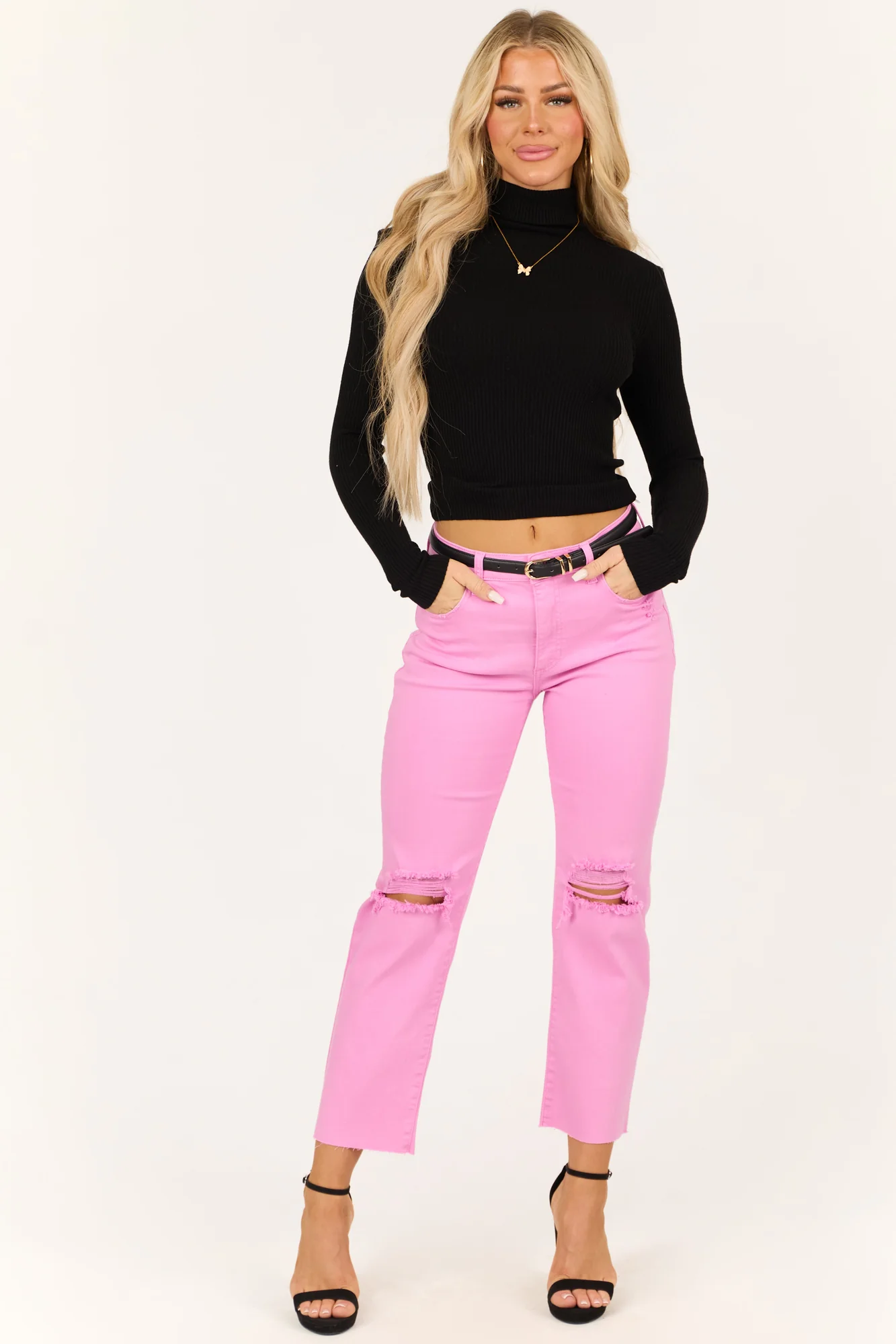 Stay cozy and stylish with our Black Ribbed Fitted Turtleneck Top. Made from a stretchy ribbed knit blend, this long sleeve top features a banded trim for a chic look. Available in sizes S, M, and L with different sleeve and length measurements to suit your style. Imported and easy to care for, its a versatile addition to your wardrobe. Note: Hand wash cold, do not bleach, dry flat, iron low. Model is wearing a size Small. Model’s Profile: Size 1, Height 57″, Bust 34″, Waist 26″.