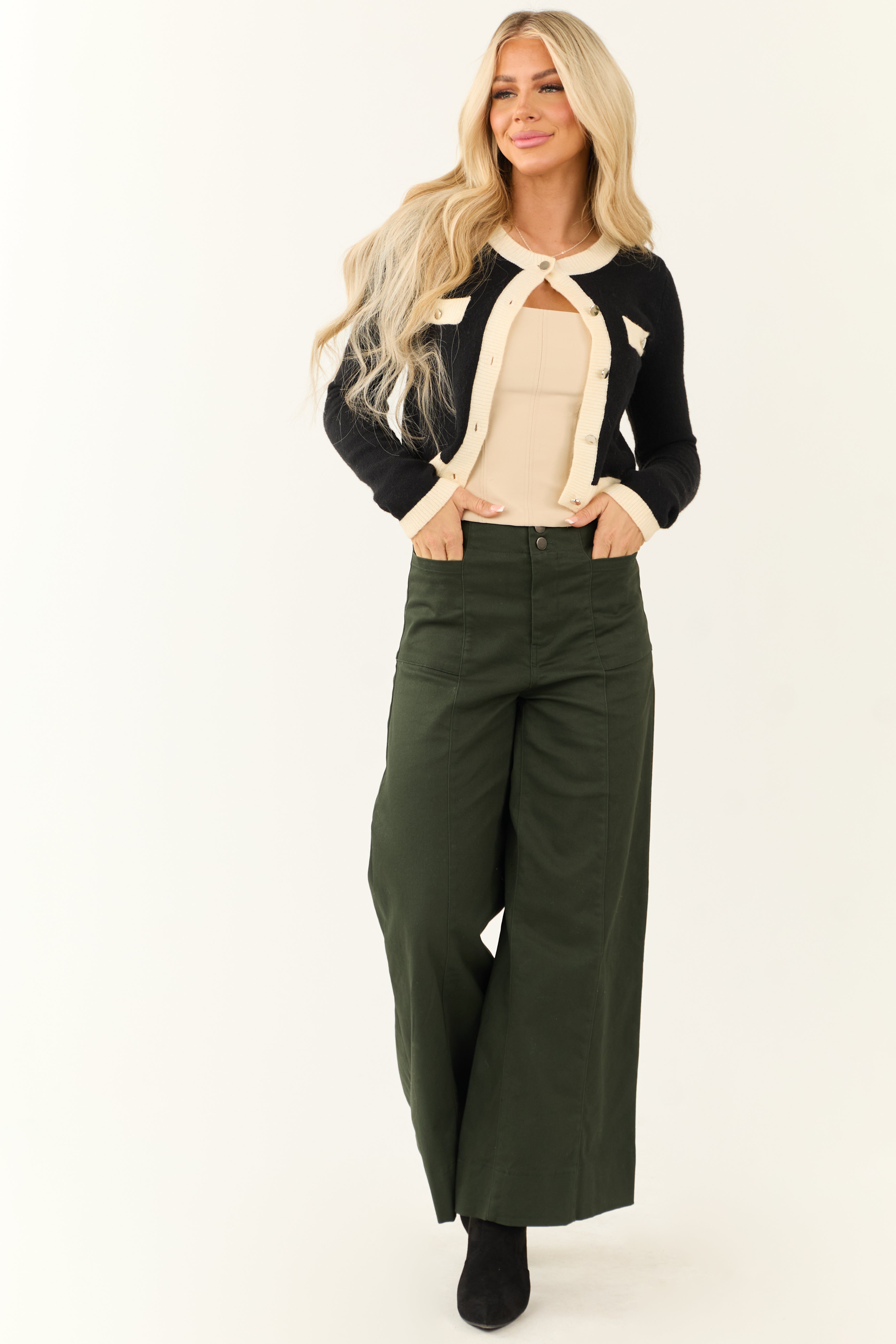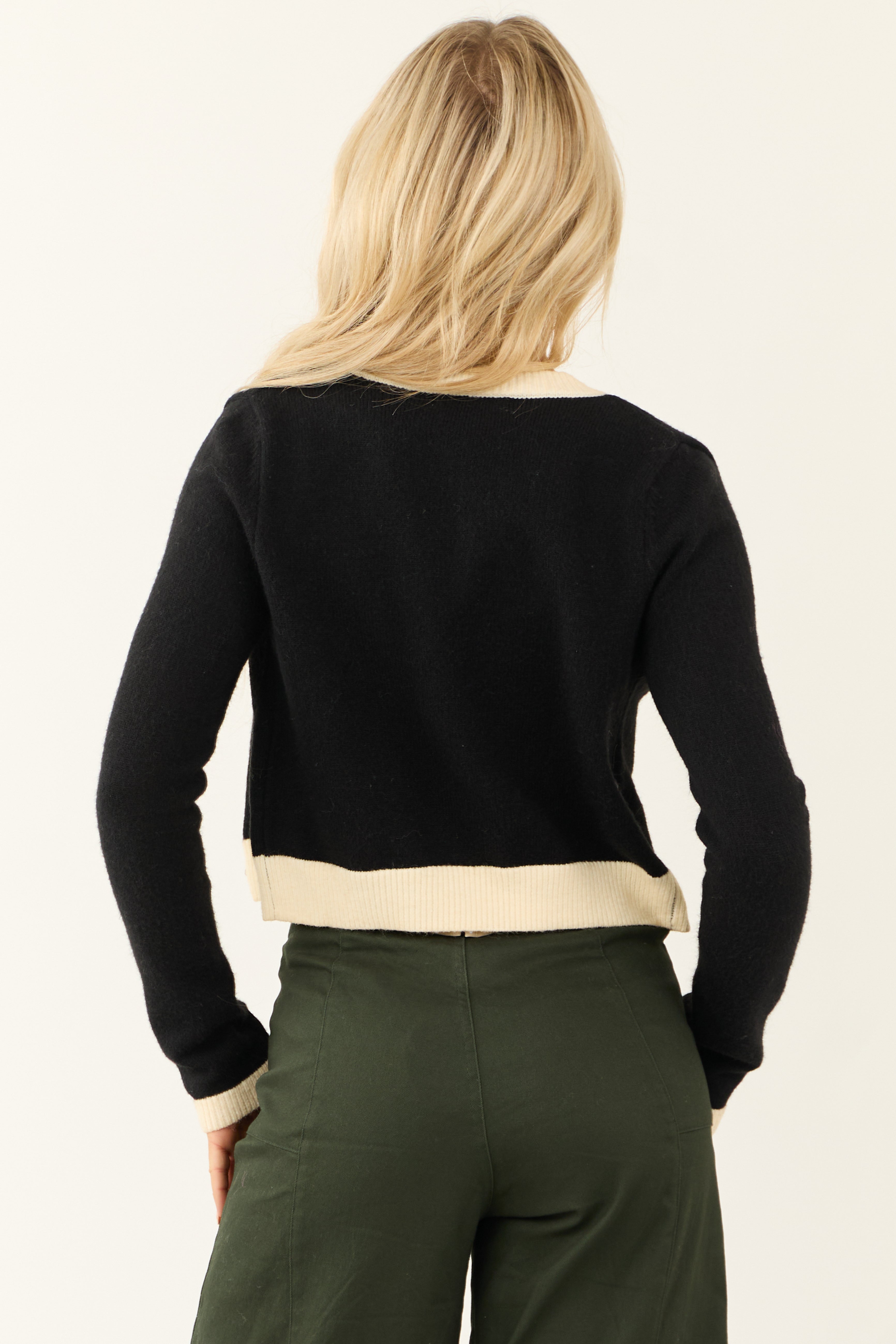 Stay stylish and cozy with our Ribbed Knit Button Down Cardigan in Black and Cream. This elegant cardigan features stretchy ribbed knit, silver buttons, a slight cropped length, faux chest pockets, and cream banded trim for a chic look. The blend of 38% Polyester, 36% Acrylic, and 26% Nylon ensures both comfort and durability. Perfect for everyday wear, this versatile cardigan is a must-have addition to your wardrobe. Hand wash in cold water separately to maintain its quality. Available in sizes S, M, and L.