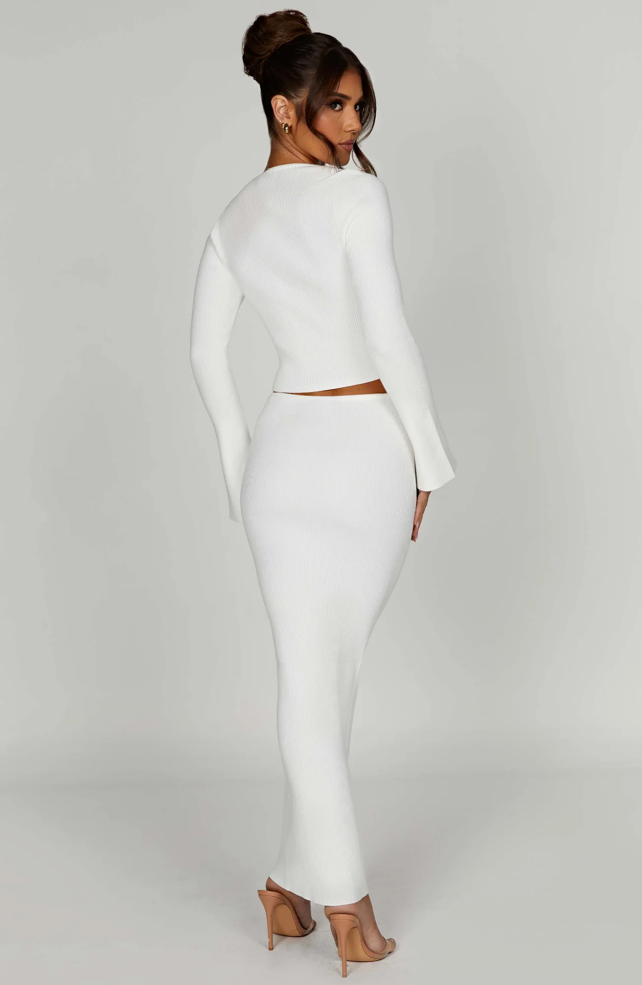Indulge in the luxurious comfort of the Elia maxi skirt, crafted from premium ribbed knit that beautifully accentuates your body shape. Perfectly pairs with the Elia top for an elegant ensemble. This white maxi skirt offers a flattering fit that molds gracefully to your figure. Elevate your wardrobe with this versatile piece. Available in XS, S, M, L, XL, XXL sizes.