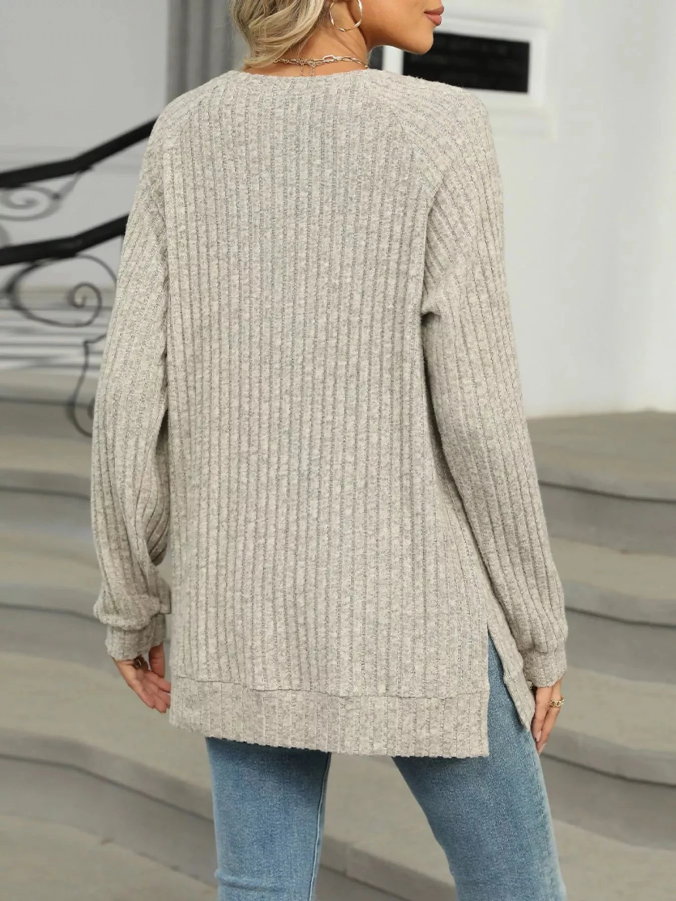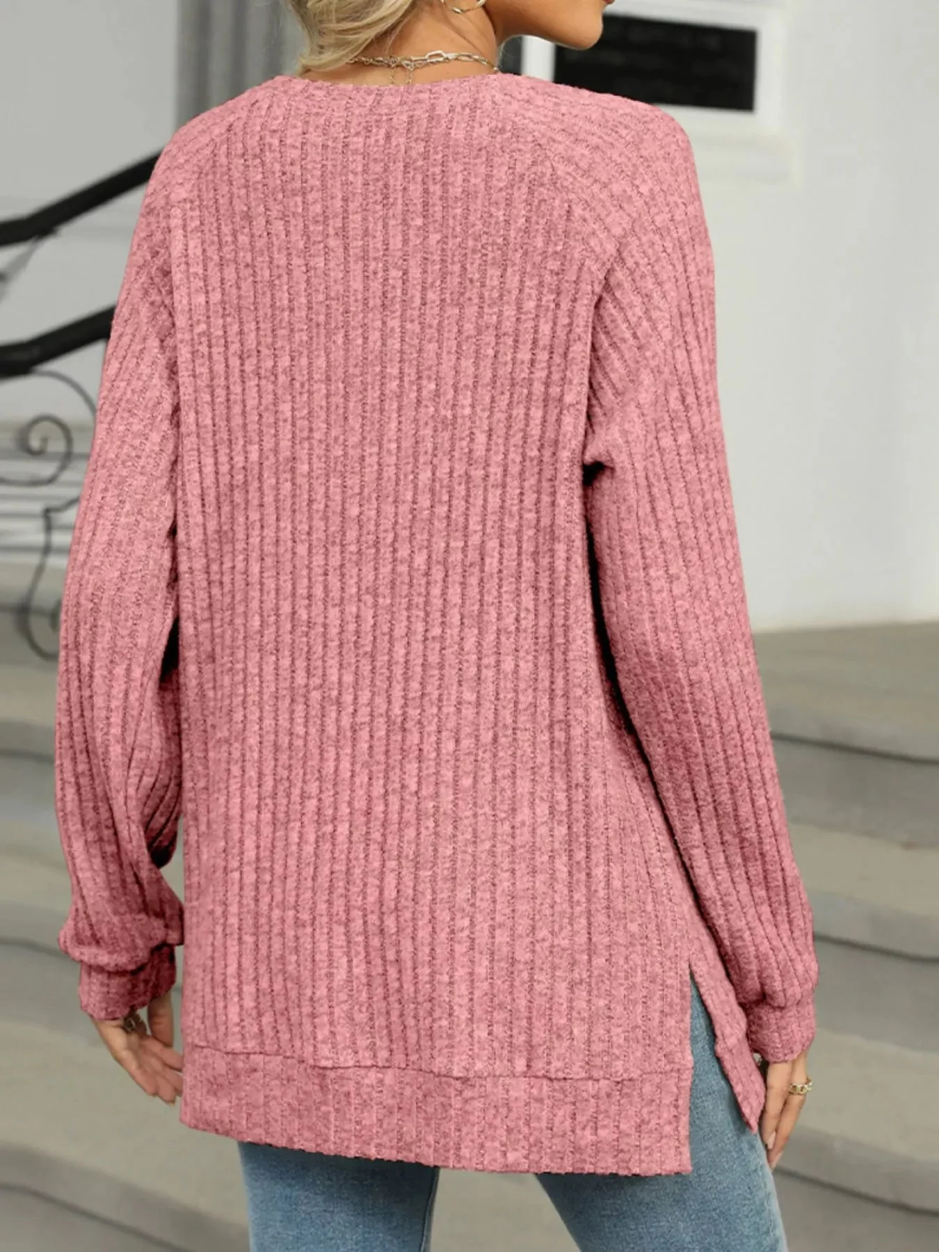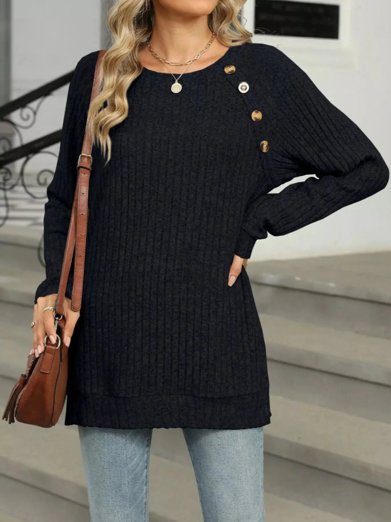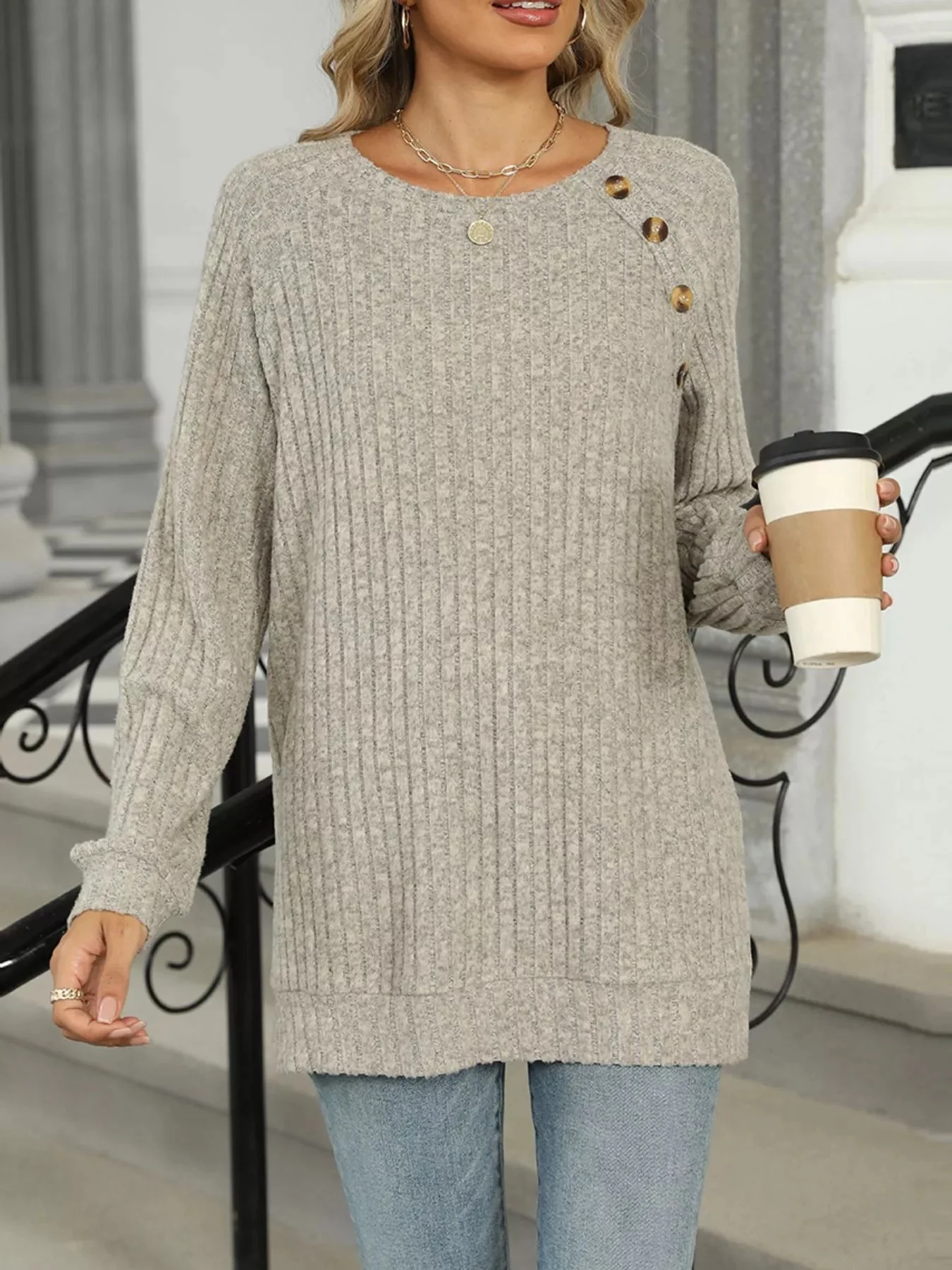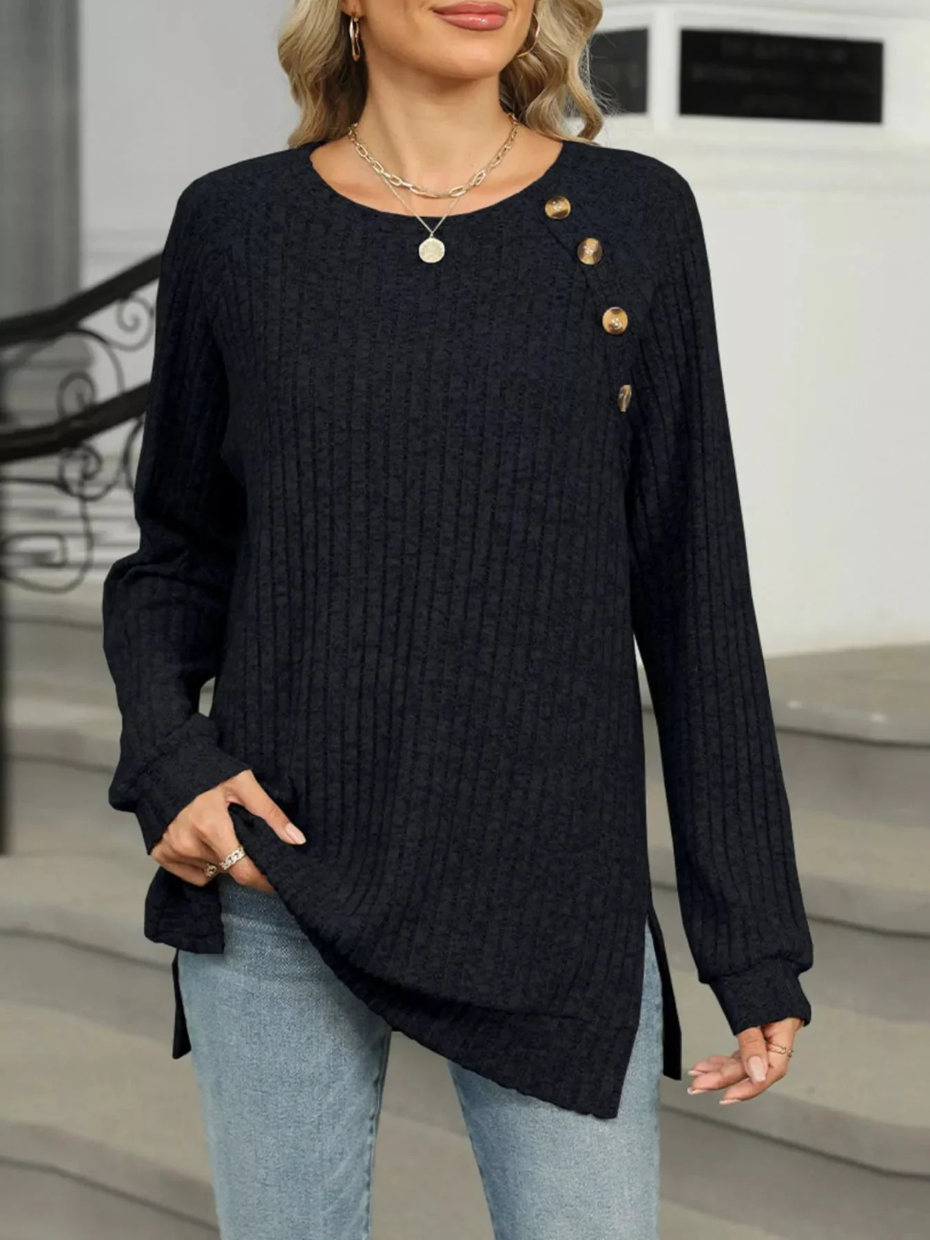 This Ribbed Long Sleeve T-Shirt features a stylish round neck design and offers a comfortable fit. Made of a blend of 65% rayon, 30% polyester, and 5% spandex, it is slightly stretchy for added flexibility. The shirt includes slit details and decorative buttons, adding a touch of sophistication to your outfit. Care instructions: Machine wash cold, tumble dry low. This imported top comes in multiple sizes: S, M, L, XL, and 2XL. Add this versatile piece to your wardrobe for a trendy and casual look that can be dressed up or down effortlessly.