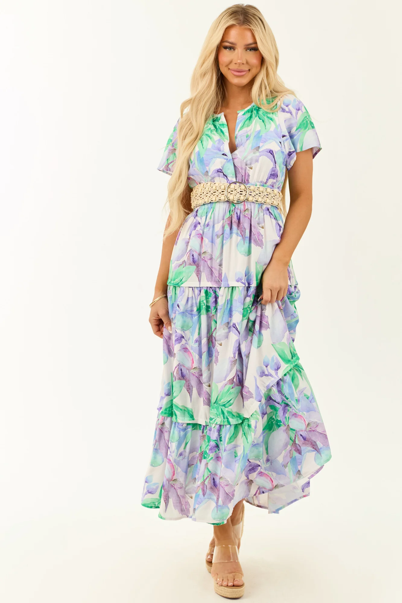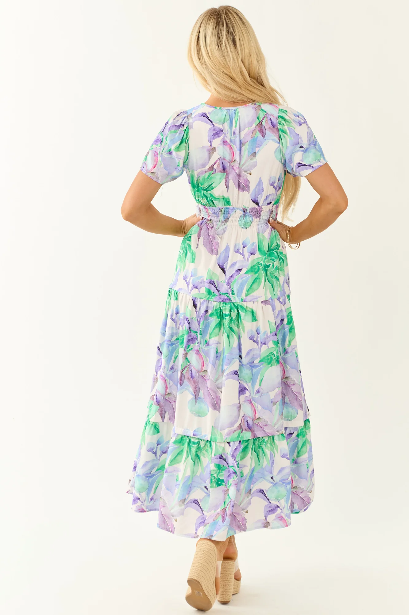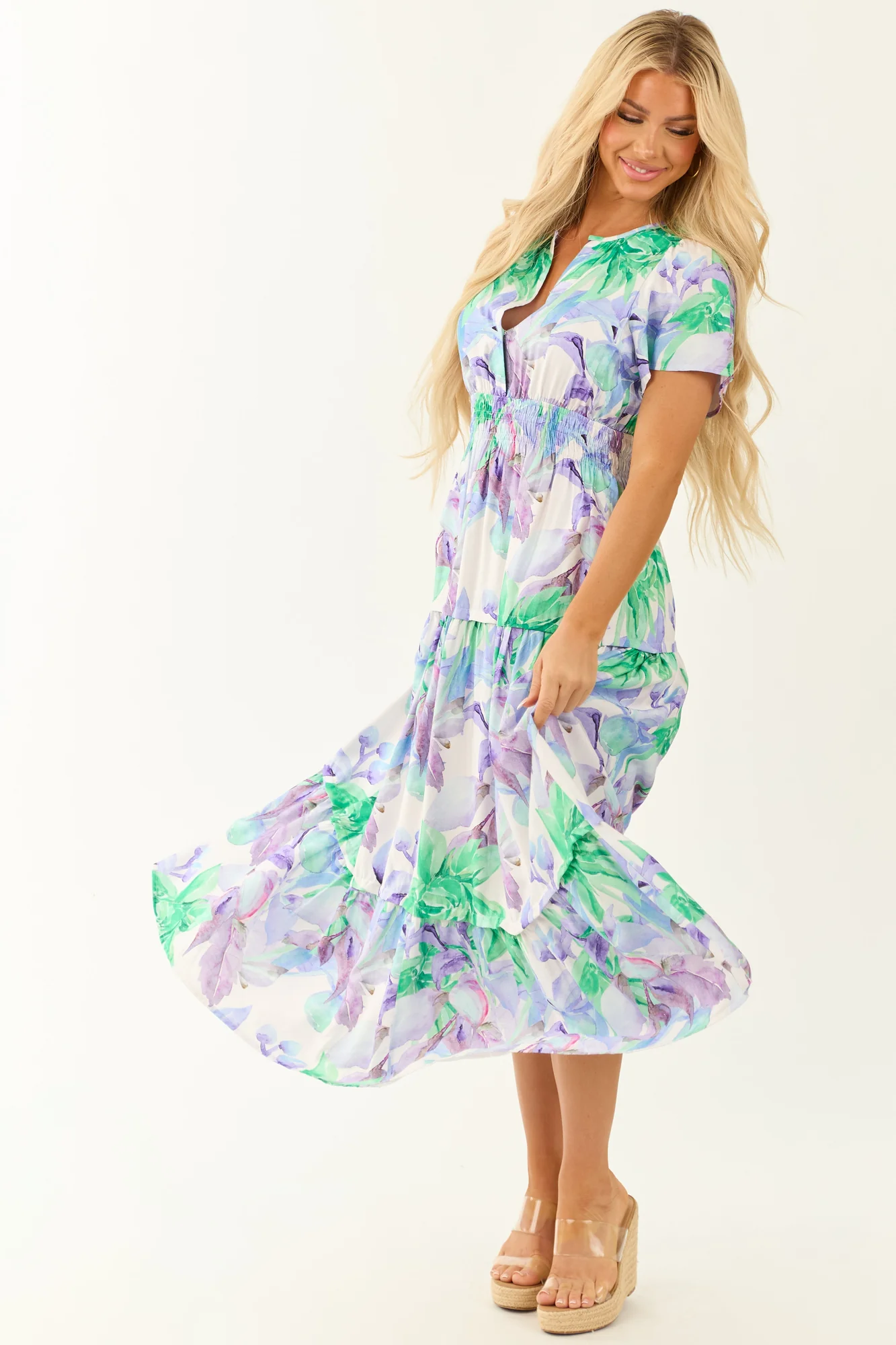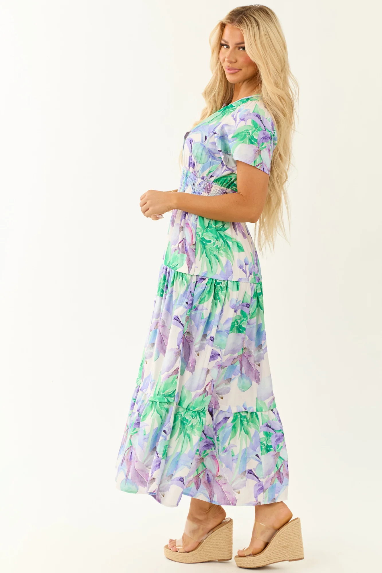 This romantic lavender floral maxi dress is your go-to piece for spring strolls, brunch dates, or garden parties. Featuring delicate floral prints in shades of lavender, vanilla, indigo, and more, this dress fits true to size and offers a slightly loose bodice with a smocked waistband for extra comfort. The tiered side pockets and snap button torso add functional flair. Crafted from 70% Rayon and 30% Nylon with a 100% Rayon lining, this imported dress is perfect for various occasions. Note: Hand wash cold and hang or line dry for maintenance. Please be aware that due to the fabric print and manufacturing process, each piece may vary slightly. Model is wearing a size small. Model’s Profile: Size 1, Height 57″, Bust 34″, Waist 26″.