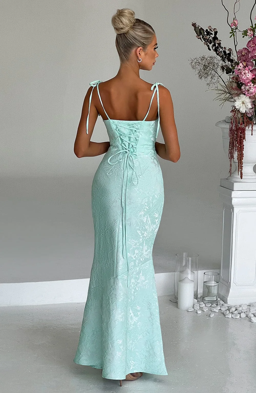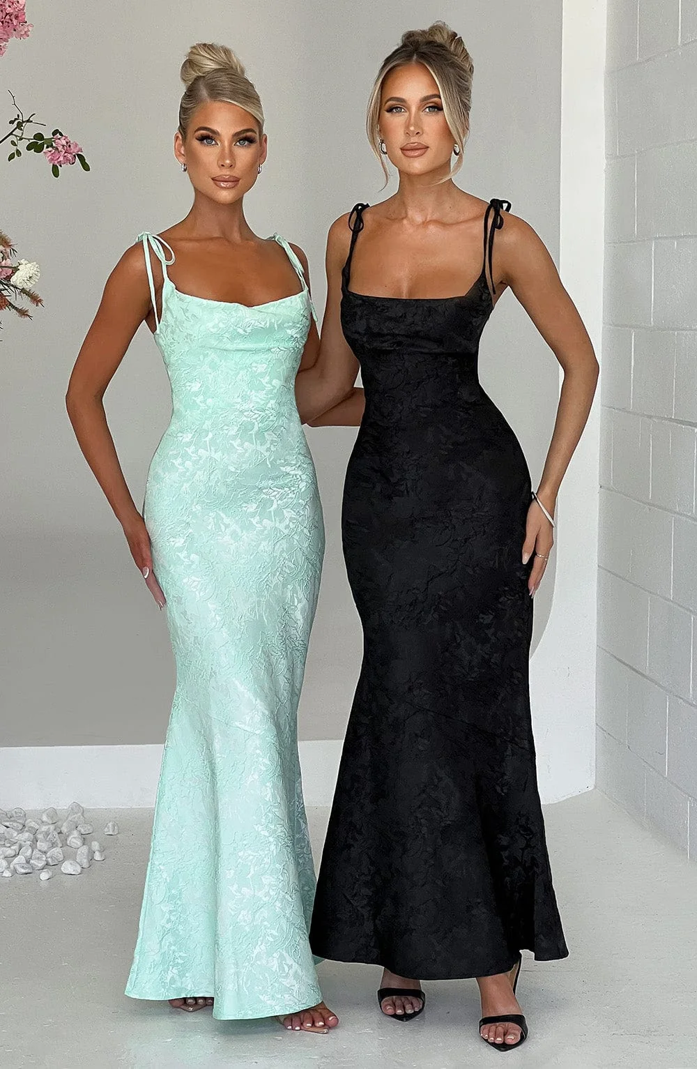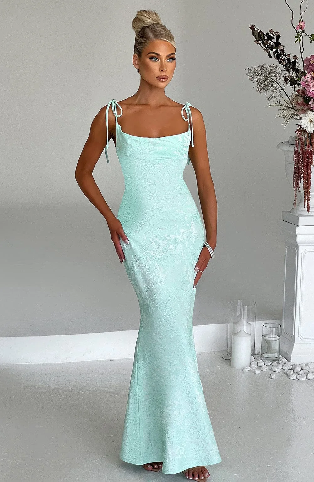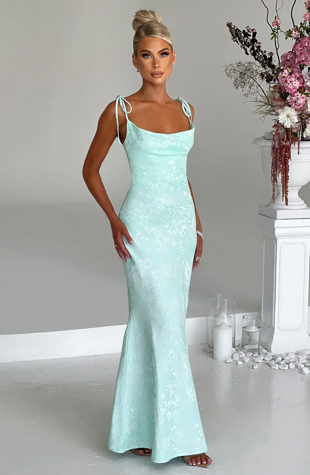 Indulge in romance with our mint floral jacquard maxi dress called Whitney. This stunning dress features a body-hugging fit, bias cut for a beautiful draped skirt, tie straps, and a sexy cowl neck. Crafted to skim over your body elegantly, it is perfect for various occasions like weddings, parties, or proms. Feel confident and glamorous in this figure-flattering dress. Suitable for all body shapes. Complete the look with platform heels and a mini clutch for a captivating ensemble.