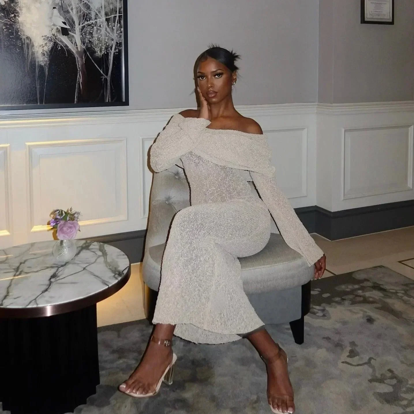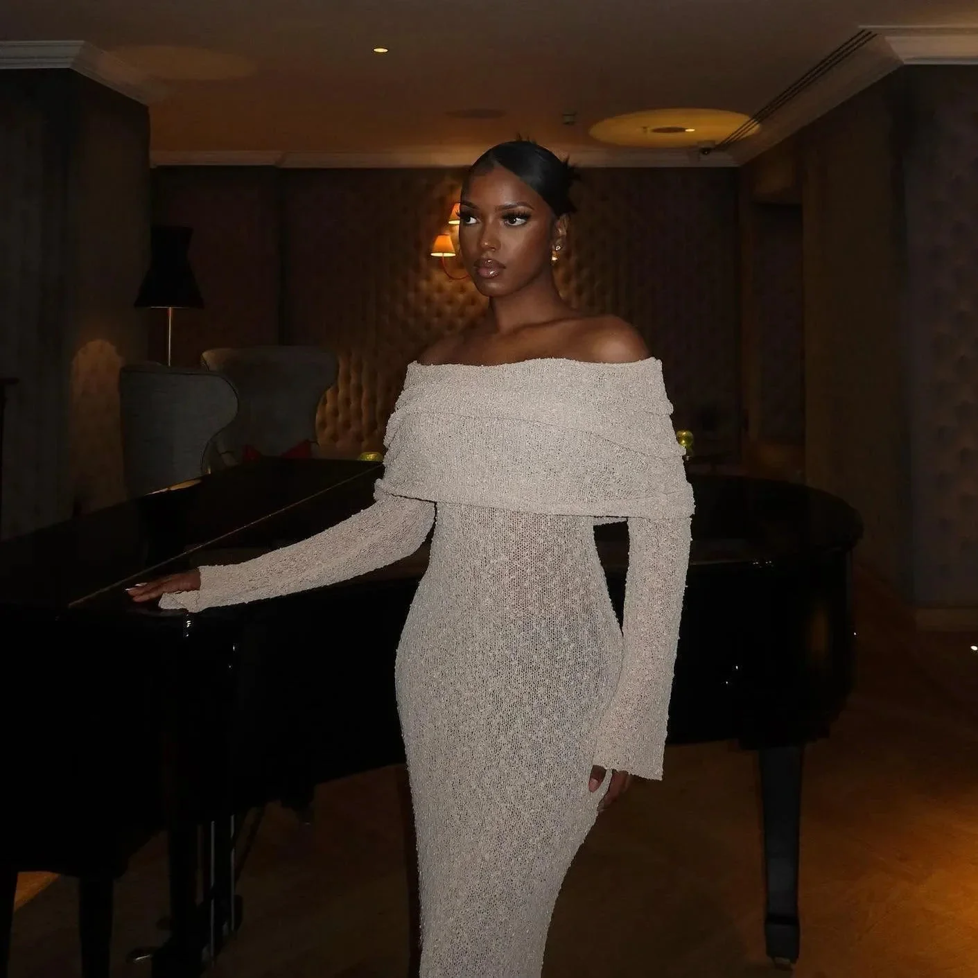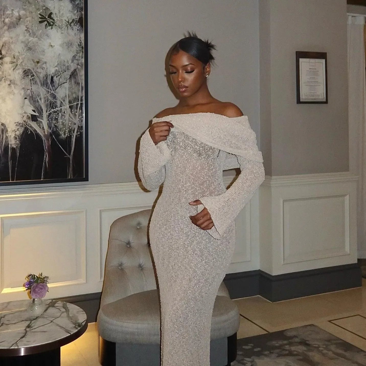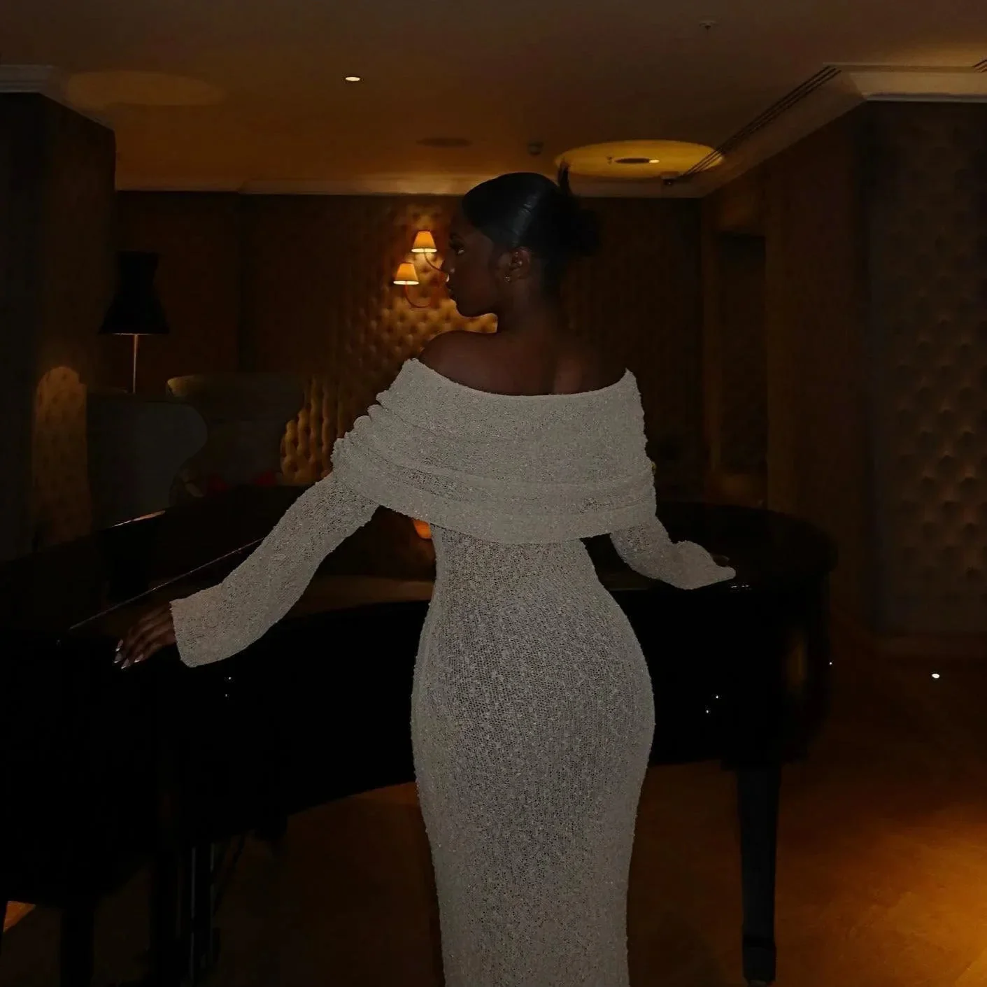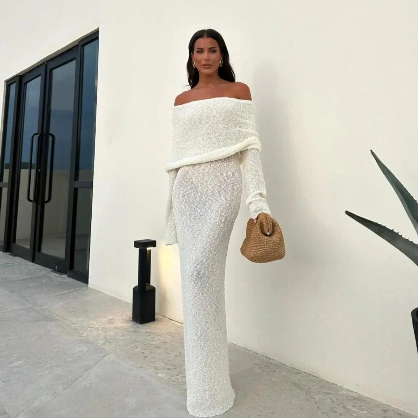 Indulge in elegance with our Romantic Off-Shoulder Maxi Dress crafted from flowy fabric. The off-shoulder style accentuates your neckline and shoulders, exuding a touch of romance. Its graceful drape and cinched waist ensure a flattering fit that complements any body shape. This dress features a soft, lightweight material for all-day comfort combined with a sophisticated look, making it perfect for special occasions, events, dinners, or romantic outings. For a chic and versatile outfit, explore style ideas and inspirations on our Instagram @mermaid_way. Embrace effortless sophistication with this must-have piece! FEATURES: – Strapless neckline – Long sleeves with overlay – Soft boucle knit feel – Unlined – Maxi length. Exchange available for sizing issues.