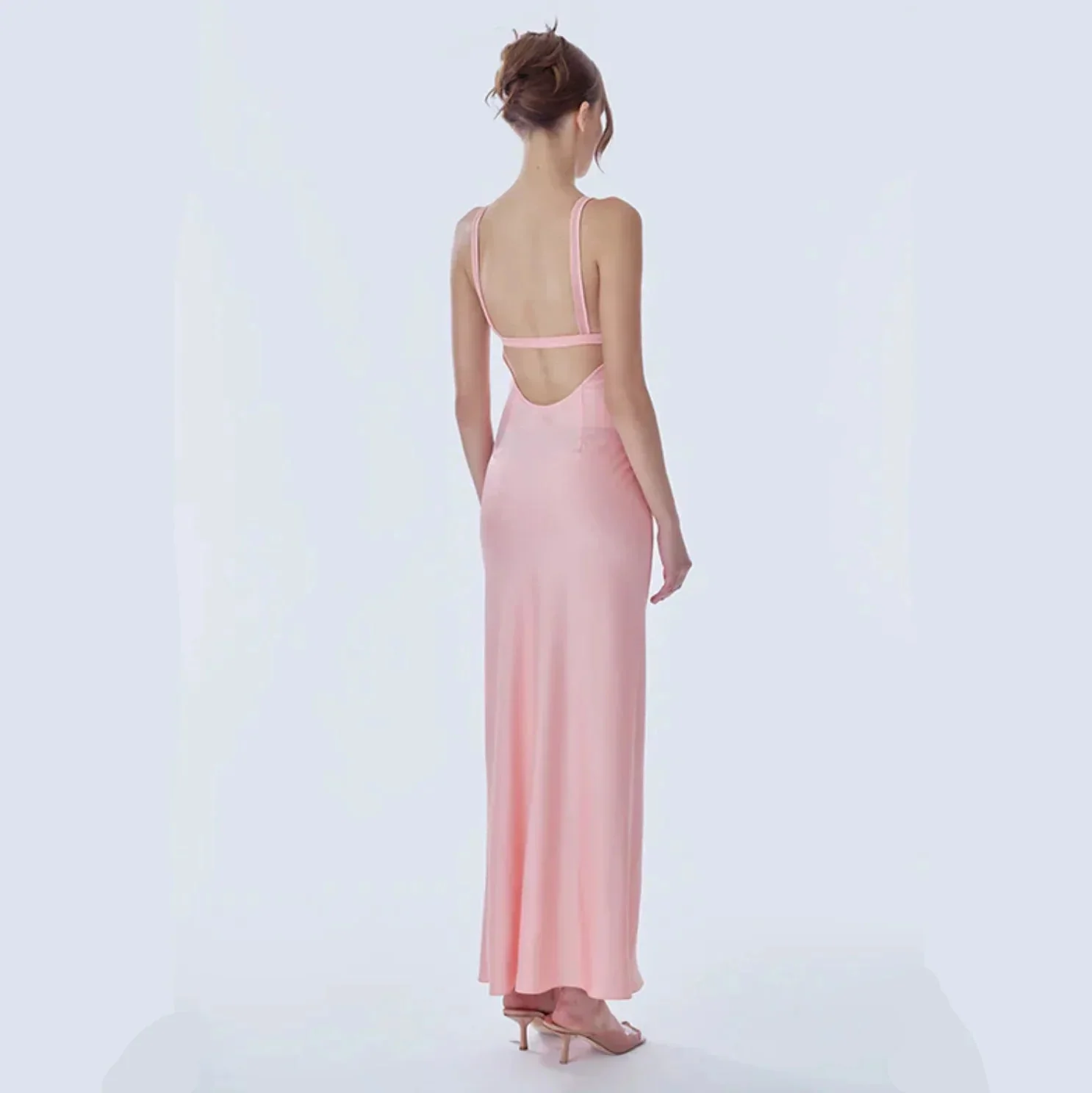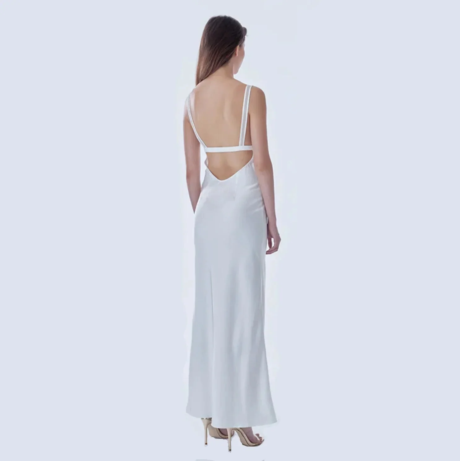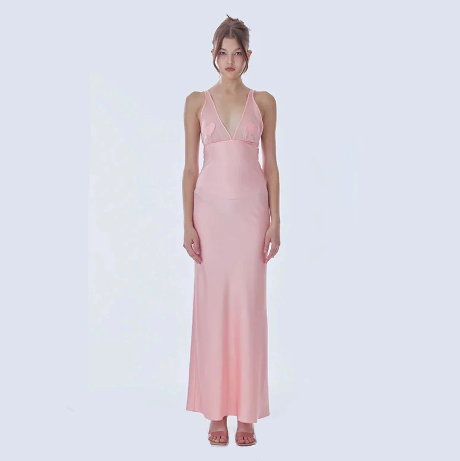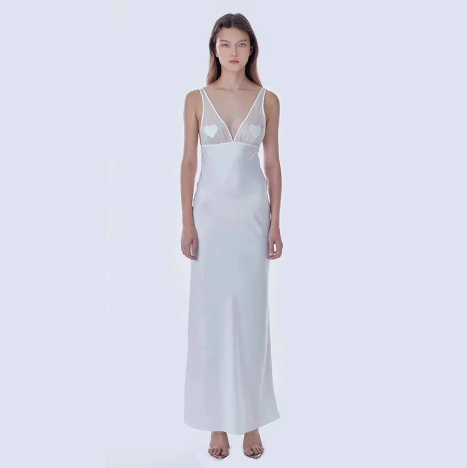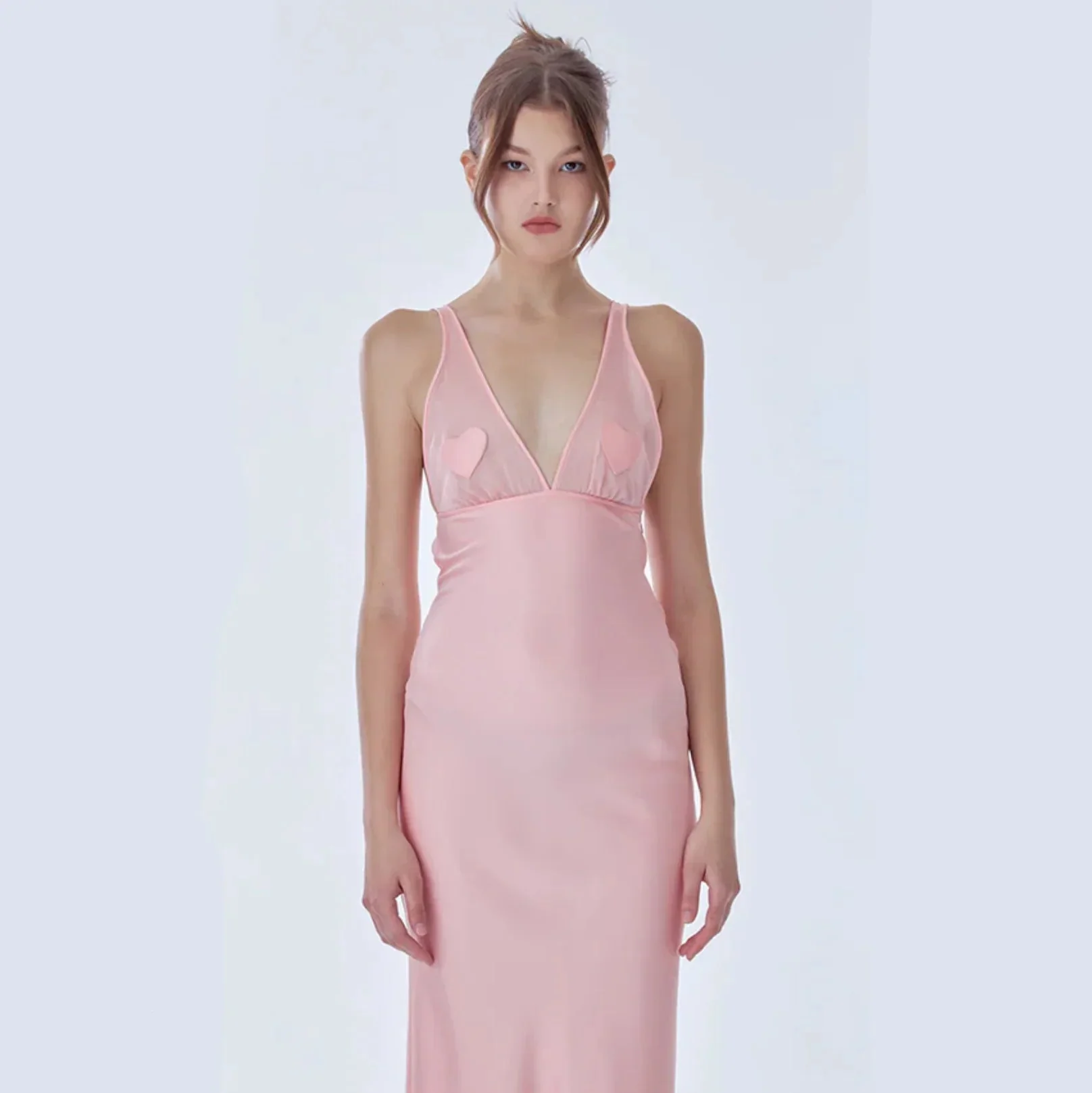 Indulge in romantic allure with our exquisite Satin Mesh Maxi Dress. Crafted from premium satin, this bias-cut dress offers a flattering, body-skimming fit. Delicate heart-shaped appliqués adorn the sheer mesh panels at the bust, adding a touch of intimacy. Designed for candlelit dinners or special occasions, the dress exudes understated drama and sensuality. Dive into luxury with this unlined, full-length silhouette that whispers elegance. Discover your perfect fit. Free size exchange available.