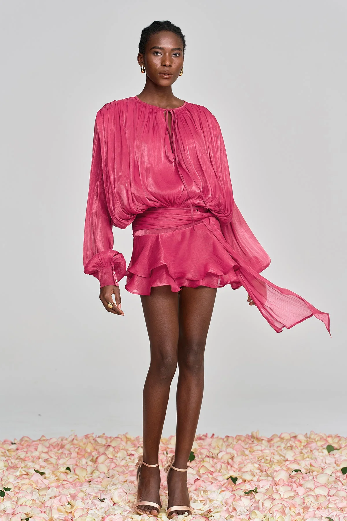 Elevate your style with the Aminah Balloon Sleeve Ruched Mini Dress in Rose Red. Crafted from a blend of 50% Polyester and 50% Cotton, this dress offers a slight stretch for optimal comfort. The delicate ruched ruffle details and balloon sleeves exude elegance, making it a perfect choice for any special event. This dress drapes beautifully on the body and is ideal for creating a romantic, coquette look. For care, gently machine wash. Please note that color may vary slightly due to lighting in images.