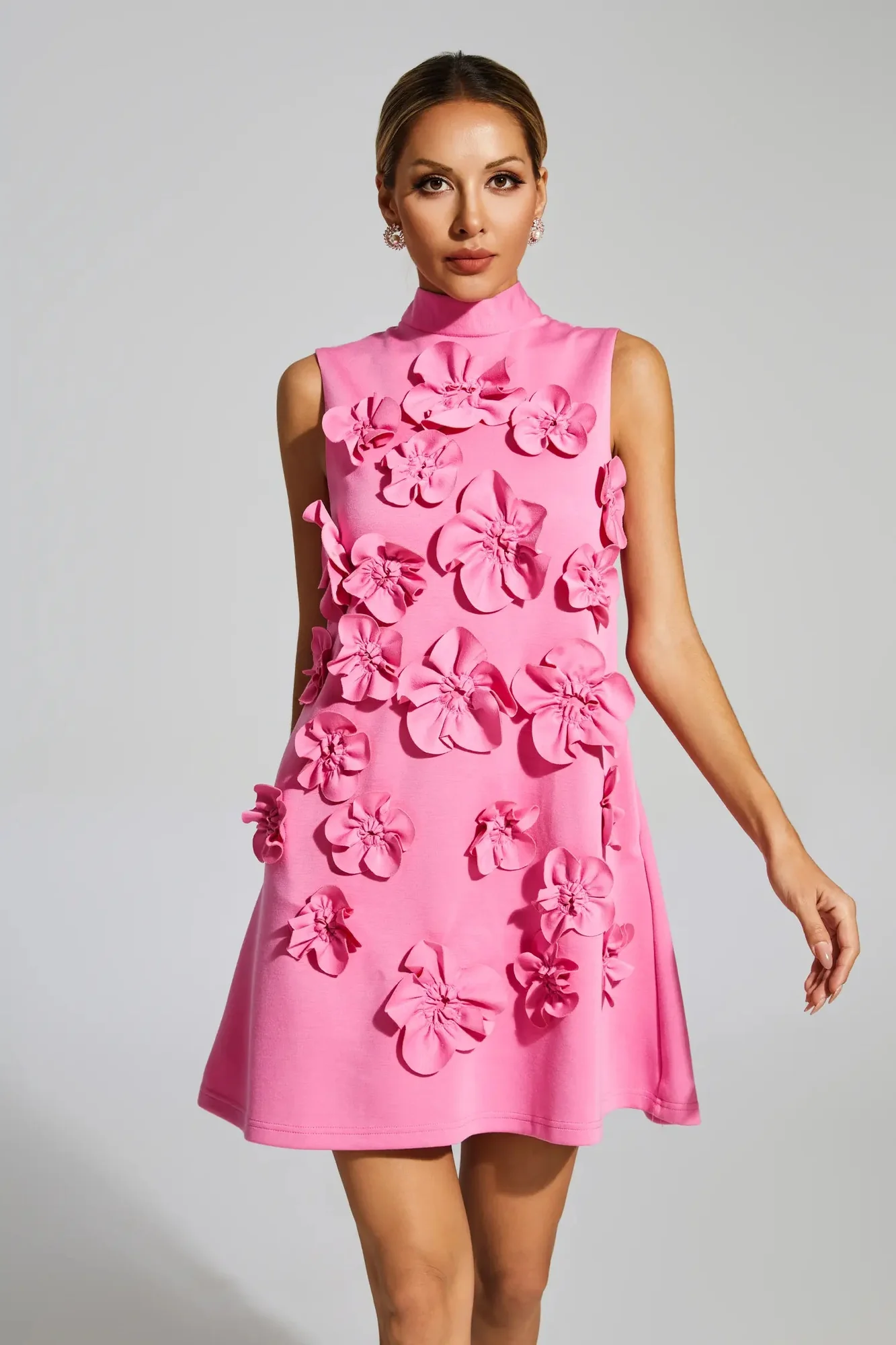 Discover the enchanting allure of the Rose Red Flower Mini Dress. This beautifully crafted dress exudes elegance with its stunning rose flower pattern and striking rose red color. The high neck and tie-waist detail add a fashionable touch, making it a perfect blend of sophistication and trendiness. Enjoy the sleeveless design for a chic look. Made of high-quality polyester, the dress is approximately 90cm long and requires gentle dry cleaning. Available in sizes S to XL, this charming dress runs true to size. Embrace a captivating style that will surely turn heads wherever you go.