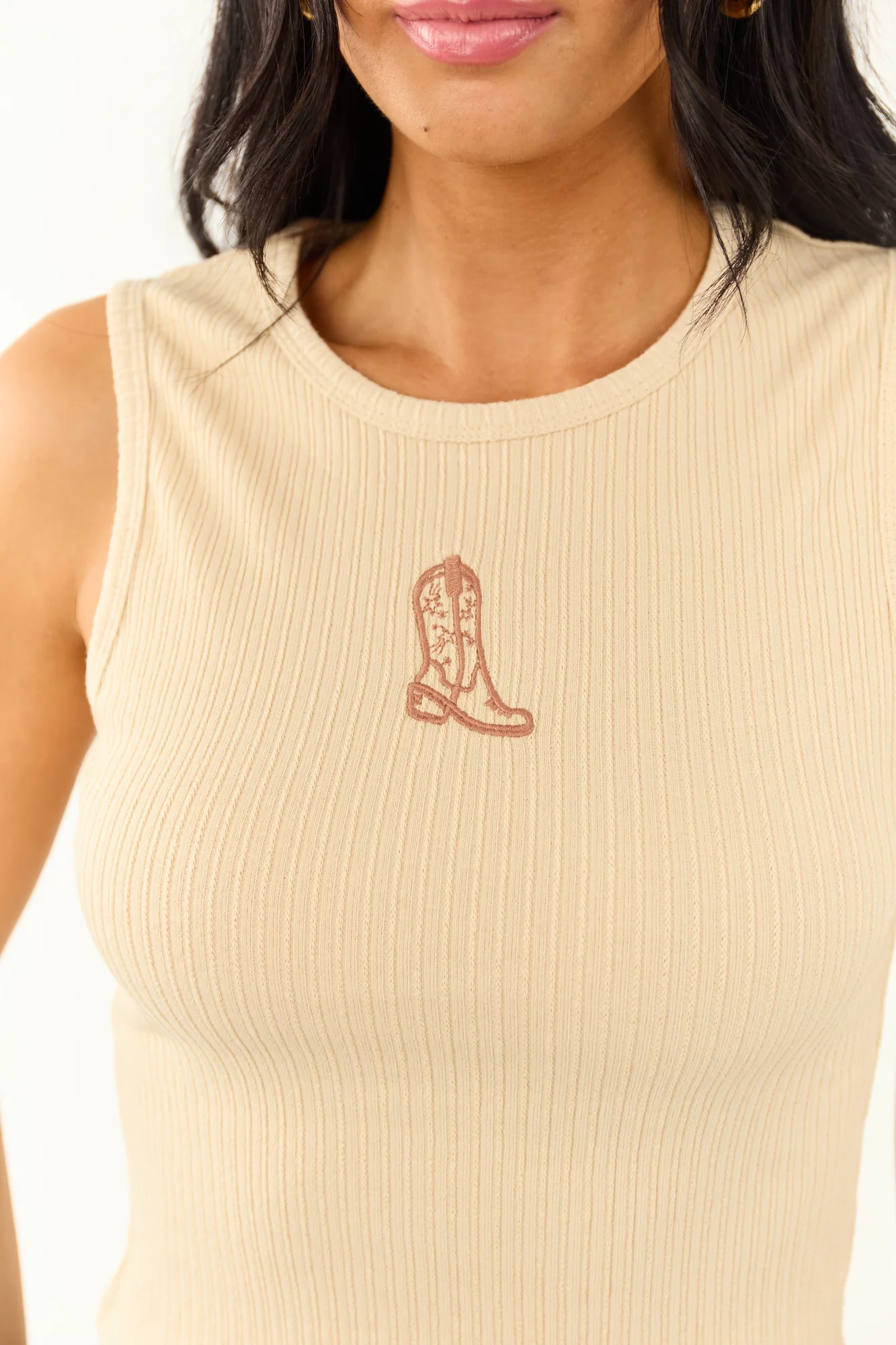 Add a touch of Western flair to your wardrobe with this Rose Taupe embroidered cotton tank top. Made of stretchy ribbed knit for a comfortable fit, this semi-cropped top features intricate embroidery detail. Perfect for casual outings or layering, this tank top is ideal for versatile styling. Available in XS, S, M, and L sizes. Bust measurements range from 26″ to 32″, length varies from 18″ to 19″, and straps are 2.75″ to 3.5″ long. Crafted from 100% cotton. Imported.