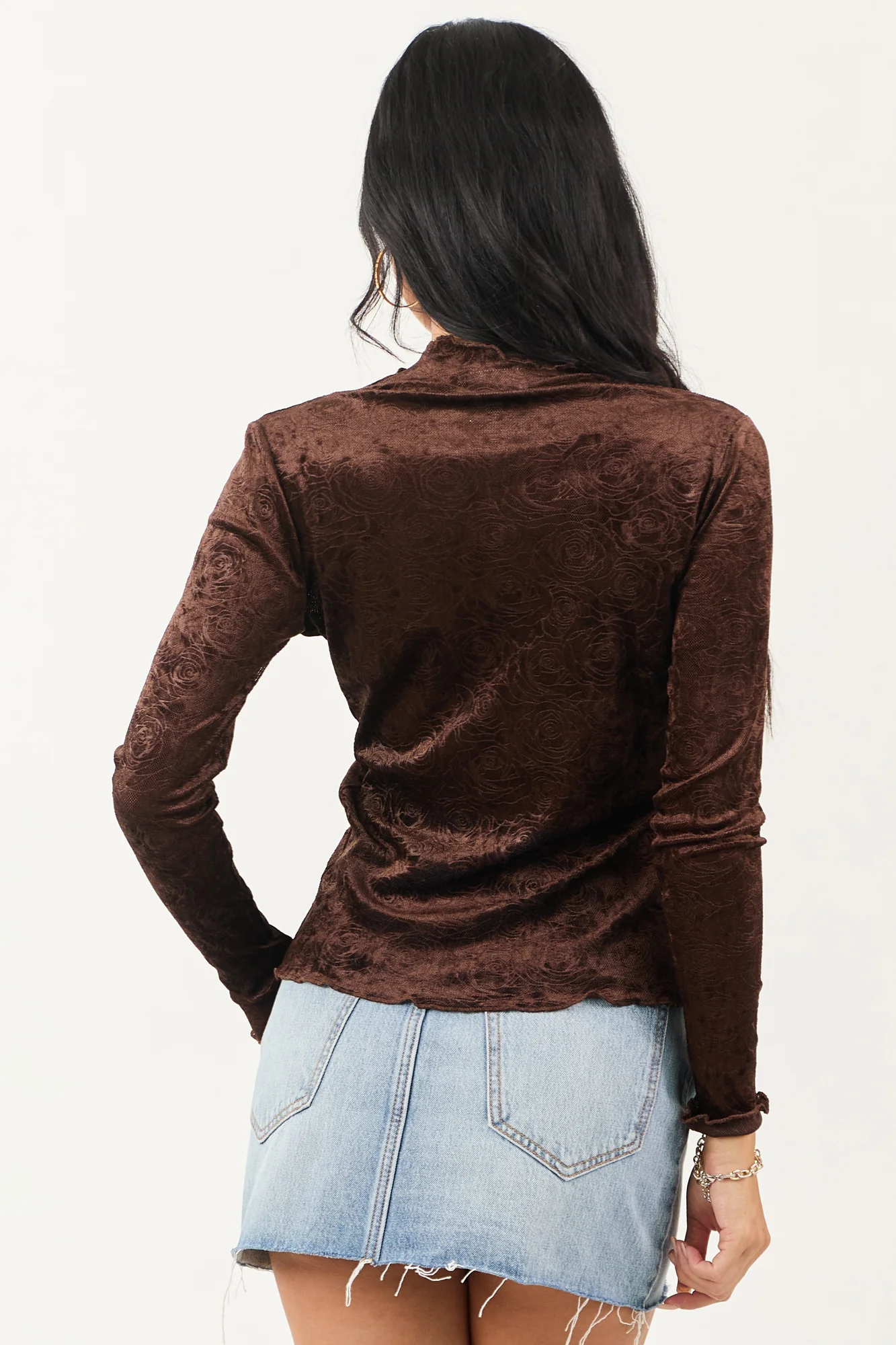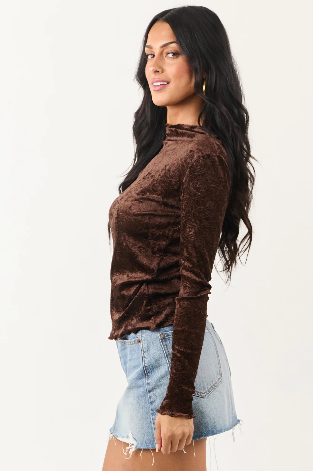 Indulge in retro romance with this sultry yet sweet cocoa-colored mesh top. The velvet-textured rose pattern adds a touch of elegance to the sheer mesh, complemented by stretchy textured knit for a perfect fit. Featuring a mock neckline and lettuce trim, this top is a must-have for your wardrobe. Made of 95% Polyester and 5% Spandex. Available in sizes S, M, and L. Imported.