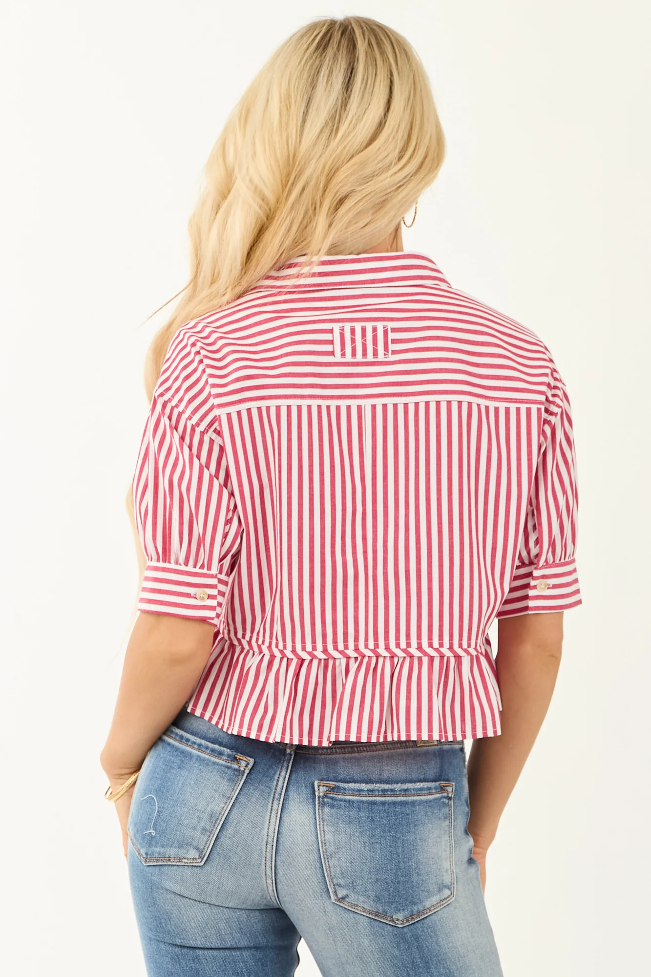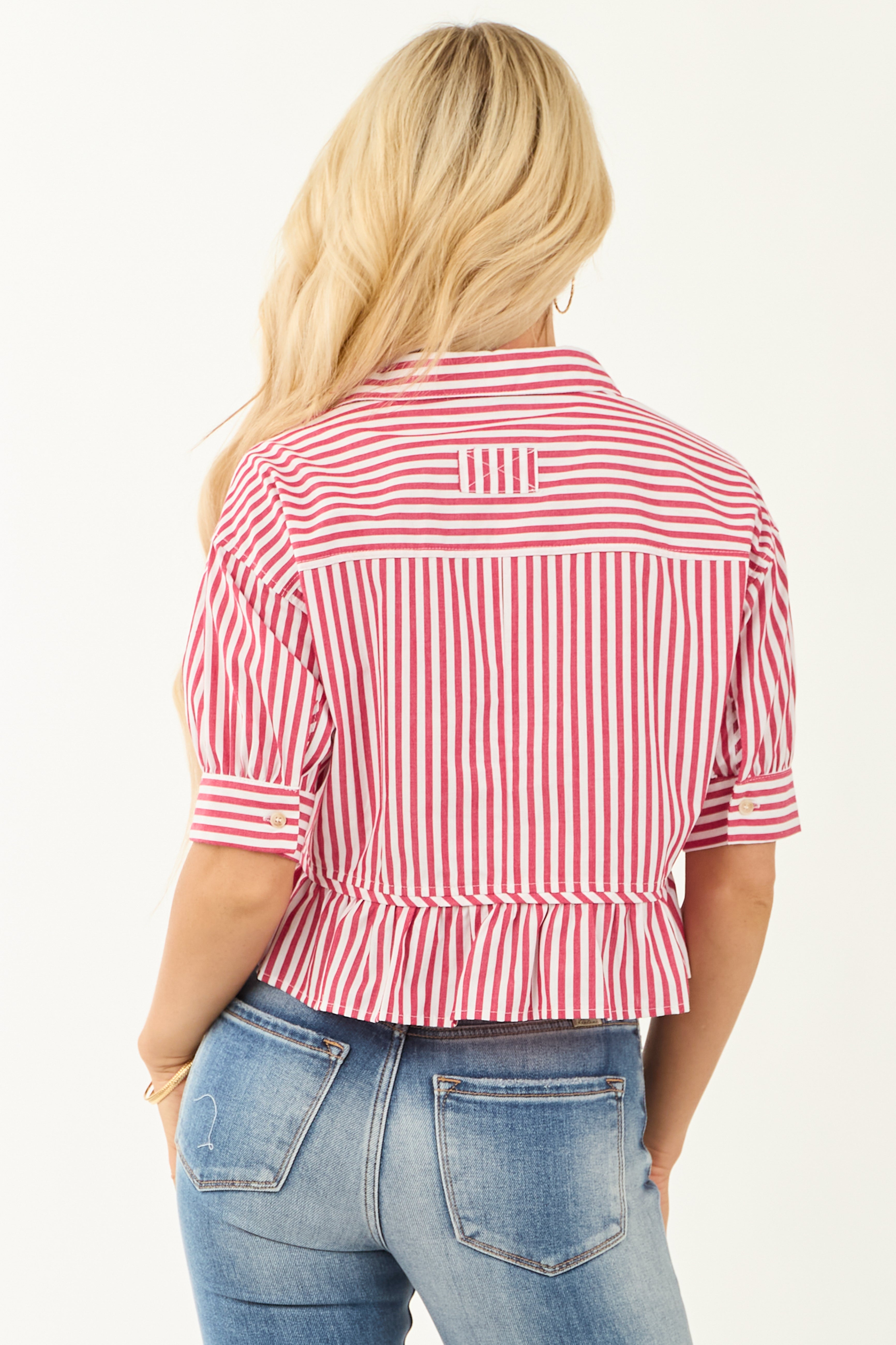 Kick off your day in style with this crisp and chic Ruby Striped Button Down Top! Featuring an oversized fit with a flattering banded cuffs design, this top is made from 100% Cotton fabric for a comfortable wear. It includes a collared neckline, chest pocket, ruffle hemline, drop shoulder, and is unlined for a light feel. Perfect for various occasions. Available in sizes S, M, and L.