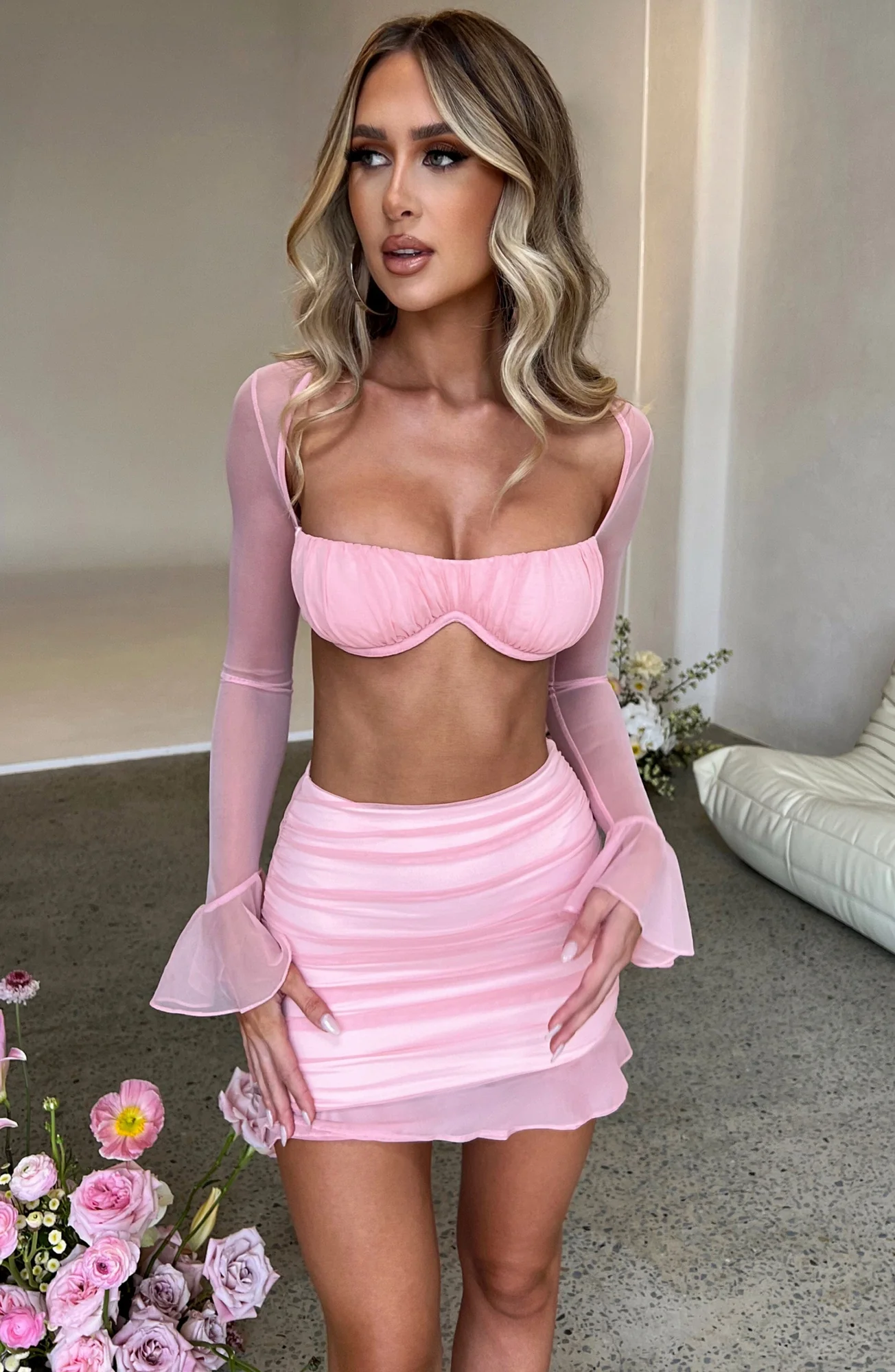 Experience the ultimate in comfort and style with our Ruched Blush Mesh Mini Skirt. Constructed from premium power mesh with superior stretch, this mini skirt is designed to mold beautifully to your curves. The high waist fit and double-layered fabric provide both support and a flattering silhouette. Complete with charming ruched details and a delicate frill at the hem. Pair it with the matching Maisie crop top and your favorite heels for a sophisticated yet playful look. Color: Blush. Material: Soft Power Mesh with Stretch. Fit: High Waist, Mini Length. Model Size: XS.
