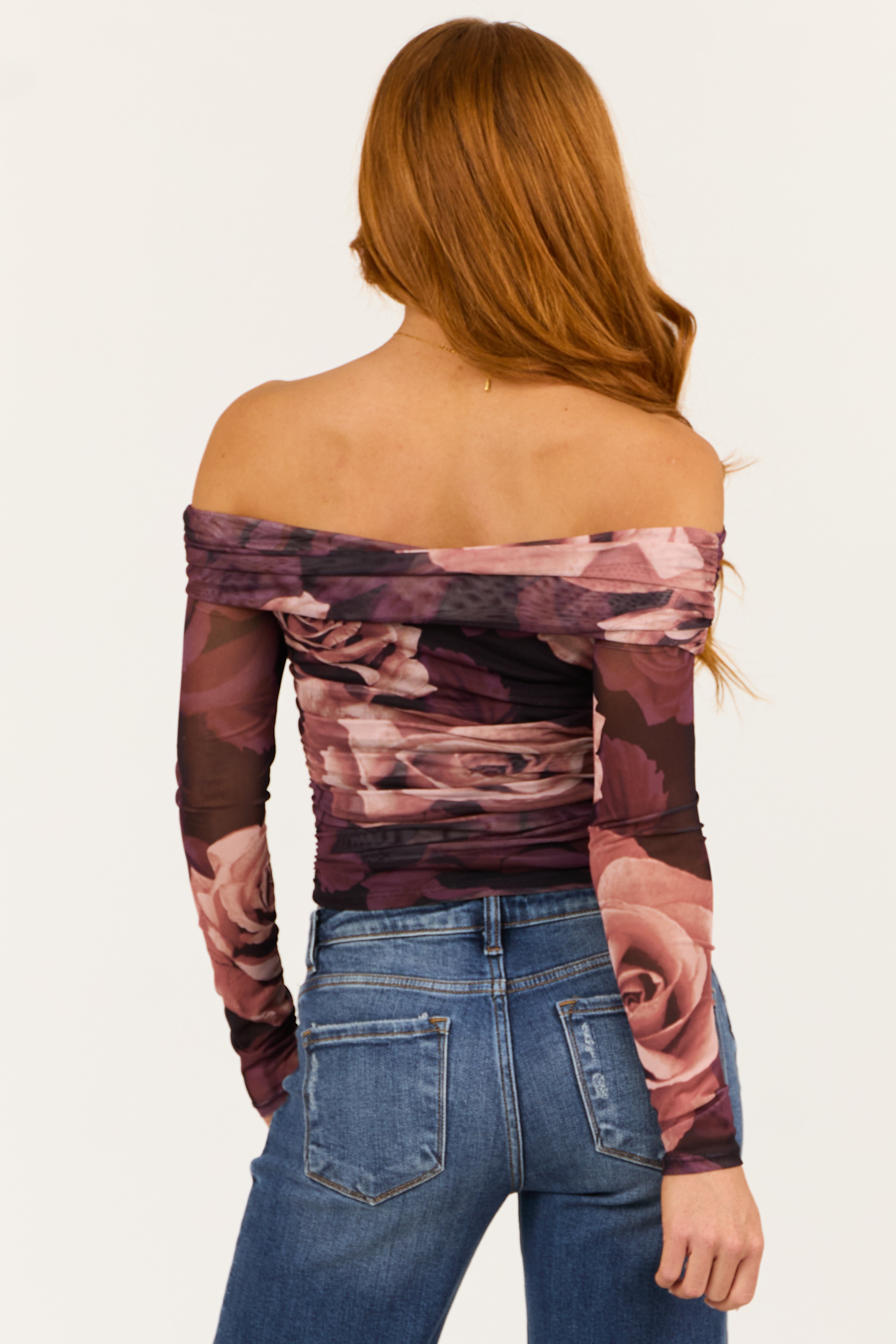 Elevate your wardrobe with our stunning Eggplant Floral Print Crop Top. Crafted from stretchy mesh in shades of Eggplant, Black, Blush, Dusty Rose, and Plum, this top features an elegant off-shoulder design with a fold-over neckline. The ruched sides and torso lining ensure a flattering fit. Perfect for various occasions, this top is a versatile addition to your closet. Handcrafted in the USA from 96% Polyester and 4% Spandex with a 100% Polyester lining. Embrace individuality as each piece may vary slightly in print placement due to the cutting and sewing process. Model is wearing size Small. Models measurements: Size 1, Height 55, Bust 33, Waist 24.