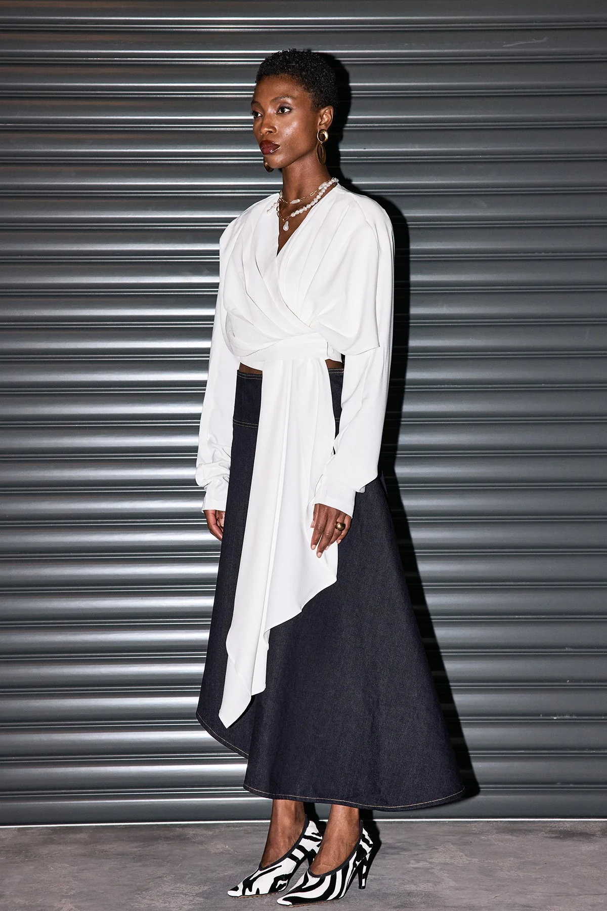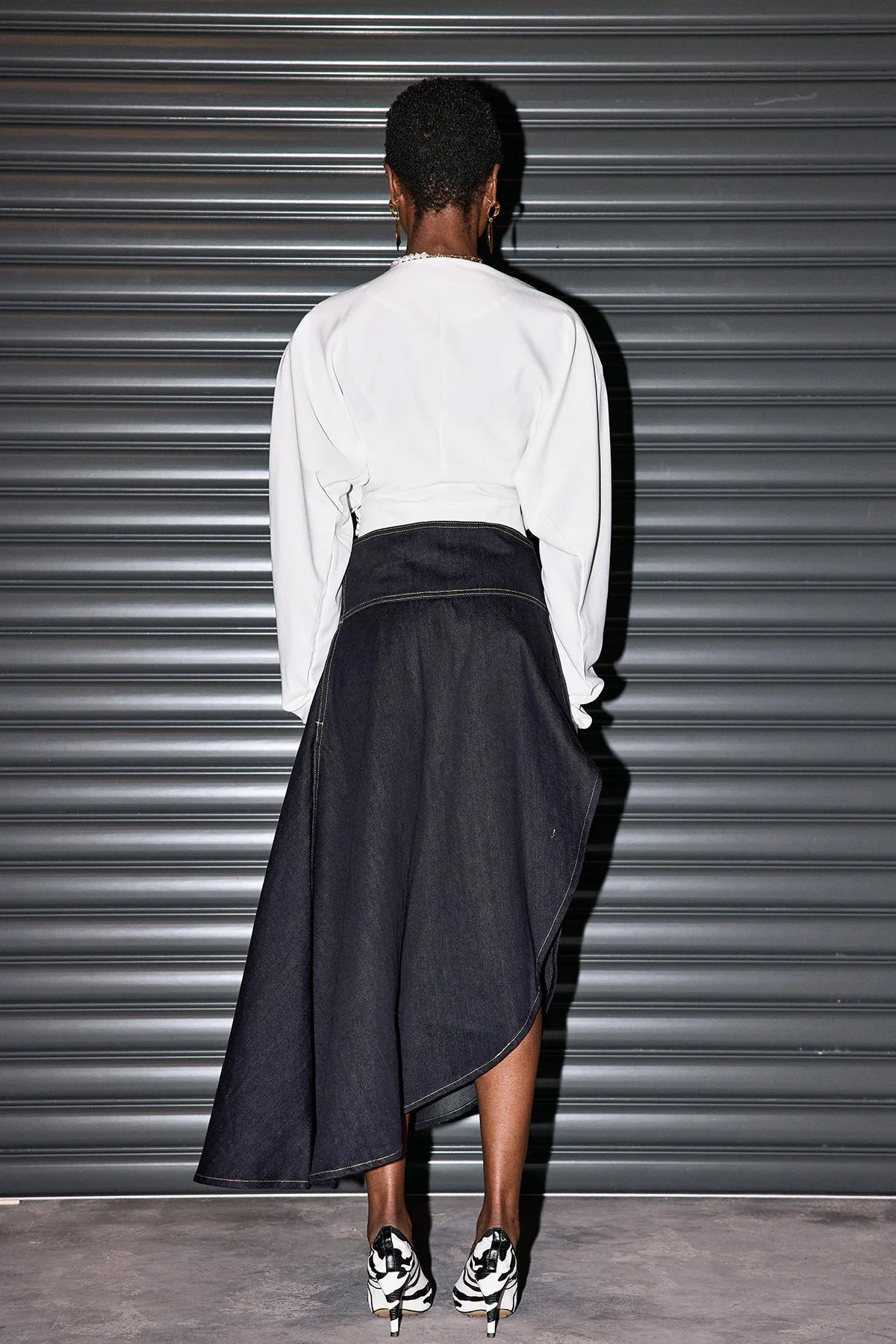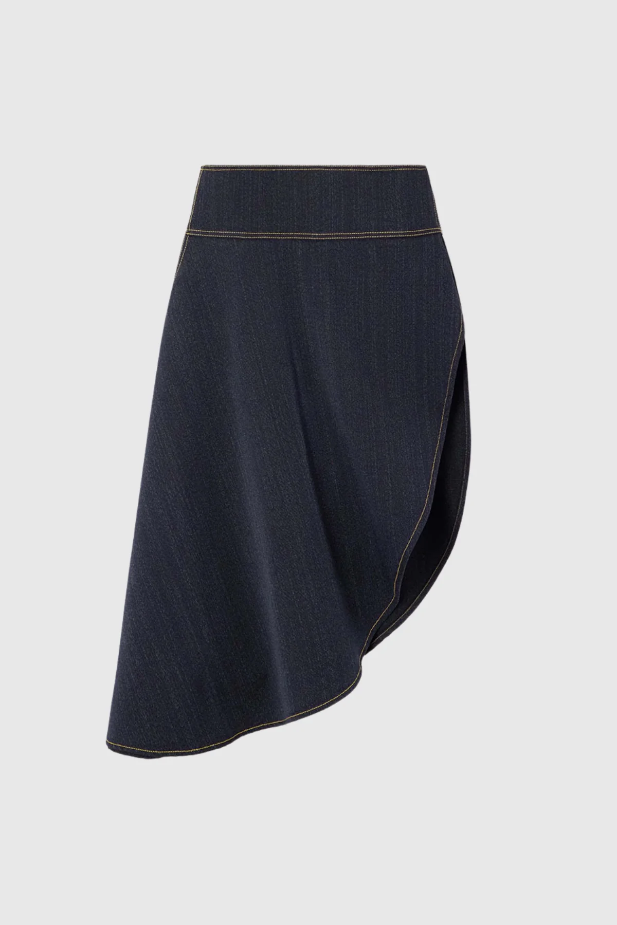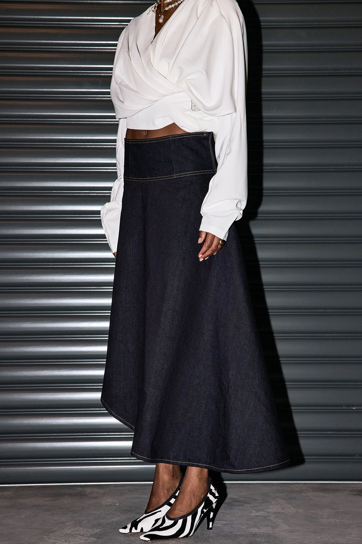 Elevate your fashion with the Ruffle Asymmetric Denim Skirt. Made of high-quality denim, this chic piece features a ruffled hemline and playful elegant design. Crafted for comfort and durability, this skirt is a must-have addition to your wardrobe. Enjoy the unique style and versatility it brings to your outfits. Available in classic black and varying color shades due to lighting.