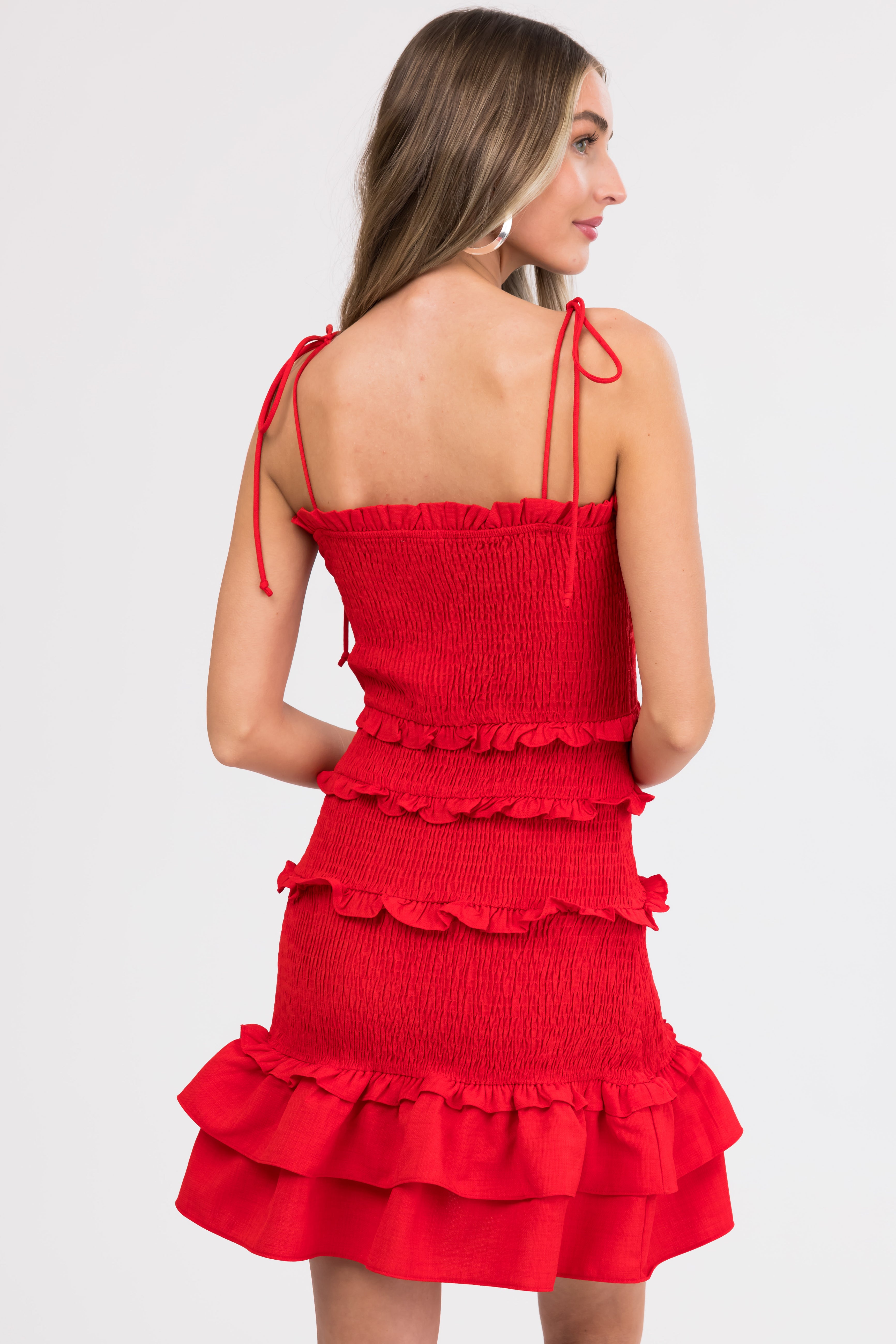 Experience elegance and charm with our Ruffle Sleeveless Square Neckline Red Dress. This stylish dress comes in sizes small, medium, and large, featuring adjustable self-tied straps, smocked elastic material, and ruffle tiers. The non-stretchy woven fabric fits true to size, offering a flattering silhouette. Perfect for dates or daytime outings in spring or summer. Hand wash cold for lasting beauty. Model is 58″ tall, wearing size Small.