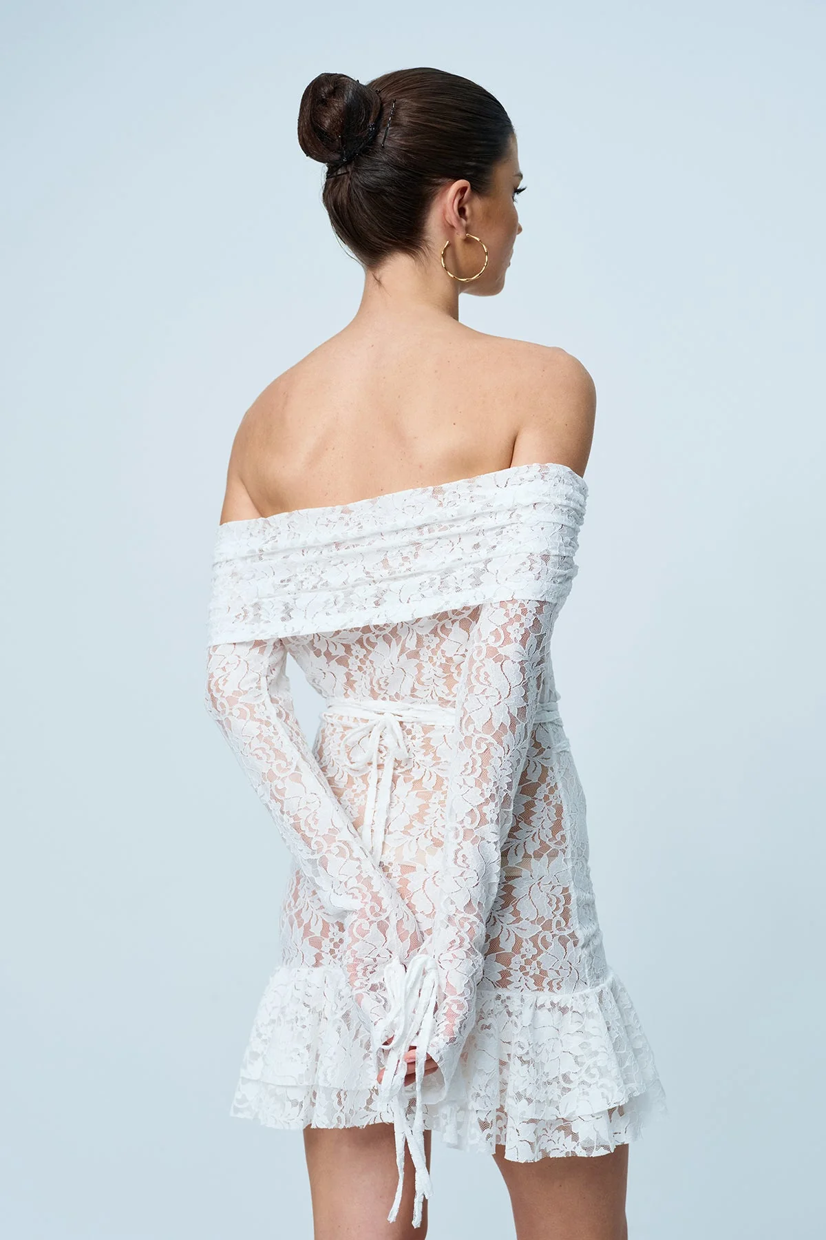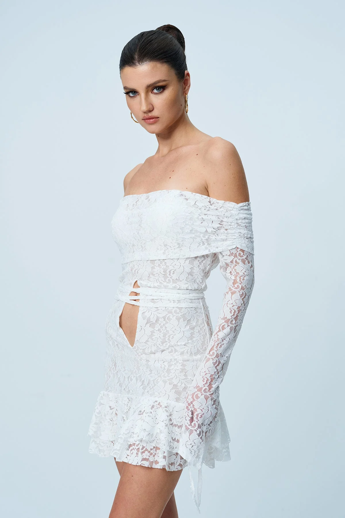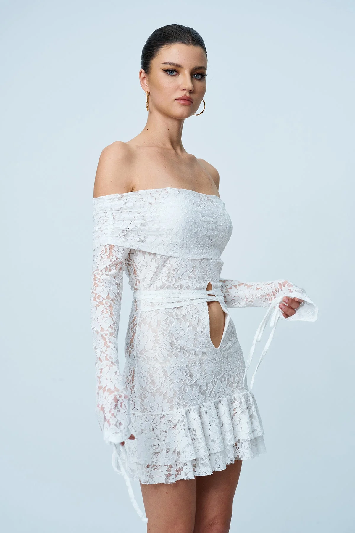 Indulge in elegance and charm with our exquisite Ruffled Lace Up Cutout Mini Dress in White. This stylish and sophisticated dress features delicate lace, a ruffled design, and a captivating lace-up cutout for a touch of allure. Perfect for any special occasion, it offers a stretch factor of non-stretch and is easy to clean with a gentle machine wash. Please note: color may vary due to lighting effects in images.