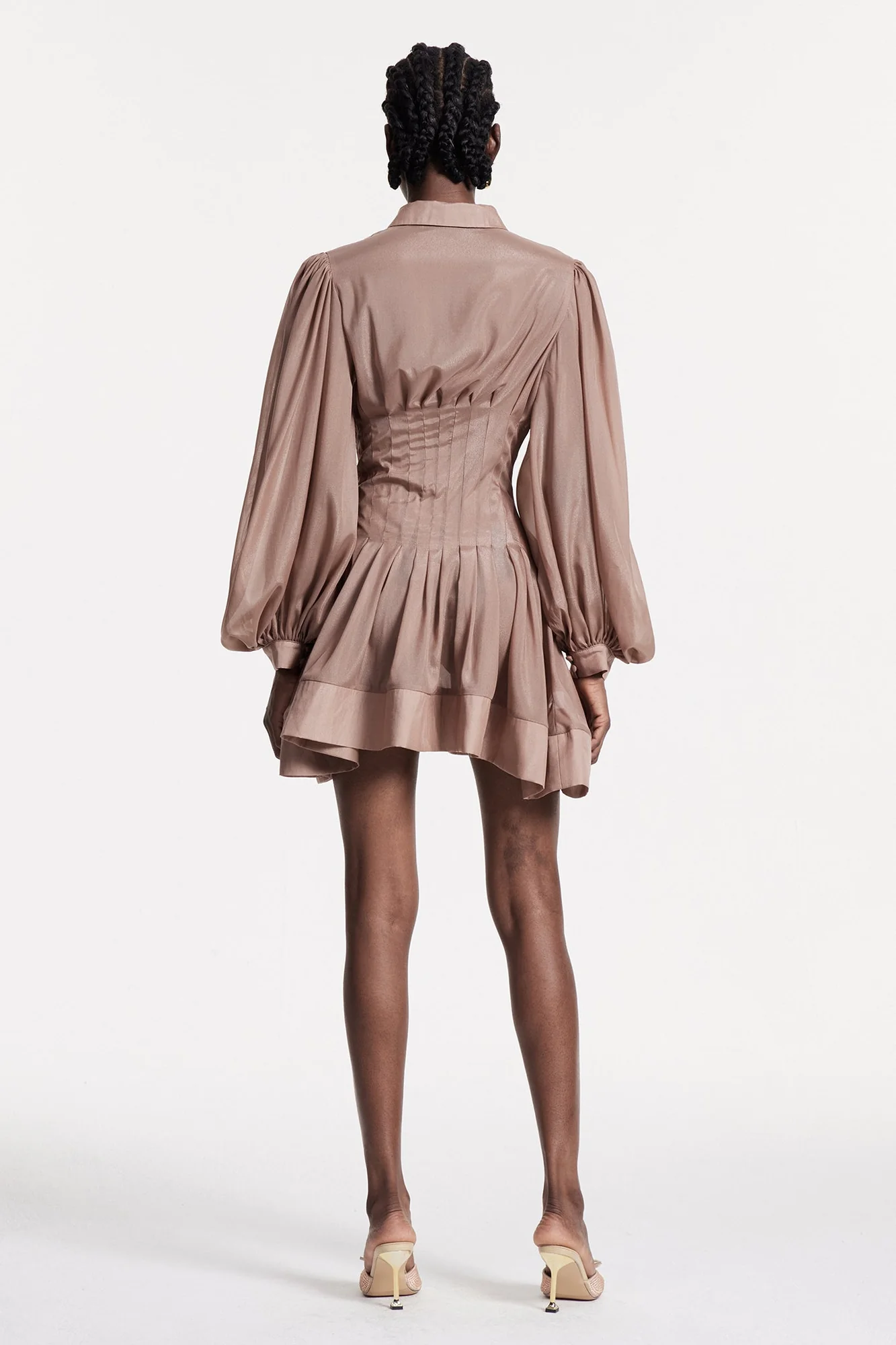 Experience the perfect blend of tailored sophistication and playful detailing with our Ruffled Mini Shirt Dress in brown. This chic essential features delicate ruffle accents, enhancing movement and exuding feminine charm. Whether youre headed for a casual outing or a sophisticated event, this dress offers a chic, effortless style that elevates your wardrobe. Crafted with a flattering mini silhouette, this dress is a must-have for the fashion-forward individual. Our dress is non-stretch and can be gently machine washed. Please note, color may vary due to lighting during photography.