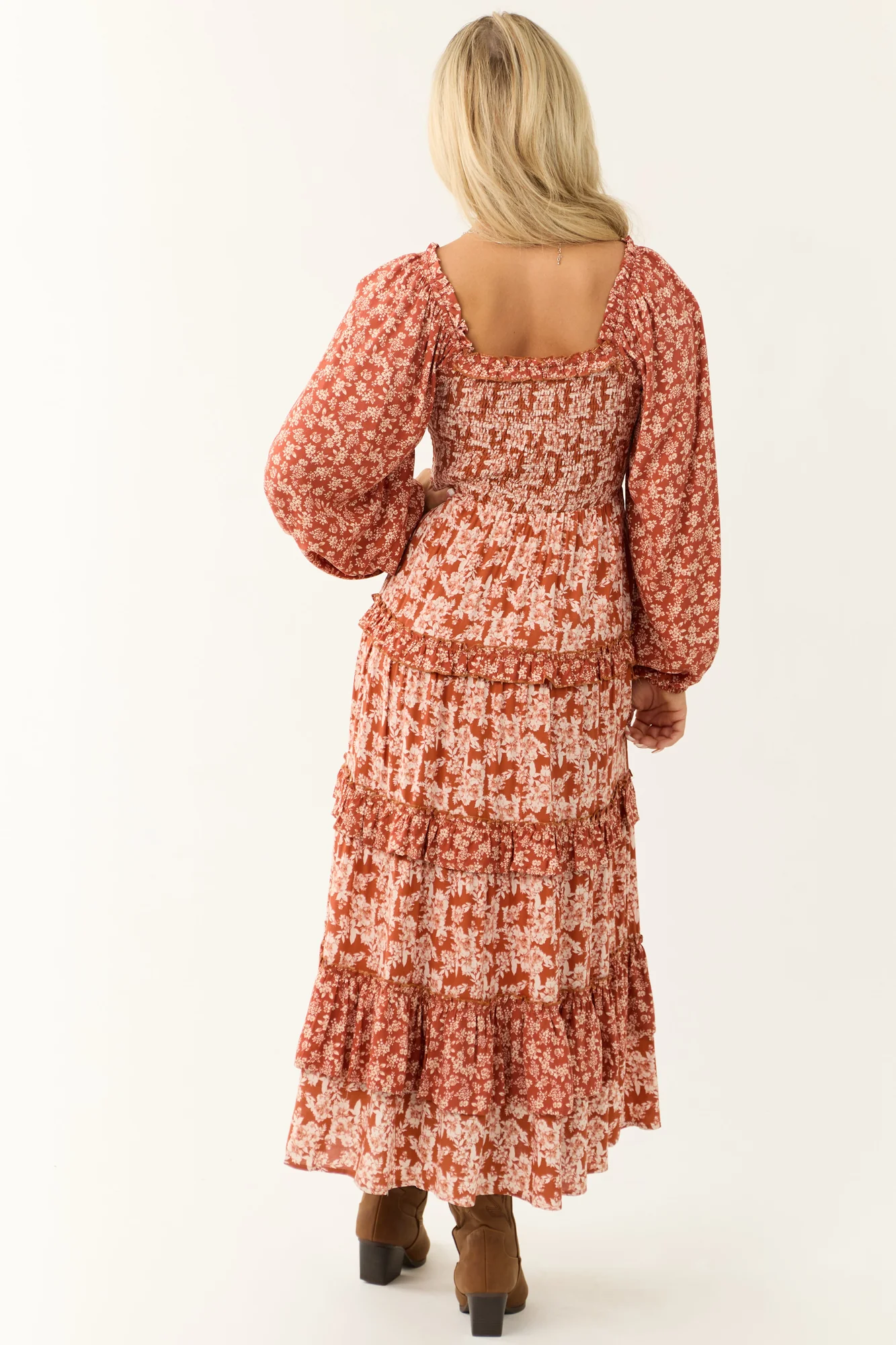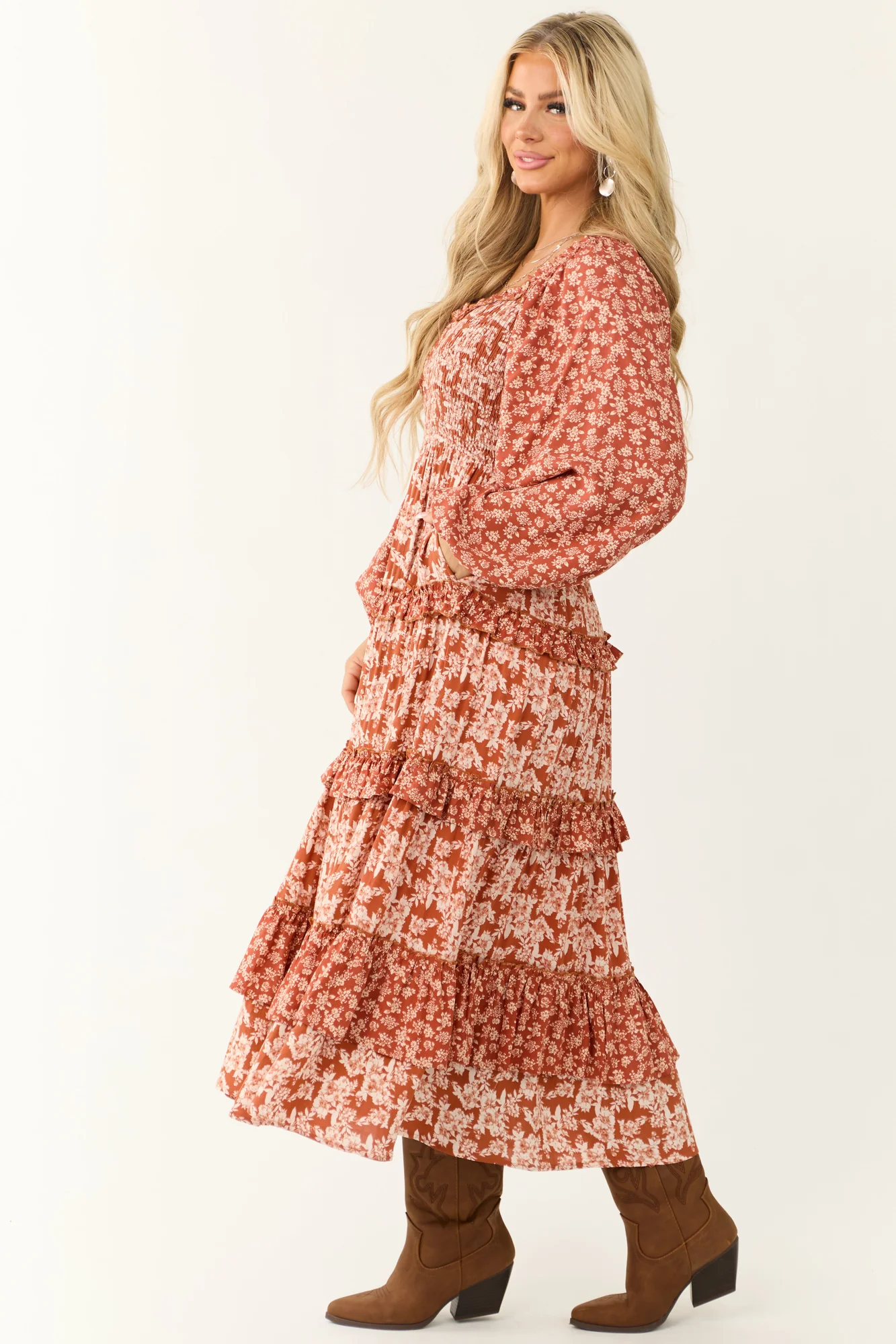 This rust floral maxi dress boasts a flowy fit and an elastic neckline for comfort. Made of non-stretchy woven fabric in shades of rust, cream, and sunrise. It features long sleeves, side pockets, and a smocked top. Perfect for casual or daytime occasions. Self and Contrast: 100% Rayon; Lining: 100% Polyester. Hand wash cold, line dry. Enhance your wardrobe with this stylish piece!