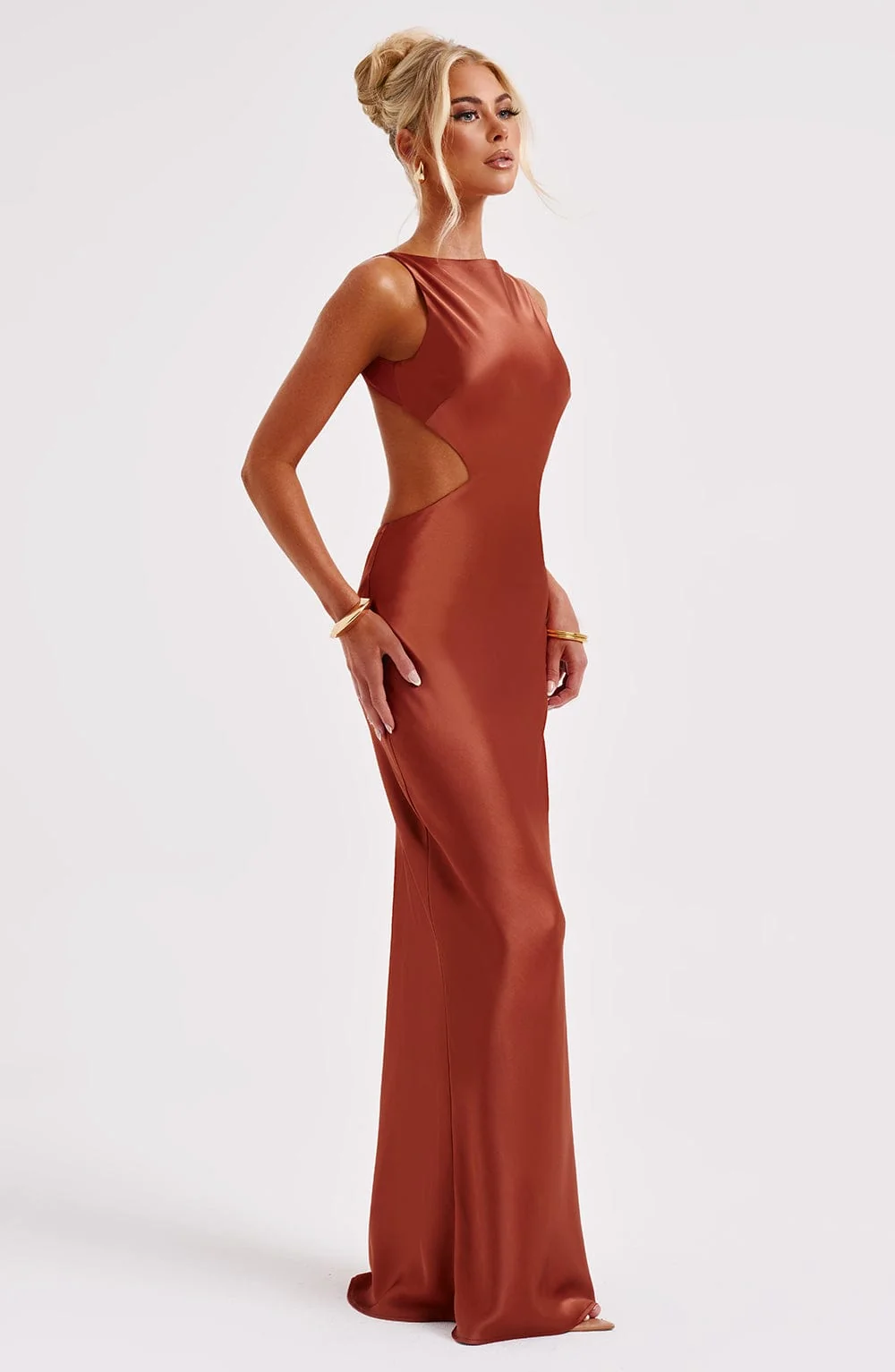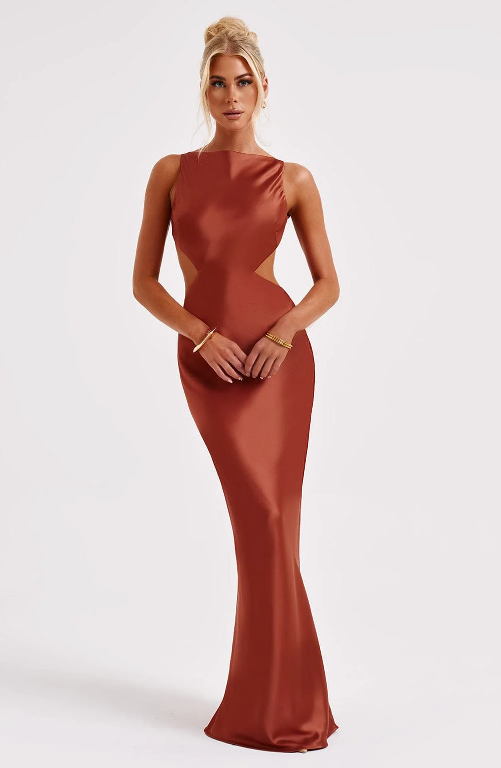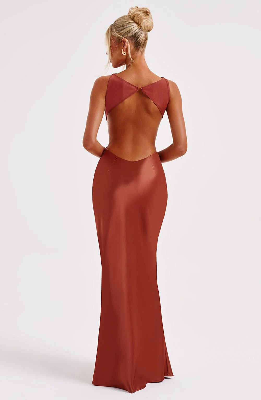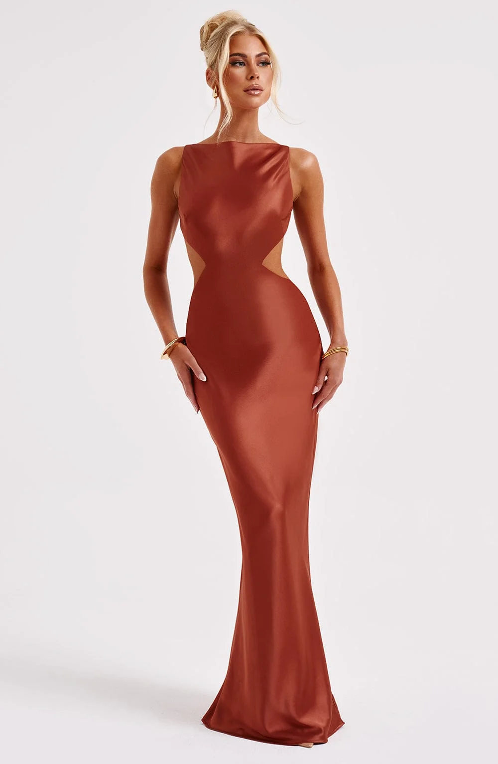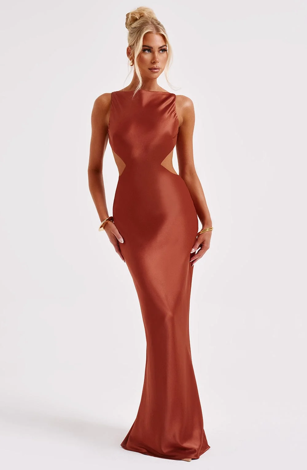 Elevate your style with the Rust Satin High Neck Maxi Dress from M.T. This premium bias cut satin dress drapes elegantly over your figure for a dreamy silhouette. Featuring a modern high neckline and a flattering cut-out back design, this dress exudes sophistication. Perfect for various occasions, style it with platforms for a glamorous look. The maxi length adds an extra touch of elegance. Made for comfort and style, this dress is a must-have in every fashion-forward wardrobe. Available in sizes XS to XXL.