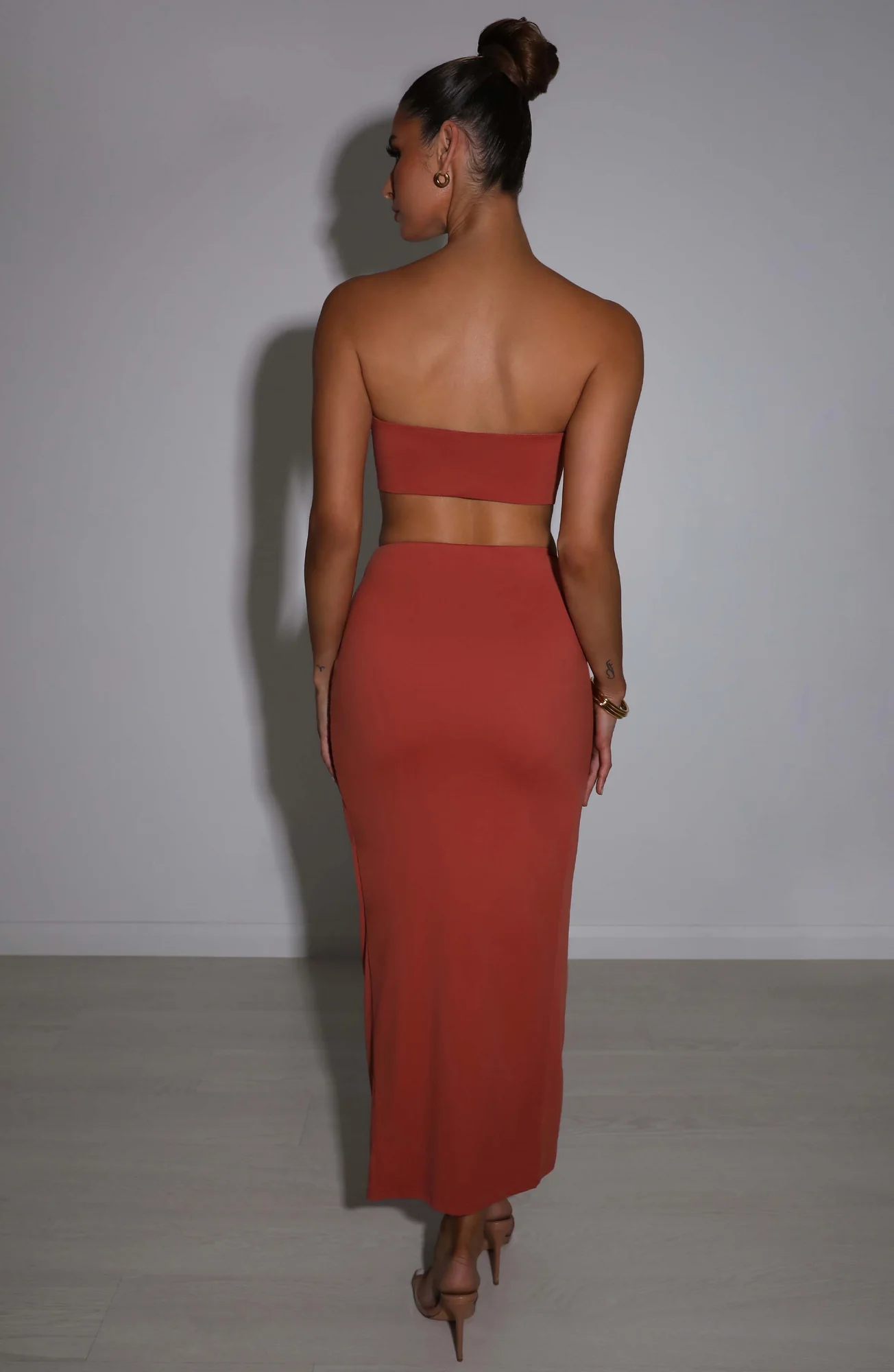 Elevate your style with our Rust Twist Front Maxi Skirt made from premium stretch jersey for a body-contouring fit. This double-layered skirt features a thigh-high split and twist front detail, molding beautifully to your figure. Perfect for evening outings or holiday events. Pair with the matching Zeilie bandeau top for a stunning look. Slip-on design with no closures. Material: Polyester Spandex. Length: Maxi. Color: Rust.
