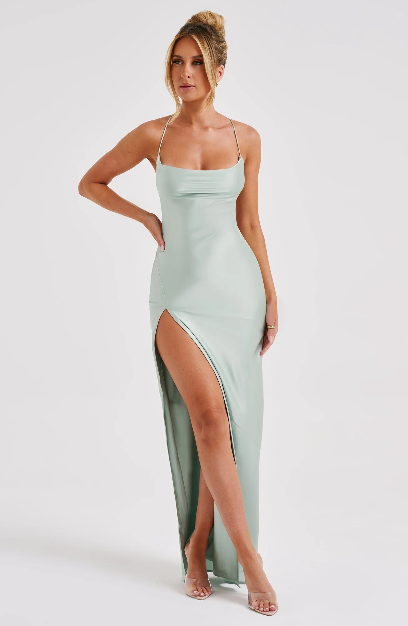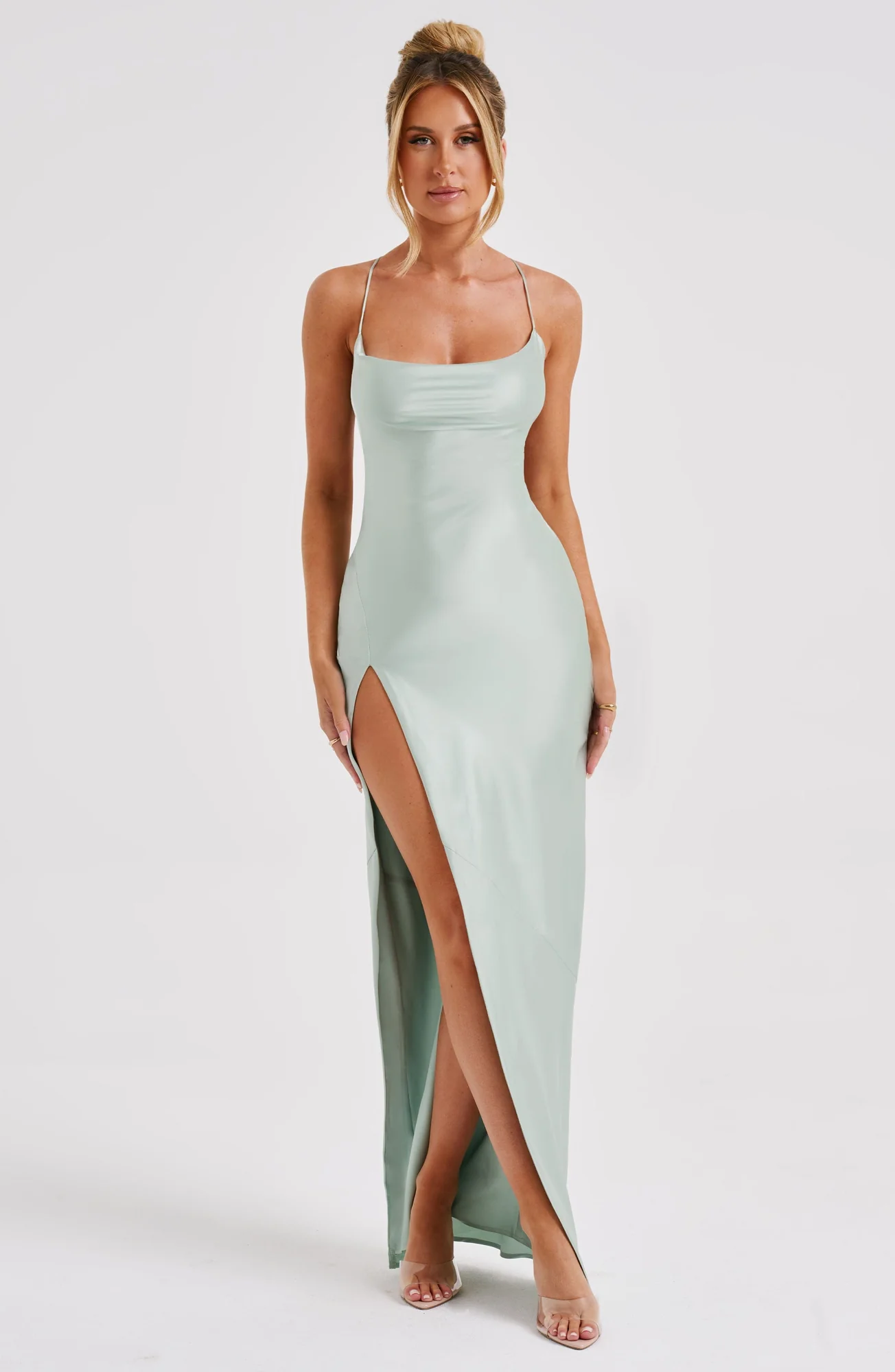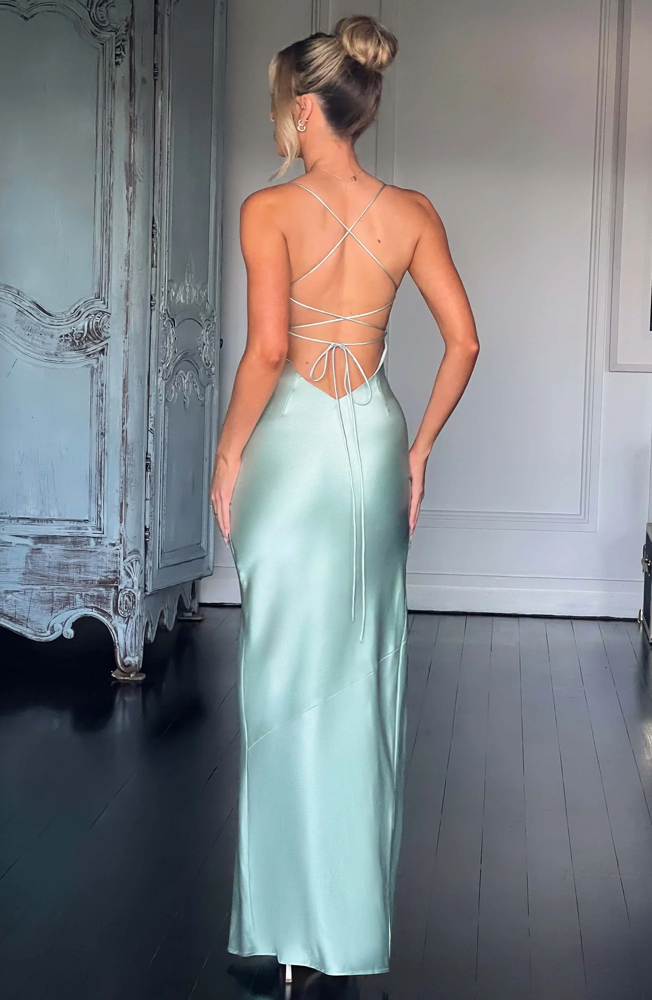 Indulge in luxury with our Sage Bias Cut Satin Maxi Dress. Crafted from premium stretch satin, this dress drapes elegantly over your curves while offering a lustrous sheen. The ultra-low cutout back with crossover straps adds a touch of glamour, perfect for special occasions. Fully lined, with a thigh-high split for movement, this gown exudes sophistication and grace. Embrace the night in style with this stunning creation in maxi length. Available in sizes XS to XXL.