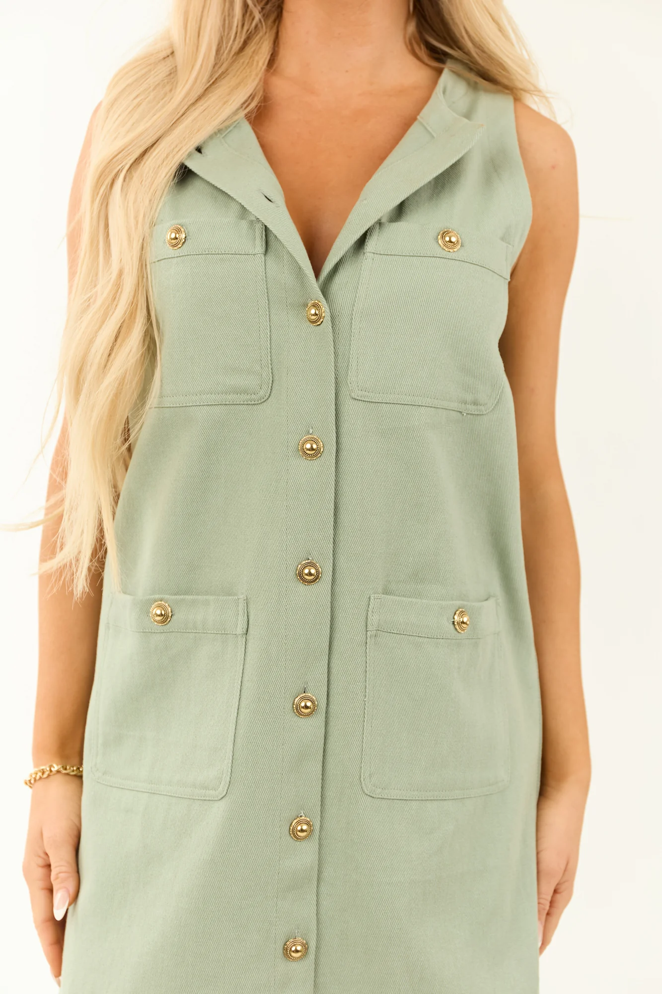 Step up your style game with this groovy denim shift mini dress that adds retro magic to any outfit. Made of non-stretchy denim, featuring gold-toned buttons, four functional pockets, sleeveless design, and a round neckline. Available in sizes S, M, L to fit your unique shape comfortably. Dress length varies from 33″ to 34″, with strap width of 3″. Perfect for spring and summer, this unlined dress is crafted from 100% Cotton for a cool and breathable wear. Update your wardrobe with this chic dress , a brand known for quality and style. Model is wearing a size Small. Embrace the 70s vibe with this timeless piece!
