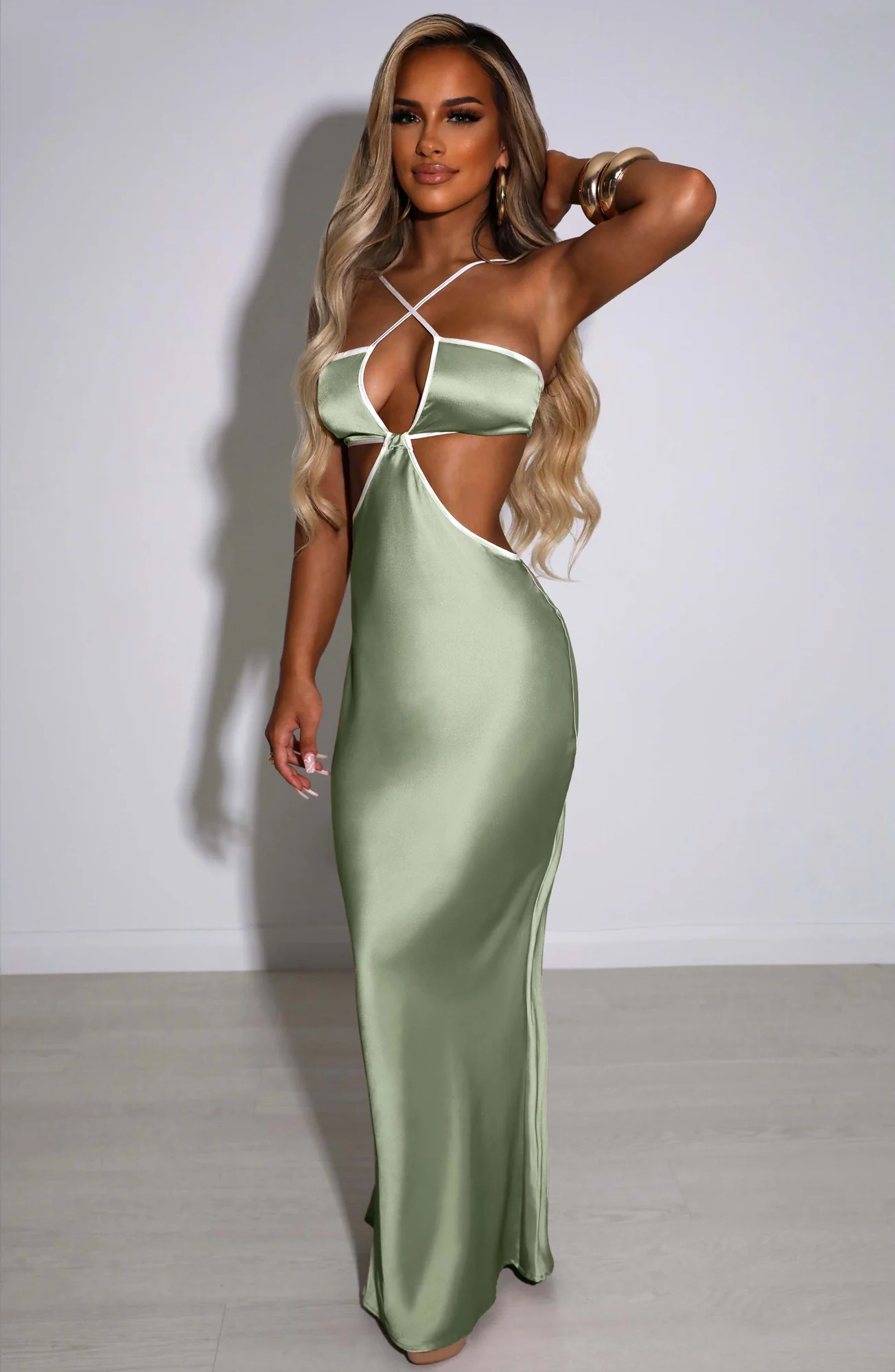 Indulge in the elegance of the Sage Double Layered Maxi Dress with a stylish Criss-Cross neckline, featuring a knot detail at the front, contrast binding design, and a flattering flowy fit. This polyester dress is designed for comfort and style, complete with an invisible zipper and a clasp feature at the back. Elevate your wardrobe with this stunning maxi dress suitable for various occasions. Available sizes: XS, S, M, L, XL.